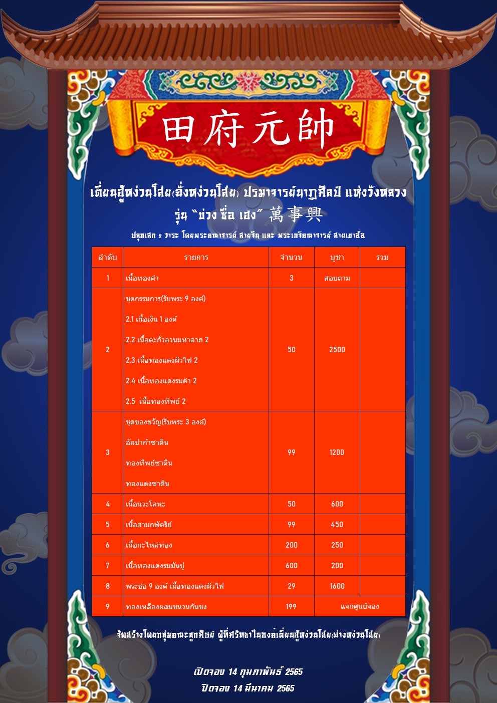 [[[เปิดจอง]]]田都元帥 องค์เตี่ยนฮู้หง่วนโส่ย(ฉั่งหง่วนโส่ย) ปรมาจารย์นาฏศิลป์ แห่งวังหลวง 💥รุ่น “บ่วง ซื่อ เฮง” 萬事興💥 เฮงทุกเรื่อง เฮงทุกทาง เฮง เฮง เฮง องค์เตี่ยนฮู้หง่วนโส่ย ส่วนมากนับถือท่านเป็นเทพแห่งการศิลปะการแสดง โดยมีชีวิตอยู่จริงในสมัยราชวงศ์ถังในสมัยจักรพรรดิถังเสฺวียนจงและเป็นเทพเจ้าจีนที่รู้จักและนับถือมากในประเทศไทย 💥ปลุกเสก 2 วาระ โดยพระคณาจารย์จีน และ พระเกจิคณาจารย์ สายเขาอ้อ 💥จัดสร้างโดยกลุ่มคณะลูกศิษย์ ผู้ที่ศรัทธาในองค์เตี่ยนฮู้หง่วนโส่ย(ฉั่งหง่วนโส่ย) เปิดจอง 14 กุมภาพันธ์ 2565 ปิดจอง 14 มีนาคม 2565