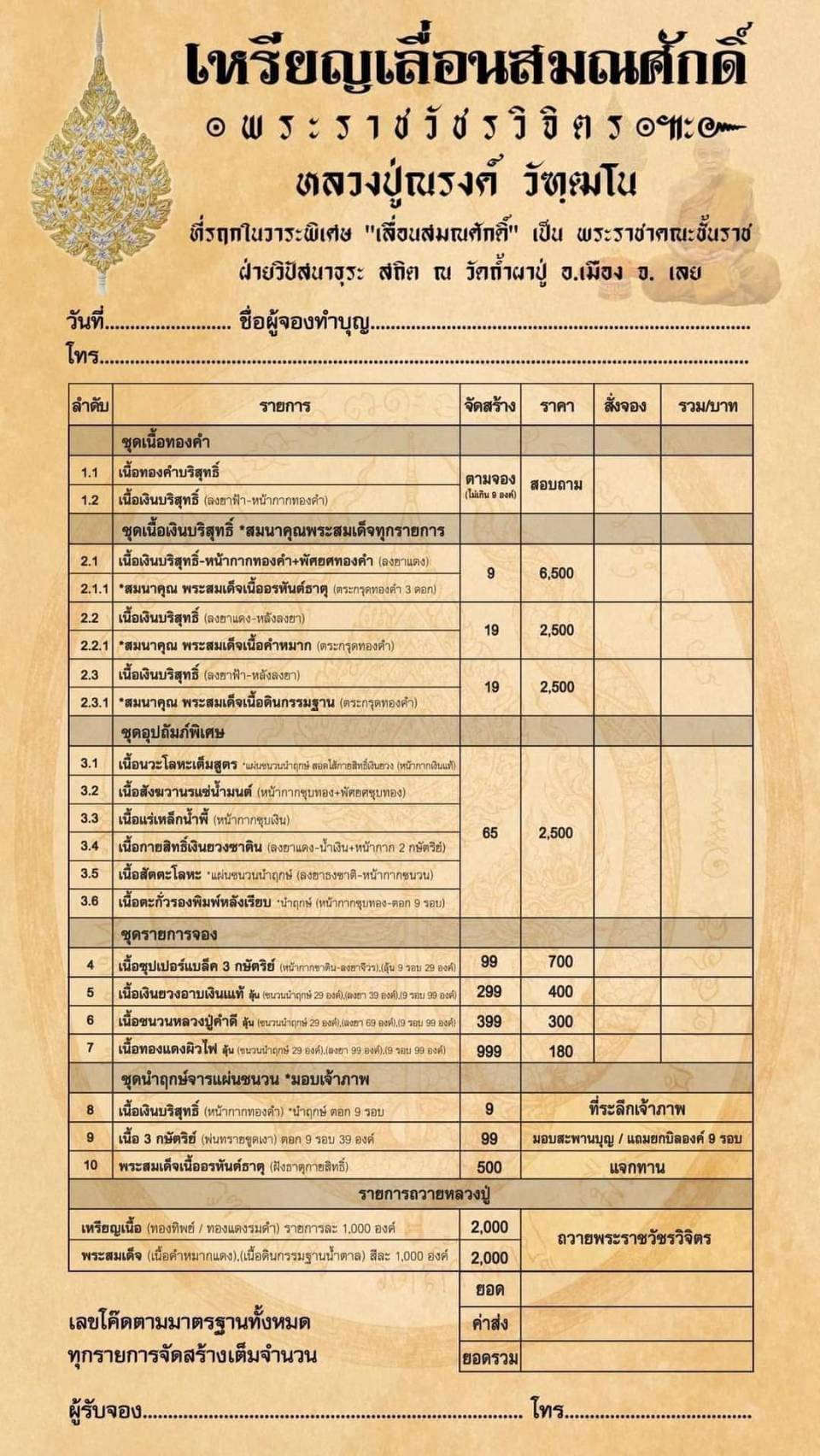 รายระเอียดการ เปิดให้ร่วมบุญ เหรียญ " เลื่อนสมณศักดิ์ " พระราชวัชรวิจิตร หลวงปู่ณรงค์ วัฑฺฒโน วัดถ้ำผาปู่ เมืองเลย * รายการหน้าทองคำจัดสร้าง เพียง 9 องค์ หากมีลูกค้าจอง เกิน 9 องค์ จะนำชื่อทุกคนที่จองจับฉลากเพื่อให้ทุกคนได้รับสิทธิ์ในการจองอย่างเท่าเทียมกัน * รับจองเพียง 2 วัน นับจากวันที่ 8 ( สำหรับรายการหน้าทองคำ ) และ หากได้สิทธิ์ในการจองแล้วต้องชำระเงินครึ่งนึงก่อนเพื่อรักษาสิทธิ์ในการจอง จะไลฟ์สดจับฉลากให้ทราบโดยทั่วกัน * กำหนดการเปิดจอง ในวันที่ 8 เดือน 8 เป็นต้นไป และ ปิดจอง ในวันที่ 28 เดือน 8 และ กำหนดชำระเงิน ไม่เกิน วันที่ 31 เดือน 8 * ขอความร่วมมือชำระยอดให้ตรงตามกำหนดการ * กำหนดการ รับพระ ภายในเดือน ตุลาคม 2565 จะแจ้งให้ทราบวันเวลาที่ชัดเจนอีกครั้ง ขอบคุณทุกๆสะพานบุญที่มีส่วนร่วมในการประชาสัมพันธ์ และ ร่วมเป็นส่วนหนึ่งในงานบุญครั้งนี้ 🙏