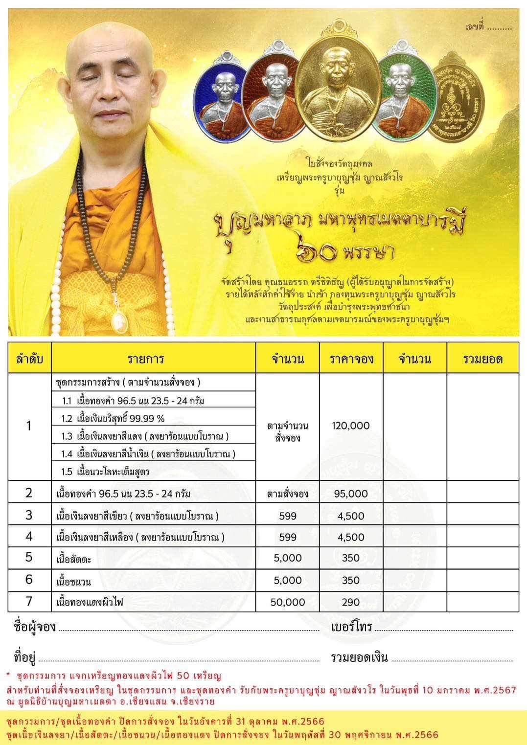 เหรียญพระครูบาบุญชุ่ม ญาณสังวโร รุ่นบุญมหาลาภ มหาพุทธเมตตาบารมี 60 พรรษา จัดสร้างโดย คุณธนอรรถ ตรีธิติธัญ (ผู้ได้รับอนุญาตในการจัดสร้าง) รายได้หลังหักค่าใช้จ่าย นำเข้า กองทุนพระครูบาบุญชุ่ม ญาณสังวโร วัตถุประสงค์ เพื่อบำรุงพระพุทธศาสนา และงานสาธารณสุขกุศลตามเจตนารมณ์ของพระครูบาบุญชุ่ม เปิดร่วมบูชา 6 รายการ ดังนี้ 1.ชุดกรรมการสร้าง (ตามจำนวนสั่งจอง) รับพระ 5 องค์ ชุดละ 120,000 2.เนื้อทองคำ 96.5 (ตามจำนวนสั่งจอง) บูชา 95,000 บาท 3.เนื้อเงินลงยาเขียว สร้าง 599 เหรียญ บูชา 4500 บาท 4.เนื้อเงินลงยาหลือง สร้าง 599 เหรียญ บูชา 4500 บาท 5.เนื้อสัตตะ สร้าง 5000 เหรียญ บูชา 350 บาท 6.เนื้อชนวน สร้าง 5000 เหรียญ บูชา 350 บาท 7.เนื้อทองแดงผิวไฟ สร้าง 50000 เหรียญ บูชา 290 บาท เหรียญพระครูบาบุญชุ่ม ญาณสังวโร รุ่นบุญมหาลาภ มหาพุทธเมตตาบารมี 60 พรรษา จัดสร้างโดย คุณธนอรรถ ตรีธิติธัญ (ผู้ได้รับอนุญาตในการจัดสร้าง) รายได้หลังหักค่าใช้จ่าย นำเข้า กองทุนพระครูบาบุญชุ่ม ญาณสังวโร วัตถุประสงค์ เพื่อบำรุงพระพุทธศาสนา และงานสาธารณสุขกุศลตามเจตนารมณ์ของพระครูบาบุญชุ่ม เปิดร่วมบูชา 6 รายการ ดังนี้ 1.ชุดกรรมการสร้าง (ตามจำนวนสั่งจอง) รับพระ 5 องค์ ชุดละ 120,000 2.เนื้อทองคำ 96.5 (ตามจำนวนสั่งจอง) บูชา 95,000 บาท 3.เนื้อเงินลงยาเขียว สร้าง 599 เหรียญ บูชา 4500 บาท 4.เนื้อเงินลงยาหลือง สร้าง 599 เหรียญ บูชา 4500 บาท 5.เนื้อสัตตะ สร้าง 5000 เหรียญ บูชา 350 บาท 6.เนื้อชนวน สร้าง 5000 เหรียญ บูชา 350 บาท 7.เนื้อทองแดงผิวไฟ สร้าง 50000 เหรียญ บูชา 290 บาท #ขวัญพระเครื่อง #ขวัญธานันท์พระเครื่อง