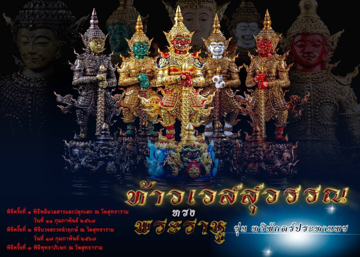ขอเชิญร่วมพิธีบวงสรวงนำฤกษ์ ท้าวเวสสุวรรณประทับราหู รุ่นทวิพักตร์ประทานพร (หน้ายักษ์ หน้าเทพ) ณ วัดสุทธาราม เขตธนบุรี กรุงเทพฯ วันเสาร์ที่ 17 กุมภาพันธ์ 2567 เวลา 17.30 น. พร้อมเปิดให้สั่งจอง #ขวัญพระเครื่อง #ขวัญธานันท์พระเครื่อง
