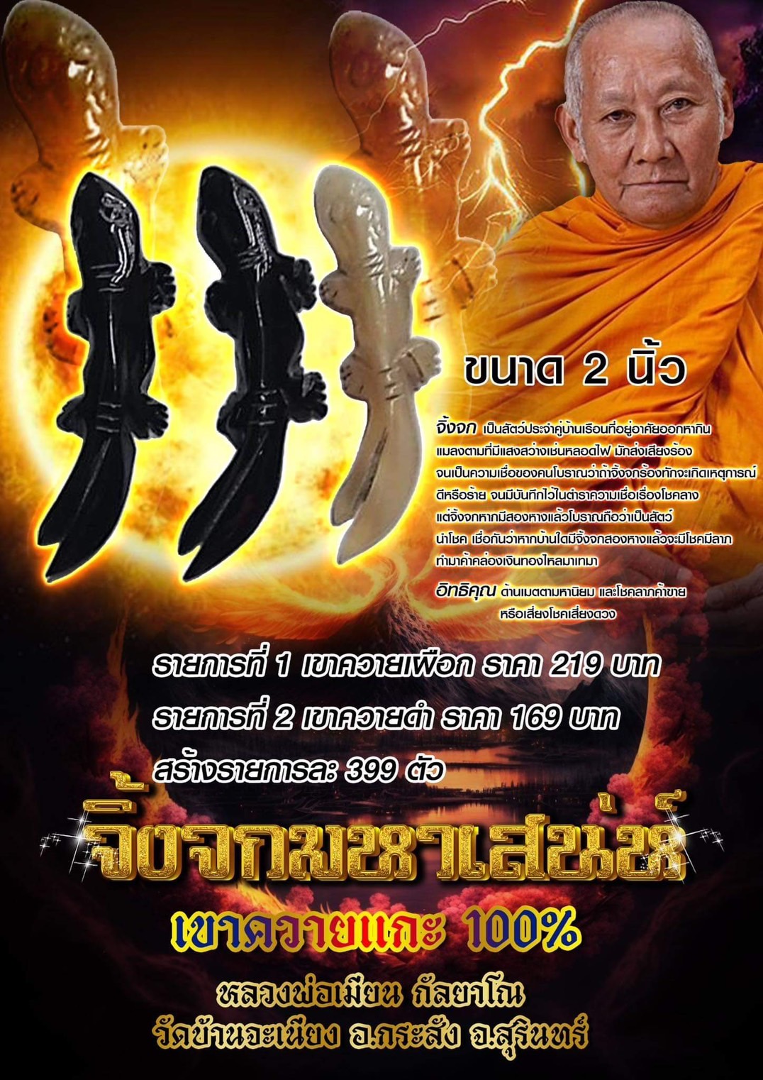 📣📣📣เปิดจอง📣📣📣 🦎จิ้งจกมหาเสน่ห์🦎 💯เขาควายแกะ 100% หลวงพ่อเมียน กัลยาโณ วัดบ้านจะเนียง อ.กระสัง จ.สุรินทร์ 🔸รายการที่ 1 เขาควายเผือก ราคา 219 บาท 🔸รายการที่ 2 เขาควายดำ ราคา 169 บาท 🚧สร้างรายการละ 399 ตัว 📐ขนาด 2 นิ้ว ▫️จิ้งจกเป็นสัตว์ประจำคู่บ้านเรือนที่อยู่อาศัยออกหากินแมลงตามที่มีแสงสว่างเช่นหลอดไฟ มักส่งเสียงร้อง จนเป็นความเชื่อของคนโบราณว่าถ้าจิ้งจกร้องทักจะเกิดเหตุการณ์ดีหรือร้าย จนมีบันทึกไว้ในตำราความเชื่อเรื่องโชคลาง แต่จิ้งจกหากมีสองหางแล้วโบราณถือว่าเป็นสัตว์นำโชค เชื่อกันว่าหากบ้านใดมีจิ้งจกสองหางแล้วจะมีโชคมีลาภ ทำมาค้าคล่องเงินทองไหลมาเทมา ▫️อิทธิคุณ ด้านเมตตามหานิยม และโชคลาภค้าขาย หรือเสี่ยงโชคเสี่ยงดวง #ขวัญพระเครื่อง #ขวัญธานันท์พระเครื่อง