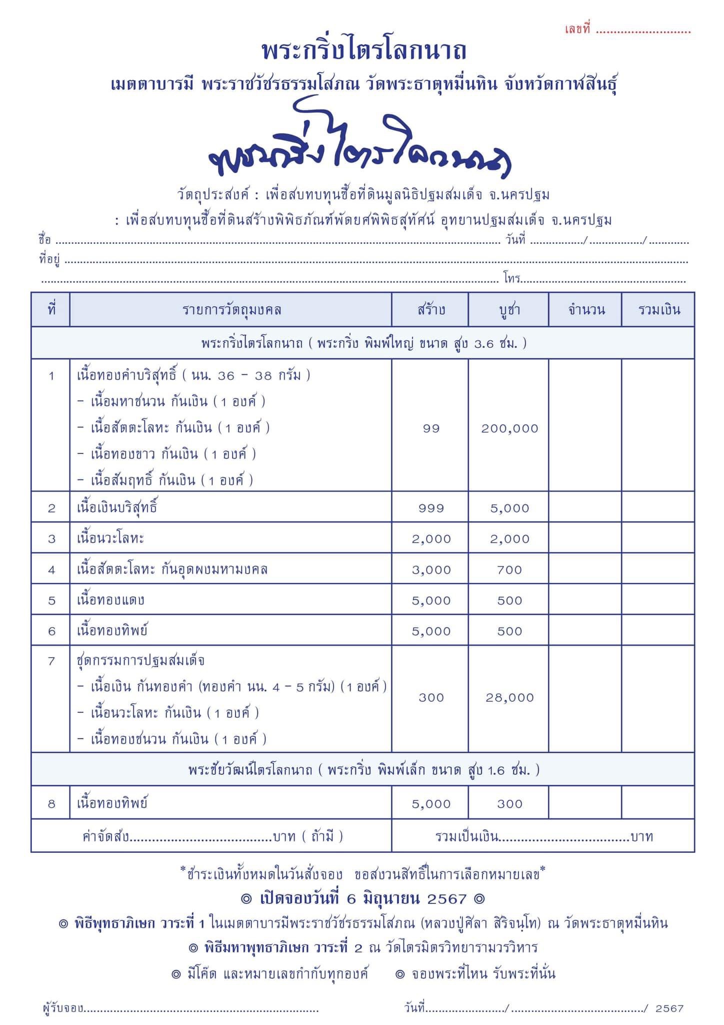 พระกริ่งไตรโลกนาถ หลวงปู่ศิลา เสกเดี่ยว วันที่ 6 มิย. 2567 พระออก ต้น กรกฏาคม 2567 รายการส้ราง 1 ชุดทองคำ รับ 5 องค์ 99 ชุด 2 เนื้อเงิน 999 องค์ 3 เนื้อนวะ 2,000 องค์ 4 เนื้อสัตตะ (อุดผง) 3,000 องค์ 5 เนื้อทองแดง 5,000 องค์ 6 เนื้อทองทิพย์ 5,000 องค์ #ขวัญพระเครื่อง #ขวัญธานันท์พระเครื่อง