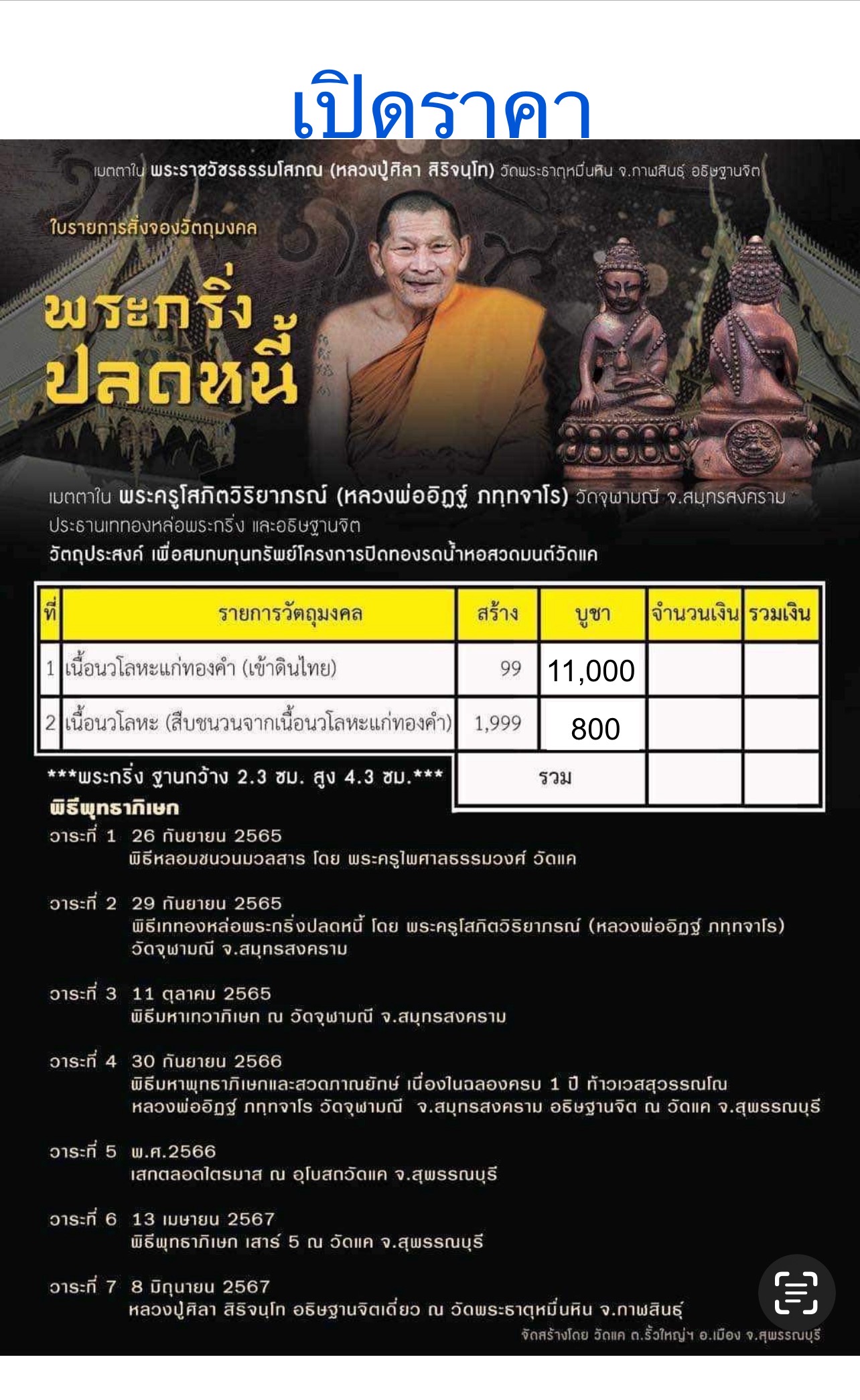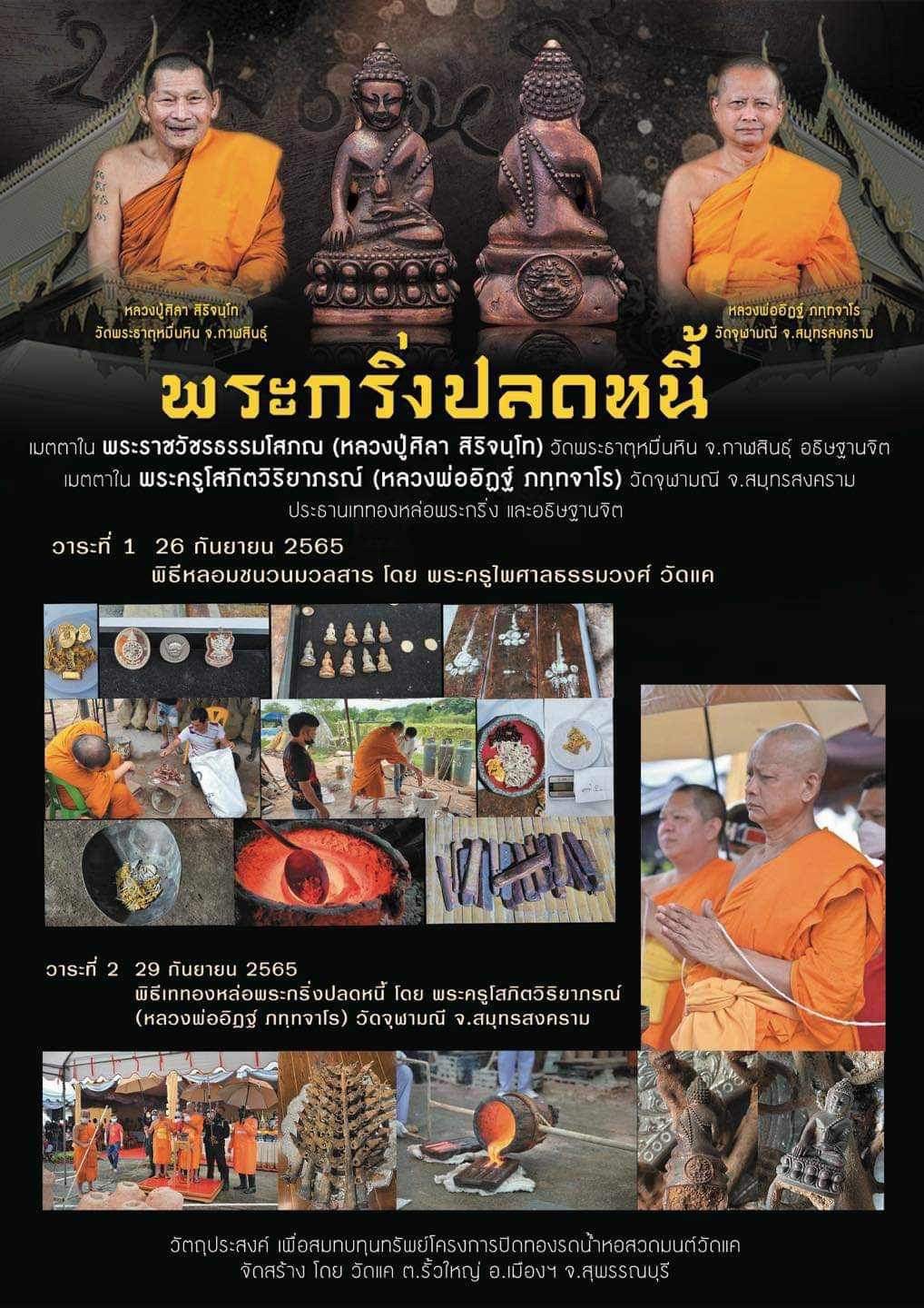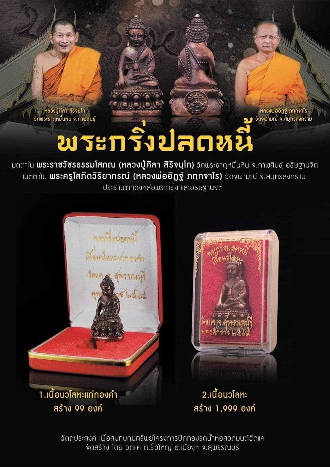 พระกริ่งปลดหนี้ 8 มิถุนายน 2567 • หลวงปู่ศิลา สิริจนฺโท อธิษฐานจิตเดี่ยว ณ วัดพระธาตุหมื่นหิน จ.กาฬสินธุ์ วัตถุประสงค์ เพื่อสมทบทุนทรัพย์โครงการปิดทองรดน้ำหอสวดมนต์วัดแค พิธีพุทธาภิเษก วาระที่ 1 26 กันยายน 2565 • พิธีหลอมชนวนมวลสาร โดย พระครูไพศาลธรรมวงศ์ วัดแค วาระที่ 2 29 กันยายน 2565 • พิธีเททองหล่อพระกริ่งปลดหนี้ โดย พระครูโสภิตวิริยาภรณ์ (หลวงพ่ออิฏฐ์ ภทฺทจาโร) วัดจุฬามณี จ.สมุทรสงคราม วาระที่ 3 11 ตุลาคม 2565 • พิธีมหาเทวาภิเษก ณ วัดจุฬามณี จ.สมุทรสงคราม วาระที่ 4 30 กันยายน 2566 • พิธีมหาพุทธาภิเษกและสวดภาณยักษ์ เนื่องในฉลองครบ 1 ปี ท้าวเวสสุวรรณโณ หลวงพ่ออิฏฐ์ ภทฺทจาโร วัดจุฬามณี จ.สมุทรสงคราม อธิษฐานจิต ณ วัดแค จ.สุพรรณบุรี วาระที่ 5 พ.ศ.2566 • เสกตลอดไตรมาส ณ อุโบสถวัดแค จ.สุพรรณบุรี วาระที่ 6 13 เมษายน 2567 • พิธีพุทธาภิเษก เสาร์ 5 ณ วัดแค จ.สุพรรณบุรี วาระที่ 7 8 มิถุนายน 2567 • หลวงปู่ศิลา สิริจนฺโท อธิษฐานจิตเดี่ยว ณ วัดพระธาตุหมื่นหิน จ.กาฬสินธุ์ #ขวัญพระเครื่อง #ขวัญธานันท์พระเครื่อง