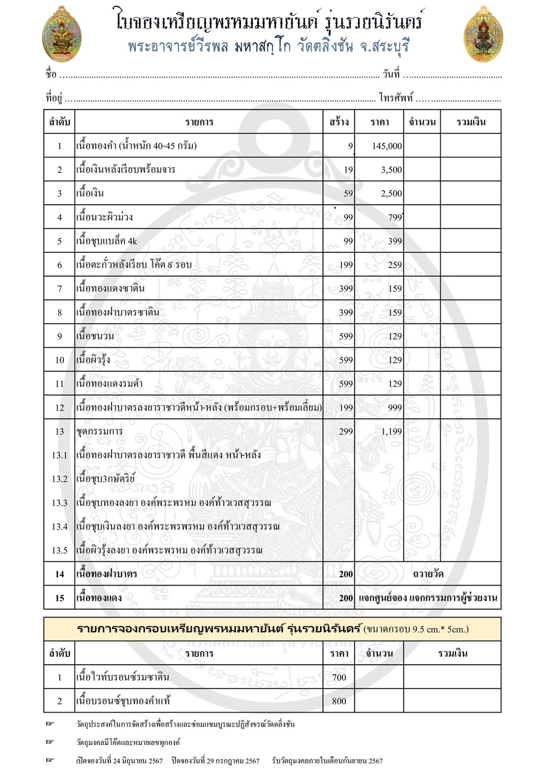 🍀 เปิดจองแล้ววันนี้ เหรียญสวยคลาสสิค 🪷 เหรียญพรหมมหายันต์ รุ่นรวยนิรันดร์ 🙏ร่วมเผยแผ่บารมีพรหม พระอาจารย์วีรพล มหาสกฺโก วัดตลิ่งชัน จ.สระบุรี พระอาจารย์วีรพล มหาสกฺโก มีความรู้เรื่องการเขียนยันต์และการวางอักขระยันต์ ได้เป็นอย่างดียิ่ง พระอาจารย์เมตตาเขียนยันต์ให้เต็มเหรียญทั้งด้านหน้าและด้านหลัง พุทธคุณไม่ต้องพูดถึง เข้มขลัง สำเร็จทุกประการ และจะเป็นเหรียญที่ทรงคุณค่าแก่ลูกศิษย์ลูกหาและผู้ศรัทธาเป็นอย่างมาก พระอาจารย์วีรพล มหาสกฺโก ได้ศึกษาตำราและสืบสานตำนาน “พระพรหม” ได้เป็นอย่างดี เปรียบเสมือน “ช้างเผือกในป่าใหญ่” และได้วิชาจากครูบาอาจารย์ด้านสายพระพรหม อาทิ สายวัดประดู่ทรงธรรม โดย ลพ.เพย อุตตโม วัดบึง จ.อยุธยา และจากการแนะนำของครูบาอาจารย์หลายท่าน กล่าวคือ ลพ.ชำนาญ อุตฺตมปุญฺโญ วัดชินวรารามวรวิหาร จ.ปทุมธานี (สมัยที่ท่านอยู่วัดบางกุฎีทอง), พระอาจารย์ติ๋ว ฐิตวัฑฒโน วัดมณีชลขันฑ์ จ.ลพบุรี, ลพ.เพชร ปริปุณโณ วัดประดู่ทรงธรรม ปัจจุบันท่านยังคงศึกษาใฝ่หาความรู้ ศึกษาตำรา และเคร่งครัดในพระธรรมวินัยอยู่สม่ำเสมอ และท่านมีเมตตาต่อลูกศิษย์ที่ศรัทธามากราบไหว้เป็นอย่างมาก กราบบารมีครู พระอาจารย์วีรพล มหาสกฺโก วัดตลิ่งชัน เหรียญพรหมมหายันต์ รุ่นรวยนิรันดร์ 📌 เปิดจอง 24 มิถุนายน 2567 📌 ปิดจอง 29 กรกฎาคม 2567 📌 รับวัตถุมงคล ภายในเดือนกันยายน 2567 📌 วัตถุประสงค์ในการจัดสร้าง เพื่อสร้างและซ่อมแซมบูรณะปฏิสังขรณ์วัดตลิ่งชัน จ.สระบุรี #ขวัญพระเครื่อง #ขวัญธานันท์พระเครื่อง