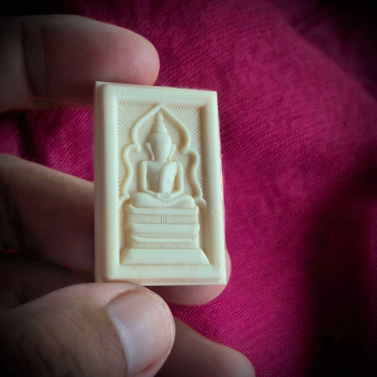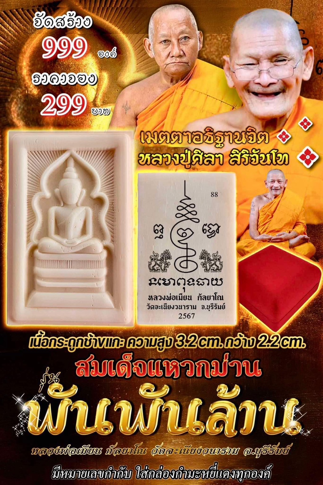 สมเด็จแหวกม่าน รุ่น พันพันล้าน หลวงพ่อเมียน กัลยาโณ วัดจะเนียงวนาราม จ.บุรีรัมย์ *ปลุกเสกอธิษฐานจิต หลวงปู่มหาศิลา สิริจันโท ✅ เนื้อกระดูกช้างแกะ ความสูง 3.2 cm. กว้าง 2.2 cm. ✅ ราคาจอง 299 บาท สร้าง 999 องค์ 🚩มีหมายเลขกำกับ 🚩ใส่กล่องกำมะหยี่แดงทุกองค์ #ขวัญพระเครื่อง #ขวัญธานันท์พระเครื่อง