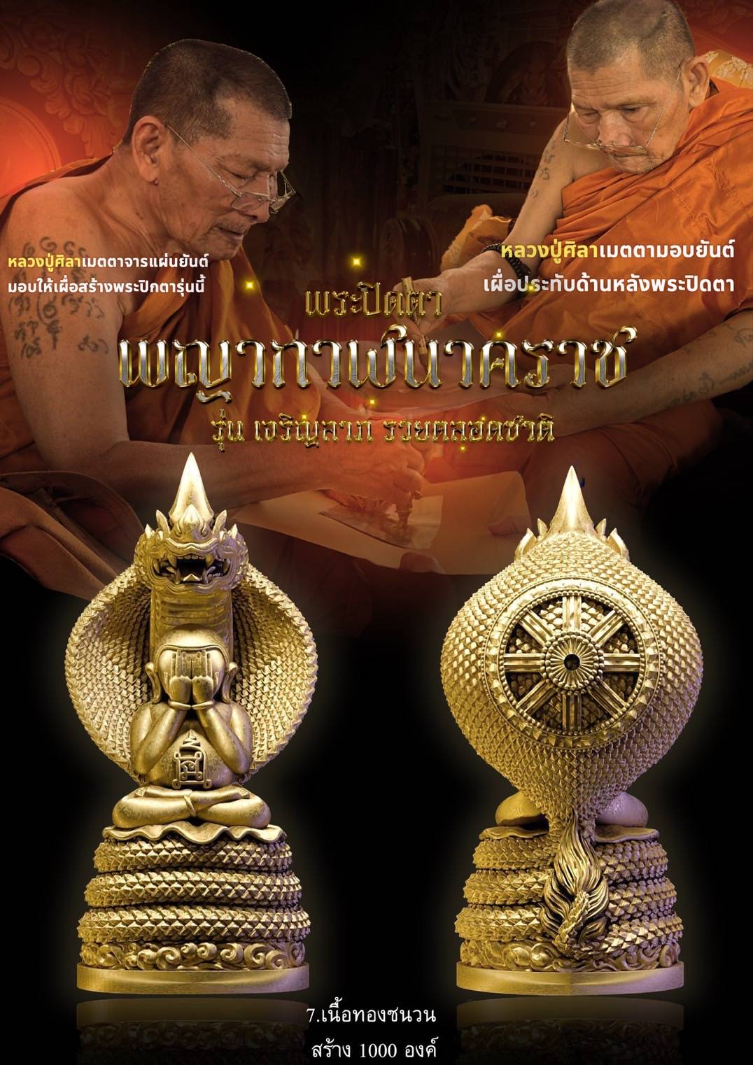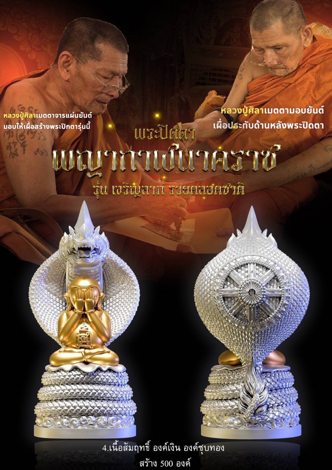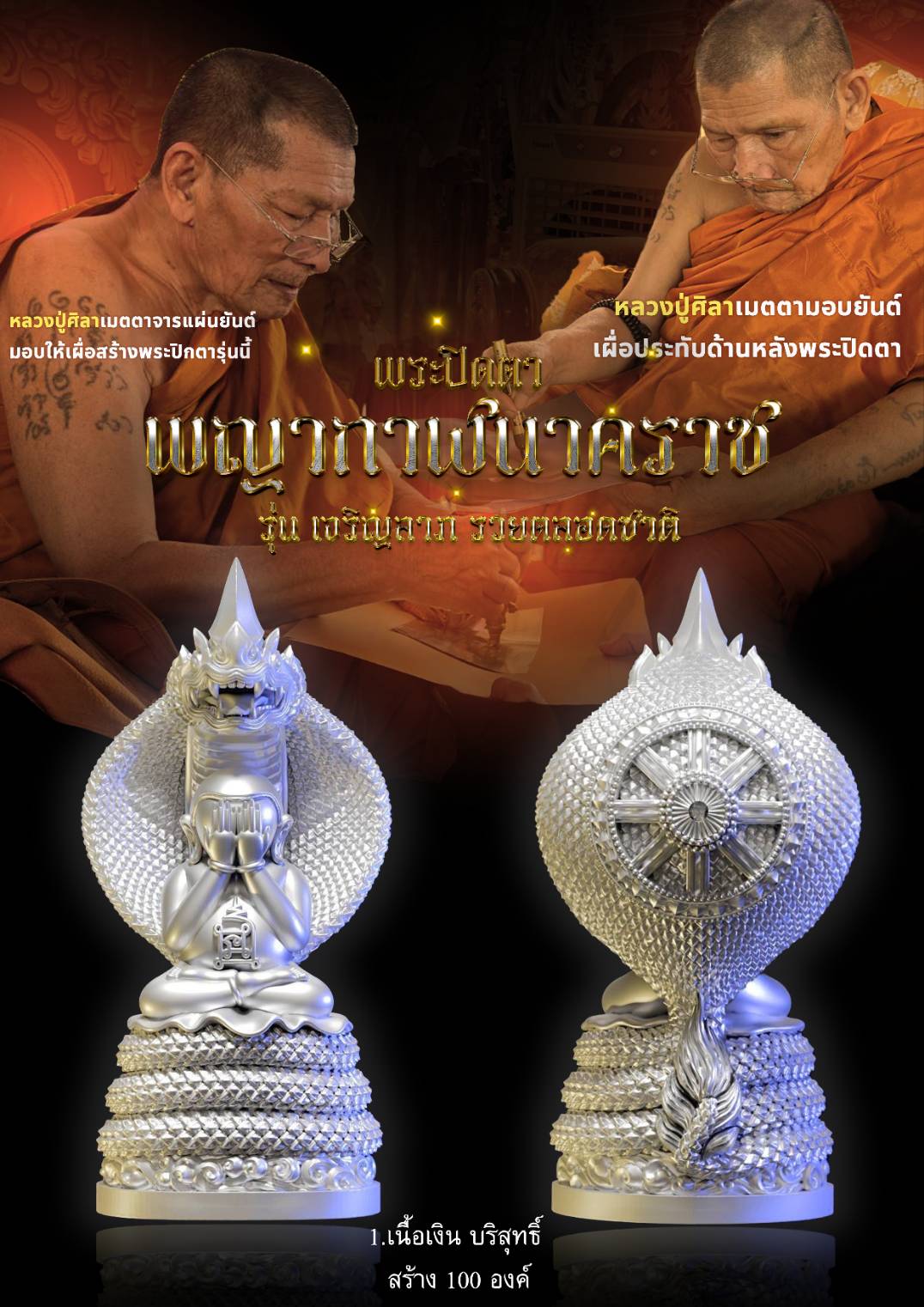 พระปิดตาพญากาฬนาคราช ปลุกเสกตามตำราวิชาโบราณพญากาฬนาคราชนอนกิน มีพุทธคุณและ อิทธิฤทธิ์โดดเด่นด้านเสริมดวงชะตา โชคลาภ การงาน การค้า นำมาซึ่งความเจริญรุ่งเรือง มีพุทธคุณ 108 ประการ พระปิดตารุ่นนี้หลวงปู่ศิลา ท่านเมตตา จารพระยันต์ลงในแผ่นโลหะเพื่อใช้ในการหล่อหลอม และได้เมตตาเขียนยันต์เพื่อใช้ประทับด้านหลังพระปิดตารุ่นนี้อีกด้วย พร้อมพิธีพุทธาภิเษกอย่างครบถ้วนสมบูรณ์ หลวงปู่ศิลา พระเกจิ พระปิดตาพญานาค โรงหล่อ บ. นพกร พุทธศิลป์ จำกัด #ขวัญพระเครื่อง #ขวัญธานันท์พระเครื่อง