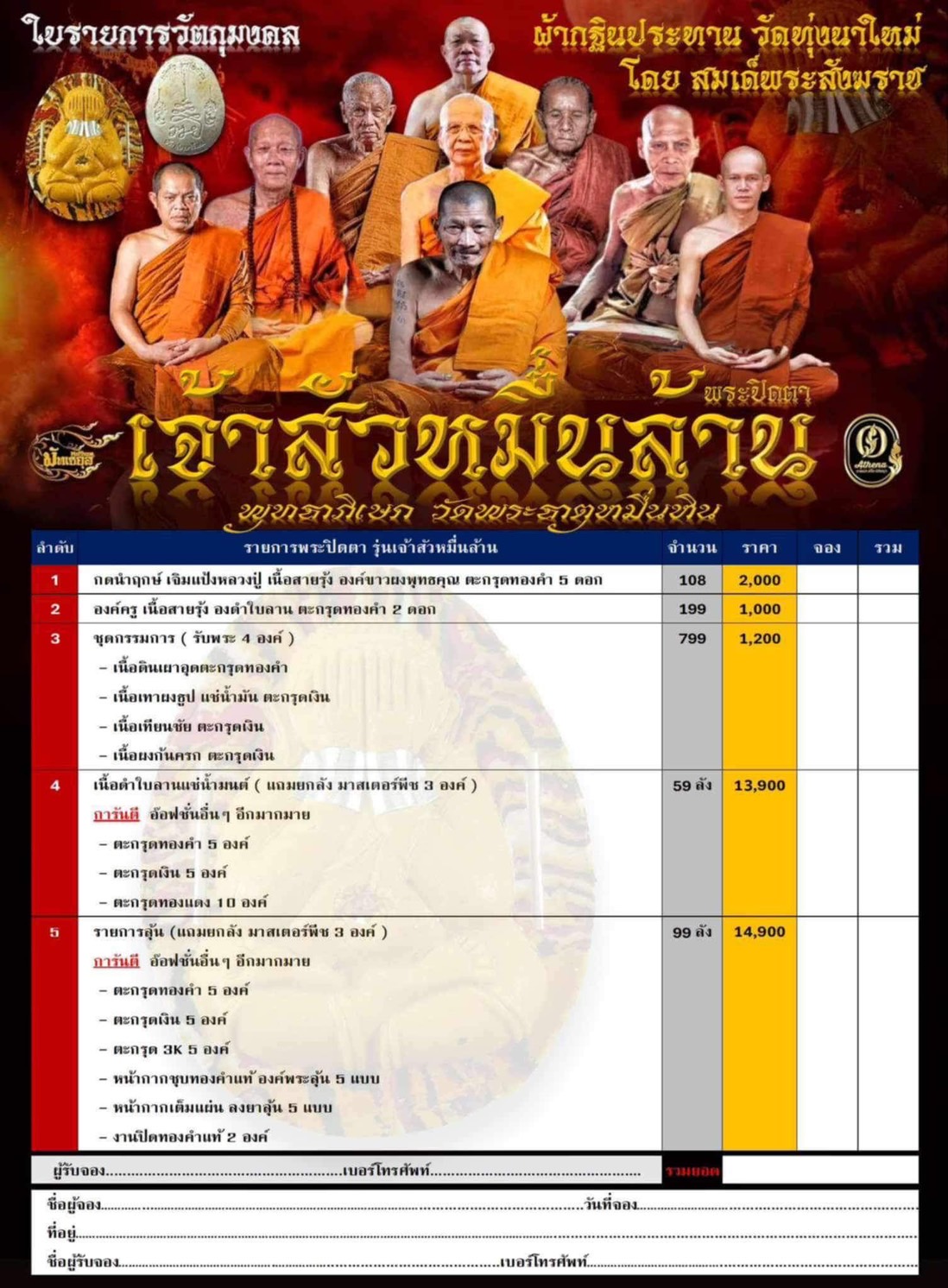 เปิดจอง พระปิดตาจัมโบ้ รุ่น เจ้าสัวหมื่นล้าน ผ้ากฐินประทาน วัดทุ่งนาใหม่ โดยสมเด็จพระสังฆราช พุทธาภิเษกวัดพระธาตุหมื่นหิน วันเสาร์ ที่ 14 ก.ย. 2567 1. กดนำฤกษ์ เจิมแป้งหลวงปู่ เนื้อสายรุ้ง องค์ขาวผงพุทธคุณ ตะกรุดทองคำ 5 ดอก จำนวน 108 องค์ ราคา 2,000- 2.องค์ครู เนื้อสายรุ้ง องค์ดำใบลาน ตะกรุดทองคำ 2 ดอก จำนวน 199 ราคา 1,000 3.ชุดกรรมการ (รับพระ 4 องค์) - เนื้อดินเผาอุดตะกรุดทองคำ - เนื้อเทาผงธูปแช่น้ำมนต์ตะกรุดเงิน - เนื้อเทียนชัยตะกรุดเงิน - เนื้อผงก้นครกตะกรุดเงิน จำนวน 799 ชุด ราคา 1,200 4. เนื้อดำใบลานแช่น้ำมนต์ การันตี... ตะกรุดทองคำ 5ดอก ตะกรุดเงิน 5 ดอก ทองแดง 10 ดอก และ option อื่นๆอีกมากมาย แถมยกลัง มาสเตอร์พีช 3 องค์ จำนวน 59 ลัง 5. รายการลุ้น การันตี ตะกรุดทองคำ 5 ดอก ตะกรุดเงิน 5 ดอก ตะกรุด 3K 5 ดอก หน้ากากองค์พระลุ้น 5 แบบ หน้ากากเต็มแผ่นลงยาลุ้น 5 แบบ งานปิดทองคำแท้ 2 องค์ และ option อื่นๆอีกมากมาย แถมยกลัง มาสเตอร์พีช 3 องค์ สร้าง 99 ลัง #ขวัญพระเครื่อง #ขวัญธานันท์พระเครื่อง
