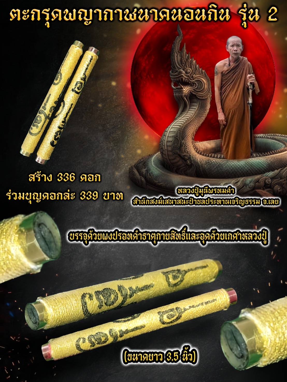เปิดจอง ตะกรุดพญากาฬนาคนอนกิน รุ่น2 หลวงปู่สร้าง 336 ดอก จารยันต์นอก-ใน.(ขนาดยาว 4 นิ้ว) จองร่วมบุญดอกละ 339 บาท 📌รุ่น2นี้ จะพิเศษบรรจุด้วยผงปรอทดำธาตุกายสิทธิ์และอุดด้วยเกศาหลวงปู่ปิดหัวท้ายตะกรุด 🐉ที่สำคัญหลวงปู่ทำในช่วงพรรษาตลอด 3 เดือน ✅กำหนดรับตะกรุดออกพรรษา ปัจจัยทุกบาท นำมาสร้างองค์พญานาควิรูปักษ์ #ขวัญพระเครื่อง #ขวัญธานันท์พระเครื่อง