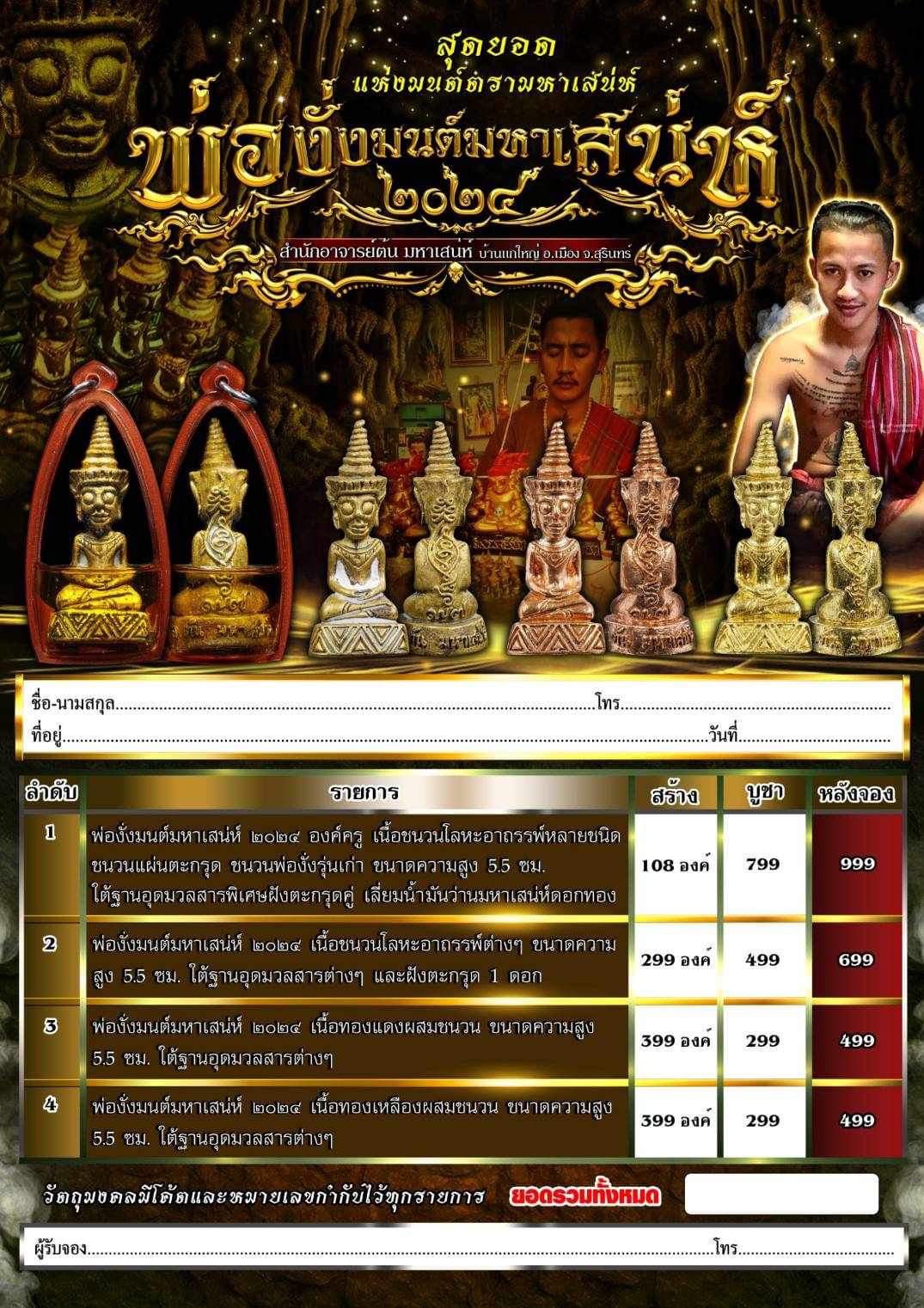 สุดยอดแห่งมนต์ตรามหาเสน่ห์ พ่องั่งมนต์มหาเสน่ห์ ๒๐๒๔ สำนักอาจารย์ต้น มหาเสน่ห์ บ้านแกใหญ่ อ.เมือง จ.สุรินทร์ รก.1 พ่องั่งมนต์มหาเสน่ห์๒๐๒๔ องค์ครู เนื้อชนวนโลหะอาถรรพ์หลายชนิด ชนวนแผ่นตะกรุด ชนวนพ่องั่งรุ่นเก่า ขนาดความสูง5.5ซม.ใต้ฐานอุดมวลสารพิเศษฝังตะกรุดคู่ เลี่ยมน้ำมันว่านมหาเสน่ห์ดอกทอง สร้างจำนวน108องค์ บูชาองค์ละ799 รก.2 พ่องั่งมนต์มหาเสน่ห์๒๐๒๔ เนื้อชนวนโลหะอาถรรพ์ต่างๆ ขนาดความสูง5.5ซม.ใต้ฐานอุดมวลสารต่างๆ และฝังตะกรุด1ดอก สร้างจำนวน299องค์ บูชาองค์ละ499 รก.3 พ่องั่งมนต์มหาเสน่ห์๒๐๒๔ เนื้อทองแดงผสมชนวน ขนาดความสูง5.5ซม.ใต้ฐานอุดมวลสารต่างๆ สร้างจำนวน399องค์ บูชาองค์ละ299 รก.4 พ่องั่งมนต์มหาเสน่ห์๒๐๒๔ เนื้อทองเหลืองผสมชนวน ขนาดความสูง5.5ซม.ใต้ฐานอุดมวลสารต่างๆ สร้างจำนวน399องค์ บูชาองค์ละ299 #ขวัญพระเครื่อง #ขวัญธานันท์พระเครื่อง