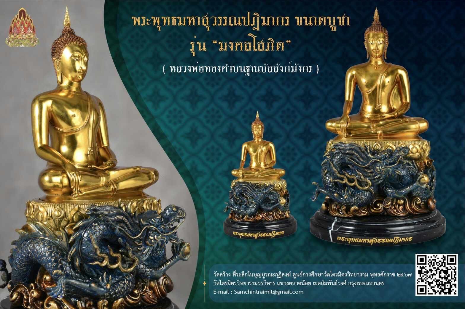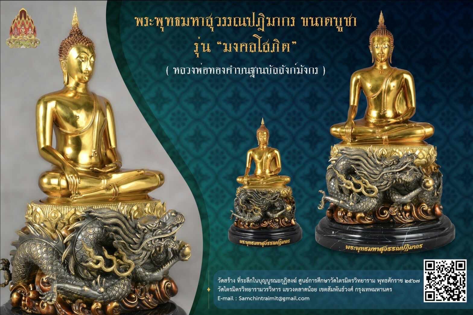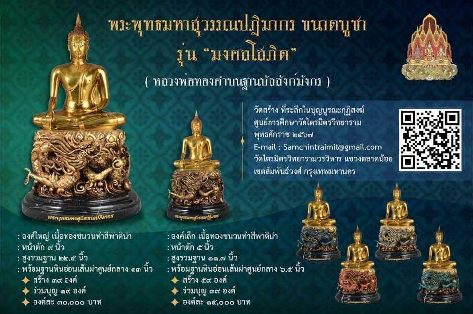 วันที่ 9 เดือน 9 เปิดจองสุดยอดมงคลที่ระลึก พระบูชาหลวงพ่อทองคำบนฐานบัลลังก์พญามังกร รุ่น มงคลโสภิต ปฐมฤกษ์ เททองในวันที่ ๒๔ กุมภาพันธ์ ๒๕๖๗ (วันมาฆบูชา) พระพุทธมหาสุวรรณปฏิมากร ขนาดบูชา รุ่น มงคลโสภิต ( หลวงพ่อทองคำบนฐานบัลสังก์มังกร ) วัดสร้าง ที่ระลึกในบุญบูรณะกุฏิสงฆ์ ศูนย์การศึกษาวัดไตรมิตรวิทยาราม พุทธศักราช ๒๕๖๗ วัดไตรมิตรวิทยารามวรวิหาร แขวงตลาดน้อย เขตสัมพันธ์วงศ์ กรุงเทพมหานคร พระพุทธมหาสุวรรณปฏิมากร : องค์ใหญ่ เนื้อทองชนวนทำสีพาติน่า : หน้าตัก ๙ นิ้ว : สูงรวมฐาน ๒๒.๕ นิ้ว : พร้อมฐานหินอ่อนเส้นผ่าศูนย์กลาง ๑๓ นิ้ว สร้าง ๓๙ องค์ ร่วมบุญ ๑๙ องค์ องค์ละ ๓๐,๐๐๐ บาท : องค์เล็ก เนื้อทองชนวนทำสีพาติน่า : หน้าตัก ๕ นิ้ว : สูงรวมฐาน ๑๑.๗ นิ้ว : พร้อมฐานหินอ่อนเส้นผ่าศูนย์กลาง ๖.๕ นิ้ว สร้าง ๕๙ องค์ ร่วมบุญ ๓๙ องค์ องค์ละ ๑๕,๐๐๐ บาท กำหนดพิธีพุทธาภิเษก วาระที่ ๑ วันที่ ๑๗ กันยายน ๒๕๖๗ เวลา ๒๓.๐๐ น. (พิธีจีน คืนไหว้พระจันทร์) วาระที่ ๒ ……… วาระที่ ๓ วันที่ ๘-๙ พฤศจิกายน ๒๕๖๗ เวลา ๑๕.๐๐ น. ณ ศูนย์การศึกษาพระปริยัติธรรมวัดไตรมิตรวิทยาราม สร้างน้อยจำนวนจำกัด มีโค้ดและหมายเลขกำกับทุกองค์ ท่านเจ้าประคุณสมเด็จพระพุฒาจารย์ เจ้าอาวาสวัดไตรมิตรวิทยาราม มีดำริจัดสร้างพระพุทธรูปดังกล่าวขึ้นเนื่องด้วยวาระอันเป็นมงคล ดังนี้ ๏ เพื่อเฉลิมพระเกียรติพระบาทสมเด็จพระเจ้าอยู่หัว เนื่องในโอกาสมหามงคลเฉลิมพระชนมพรรษา ๖ รอบ ๗๒ พรรษา ด้วยการจัดสร้าง พระพุทธมหาสุวรรณปฏิมากร (จำลอง) ขนาดหน้าตัก ๙.๕, ๕ นิ้ว เพื่อเป็นที่ระลึกในบุญบูรณะกุฏิสงฆ์ ศูนย์การศึกษาพระปริยัติธรรมวัดไตรมิตรวิทยาราม จังหวัดนครราชสีมา ๏ เพื่อให้ประชาชนเช่าบูชาสักการะเสริมความเป็นสิริมงคลแก่ชีวิต #ขวัญพระเครื่อง #ขวัญธานันท์พระเครื่อง
