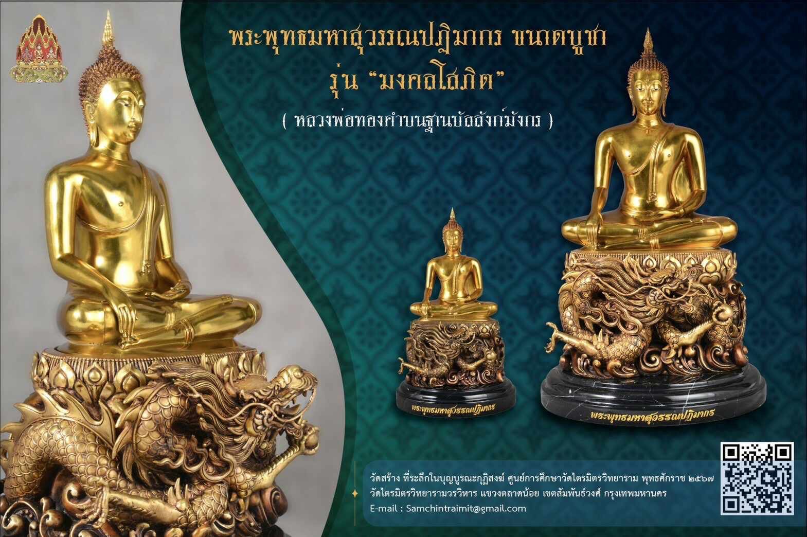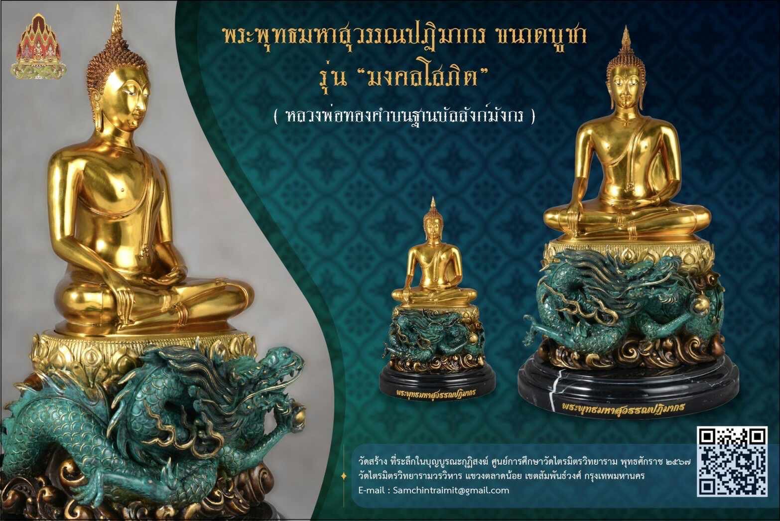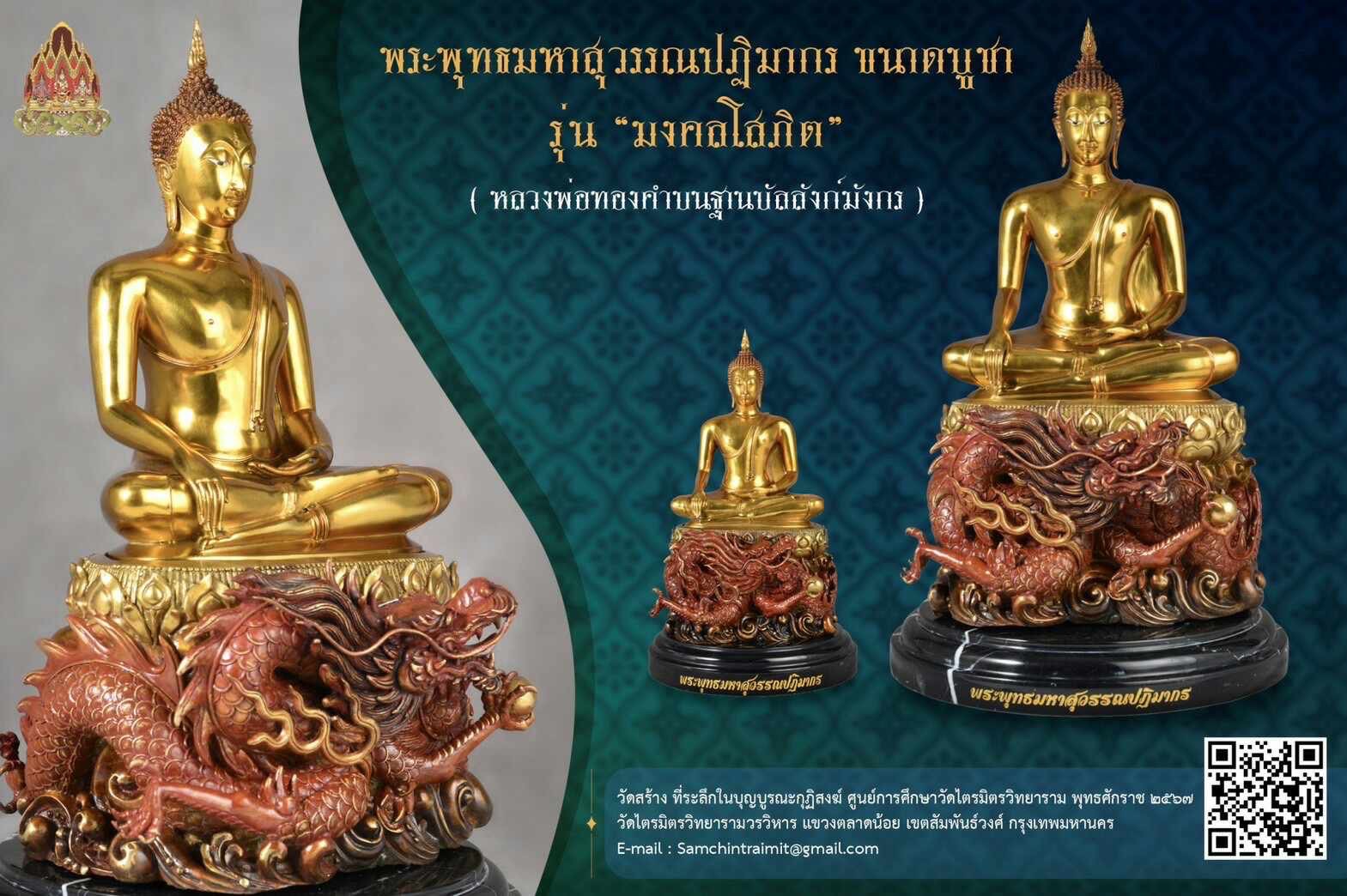 วันที่ 9 เดือน 9 เปิดจองสุดยอดมงคลที่ระลึก พระบูชาหลวงพ่อทองคำบนฐานบัลลังก์พญามังกร รุ่น มงคลโสภิต ปฐมฤกษ์ เททองในวันที่ ๒๔ กุมภาพันธ์ ๒๕๖๗ (วันมาฆบูชา) พระพุทธมหาสุวรรณปฏิมากร ขนาดบูชา รุ่น มงคลโสภิต ( หลวงพ่อทองคำบนฐานบัลสังก์มังกร ) วัดสร้าง ที่ระลึกในบุญบูรณะกุฏิสงฆ์ ศูนย์การศึกษาวัดไตรมิตรวิทยาราม พุทธศักราช ๒๕๖๗ วัดไตรมิตรวิทยารามวรวิหาร แขวงตลาดน้อย เขตสัมพันธ์วงศ์ กรุงเทพมหานคร พระพุทธมหาสุวรรณปฏิมากร : องค์ใหญ่ เนื้อทองชนวนทำสีพาติน่า : หน้าตัก ๙ นิ้ว : สูงรวมฐาน ๒๒.๕ นิ้ว : พร้อมฐานหินอ่อนเส้นผ่าศูนย์กลาง ๑๓ นิ้ว สร้าง ๓๙ องค์ ร่วมบุญ ๑๙ องค์ องค์ละ ๓๐,๐๐๐ บาท : องค์เล็ก เนื้อทองชนวนทำสีพาติน่า : หน้าตัก ๕ นิ้ว : สูงรวมฐาน ๑๑.๗ นิ้ว : พร้อมฐานหินอ่อนเส้นผ่าศูนย์กลาง ๖.๕ นิ้ว สร้าง ๕๙ องค์ ร่วมบุญ ๓๙ องค์ องค์ละ ๑๕,๐๐๐ บาท กำหนดพิธีพุทธาภิเษก วาระที่ ๑ วันที่ ๑๗ กันยายน ๒๕๖๗ เวลา ๒๓.๐๐ น. (พิธีจีน คืนไหว้พระจันทร์) วาระที่ ๒ ……… วาระที่ ๓ วันที่ ๘-๙ พฤศจิกายน ๒๕๖๗ เวลา ๑๕.๐๐ น. ณ ศูนย์การศึกษาพระปริยัติธรรมวัดไตรมิตรวิทยาราม สร้างน้อยจำนวนจำกัด มีโค้ดและหมายเลขกำกับทุกองค์ ท่านเจ้าประคุณสมเด็จพระพุฒาจารย์ เจ้าอาวาสวัดไตรมิตรวิทยาราม มีดำริจัดสร้างพระพุทธรูปดังกล่าวขึ้นเนื่องด้วยวาระอันเป็นมงคล ดังนี้ ๏ เพื่อเฉลิมพระเกียรติพระบาทสมเด็จพระเจ้าอยู่หัว เนื่องในโอกาสมหามงคลเฉลิมพระชนมพรรษา ๖ รอบ ๗๒ พรรษา ด้วยการจัดสร้าง พระพุทธมหาสุวรรณปฏิมากร (จำลอง) ขนาดหน้าตัก ๙.๕, ๕ นิ้ว เพื่อเป็นที่ระลึกในบุญบูรณะกุฏิสงฆ์ ศูนย์การศึกษาพระปริยัติธรรมวัดไตรมิตรวิทยาราม จังหวัดนครราชสีมา ๏ เพื่อให้ประชาชนเช่าบูชาสักการะเสริมความเป็นสิริมงคลแก่ชีวิต #ขวัญพระเครื่อง #ขวัญธานันท์พระเครื่อง