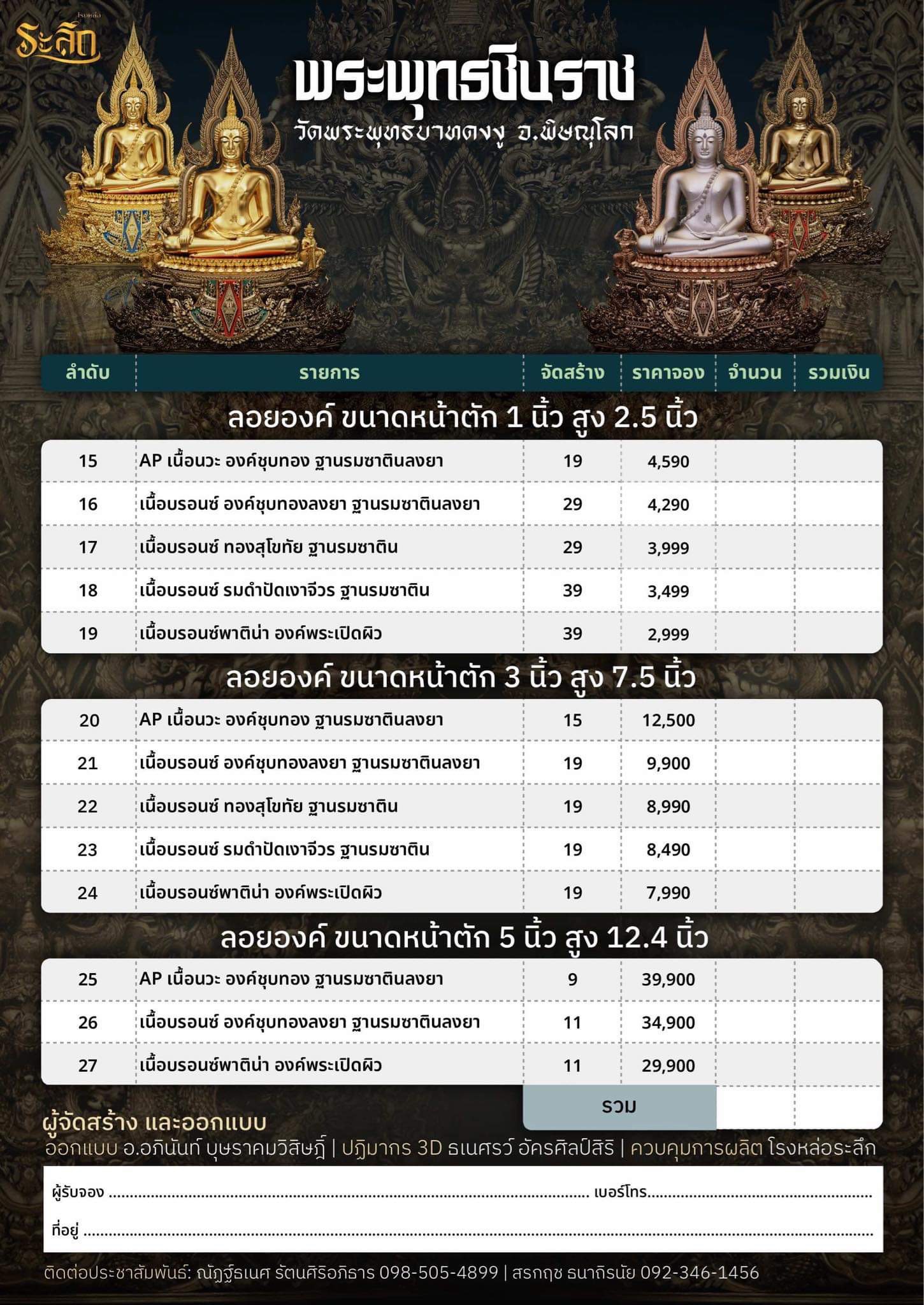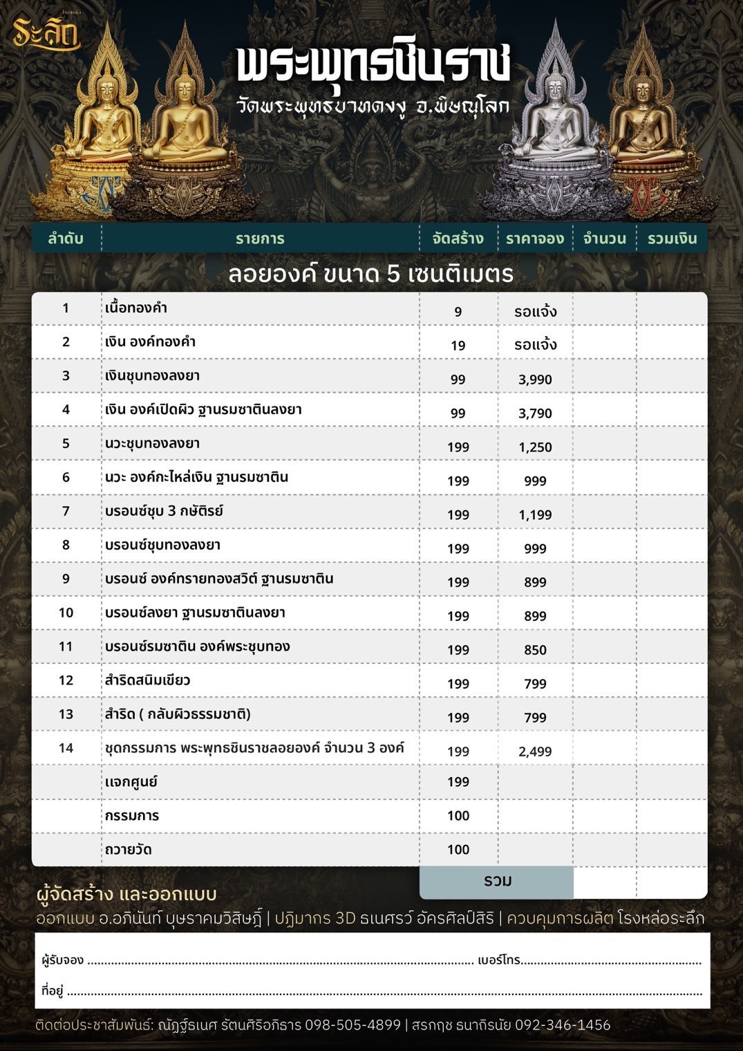 เปิดสั่งจอง พระพุทธชินราช วัดพระพุทธบาทดงงู จังหวัดพิษณุโลก ⚜️ลอยองค์ ⚜️ ความสูง 5 ซม หน้าตัก 1 นิ้ว สูง 2.5 นิ้ว หน้าตัก 3 นิ้ว สูง 7.5 นิ้ว หน้าตัก 5 นิ้ว สูง 12.4 นิ้ว ออกแบบ : อ.อภินันท์ บุษราคมวิสิษฎิ์ ปฏิมากร 3D : ธเนศวร์ อัครศิลป์สิริ ดูแลลจัดสร้าง Yiwa Amulet ควบคุมการผลิต : โรงหล่อระลึก #ขวัญพระเครื่อง #ขวัญธานันท์พระเครื่อง