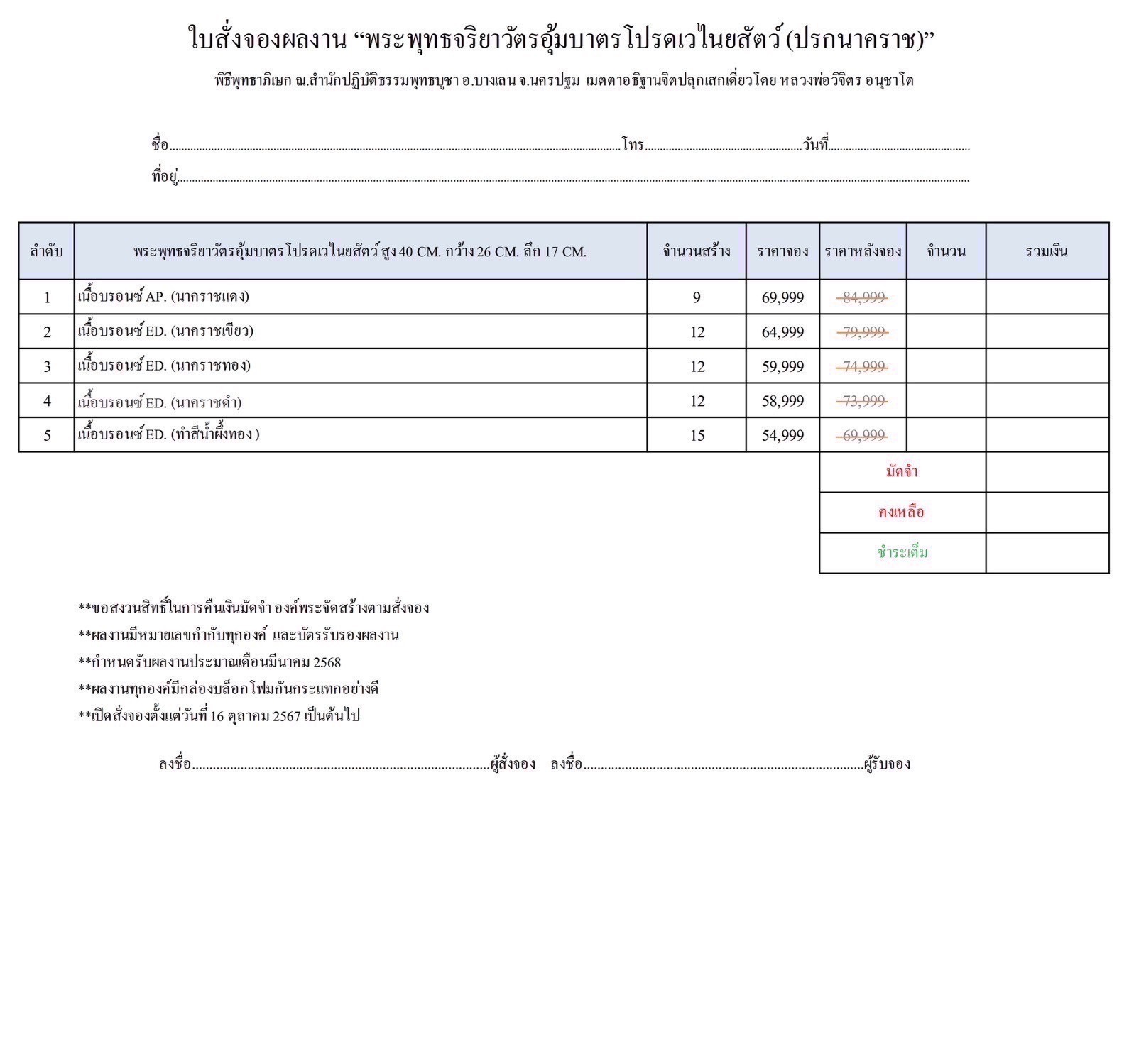 พระพุทธจริยาวัตรอุ้มบาตรโปรดเวไนยสัตว์ (ปรกนาคราช) ขนาดบูชาสูง 40 Cm. 1.เนื้อบรอนซ์ AP. (นาคราชแดง) จำนวนสร้าง 9 องค์ ราคาสั่งจอง 69,999 2.เนื้อบรอนซ์ ED. (นาคราชเขียว) จำนวนสร้าง 12 องค์ ราคาสั่งจอง 64,999 3.เนื้อบรอนซ์ ED. (นาคราชทอง) จำนวนสร้าง 12 องค์ ราคาสั่งจอง 59,999 4.เนื้อบรอนซ์ ED. (นาคราชดำ) จำนวนสร้าง 12 องค์ ราคาสั่งจอง 58,999 5.เนื้อบรอนซ์ ED. (ทำสีน้ำผึ้งทอง ) จำนวนสร้าง 15 องค์ ราคาสั่งจอง 54,999 ⚜️รายละเอียดผลงาน -พระบูชาขนาด : ความสูง 40 Cm. กว้าง 26 Cm. ลึก 17 Cm. (น้ำหนัก 14 กิโลกรัม) -ออกแบบลายเส้น : อ.ฉัตรชัย เเผ่นผา -ประติมากร 3D : ฮีโน่ -หล่อด้วยโลหะ : Bronze -เทคนิคสี : Airbrush Paint ,Patina -หล่อโดย : Premium casting jewelry co.,ltd -จัดสร้างโดย : พุทธศิลป์สร้างวัด -เปิดสั่งจองวันที่ 16 ตุลาคม 2567 -กำหนดรับผลงานพุทธศิลป์ประมาณเดือนมีนาคม 2568 มีพิธีพุทธาภิเษกก่อนส่งมอบผลงาน รายละเอียดการสั่งจองผลงาน พระพุทธจริยาวัตรอุ้มบาตรโปรดเวไนยสัตว์ (ปรกนาคราช)” ขนาดบูชาสูง 40 Cm. เนื้อบรอนซ์ AP. (นาคราชแดง) จำนวนสร้าง 9 องค์ ราคาสั่งจอง 69,999 รายละเอียดผลงาน -พระบูชาขนาด : ความสูง 40 Cm. กว้าง 26 Cm. ลึก 17 Cm. (น้ำหนัก 14 กิโลกรัม) -ออกแบบลายเส้น : อ.ฉัตรชัย เเผ่นผา -ประติมากร 3D : ฮีโน่ -หล่อด้วยโลหะ : Bronze -เทคนิคสี : Airbrush Paint ,Patina -หล่อโดย : Premium casting jewelry co.,ltd -จัดสร้างโดย : พุทธศิลป์สร้างวัด -เปิดสั่งจองวันที่ 16 ตุลาคม 2567 -กำหนดรับผลงานพุทธศิลป์ประมาณเดือนมีนาคม 2568 มีพิธีพุทธาภิเษกก่อนส่งมอบผลงาน #ขวัญพระเครื่อง #ขวัญธานันท์พระเครื่อง