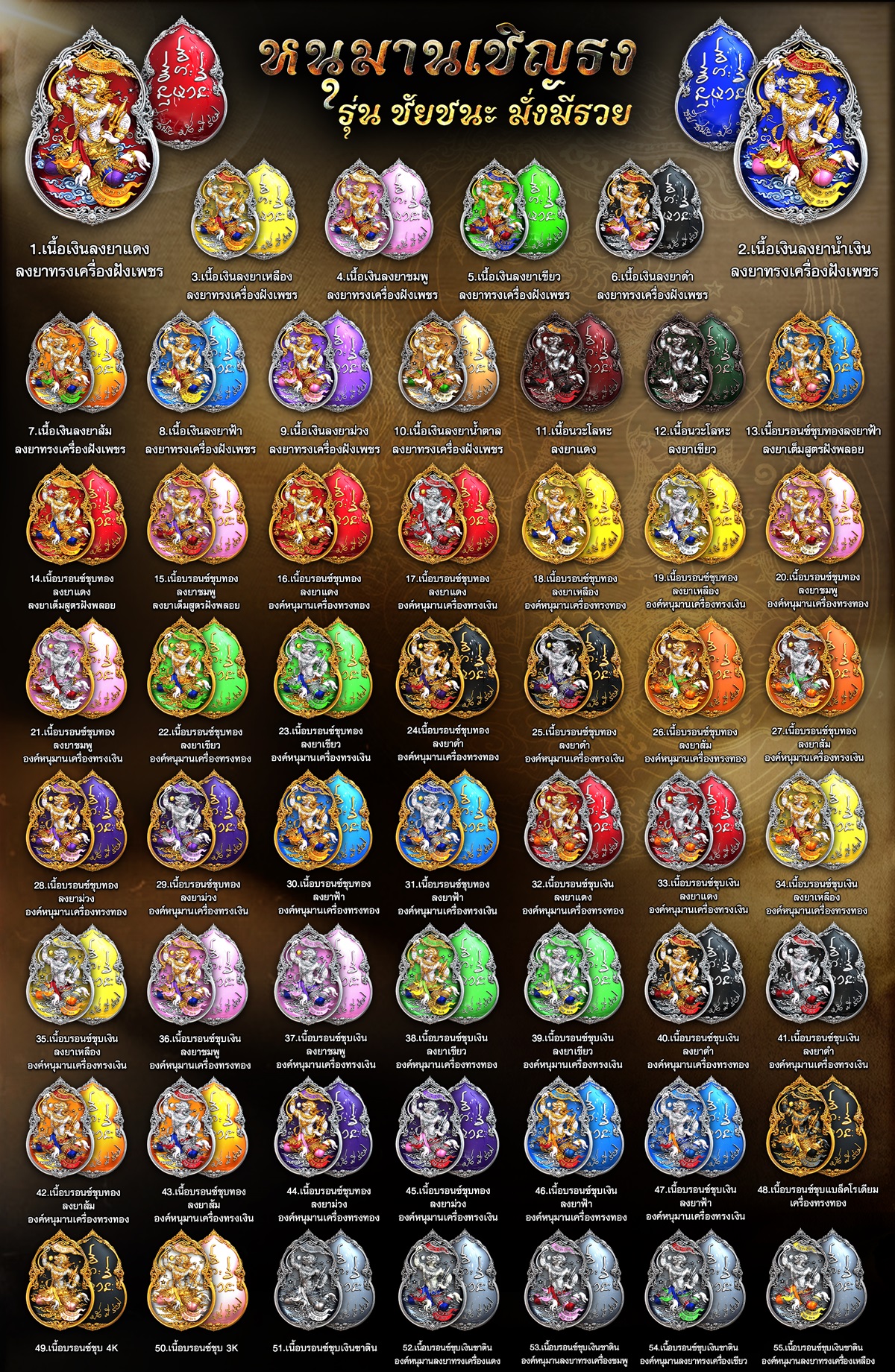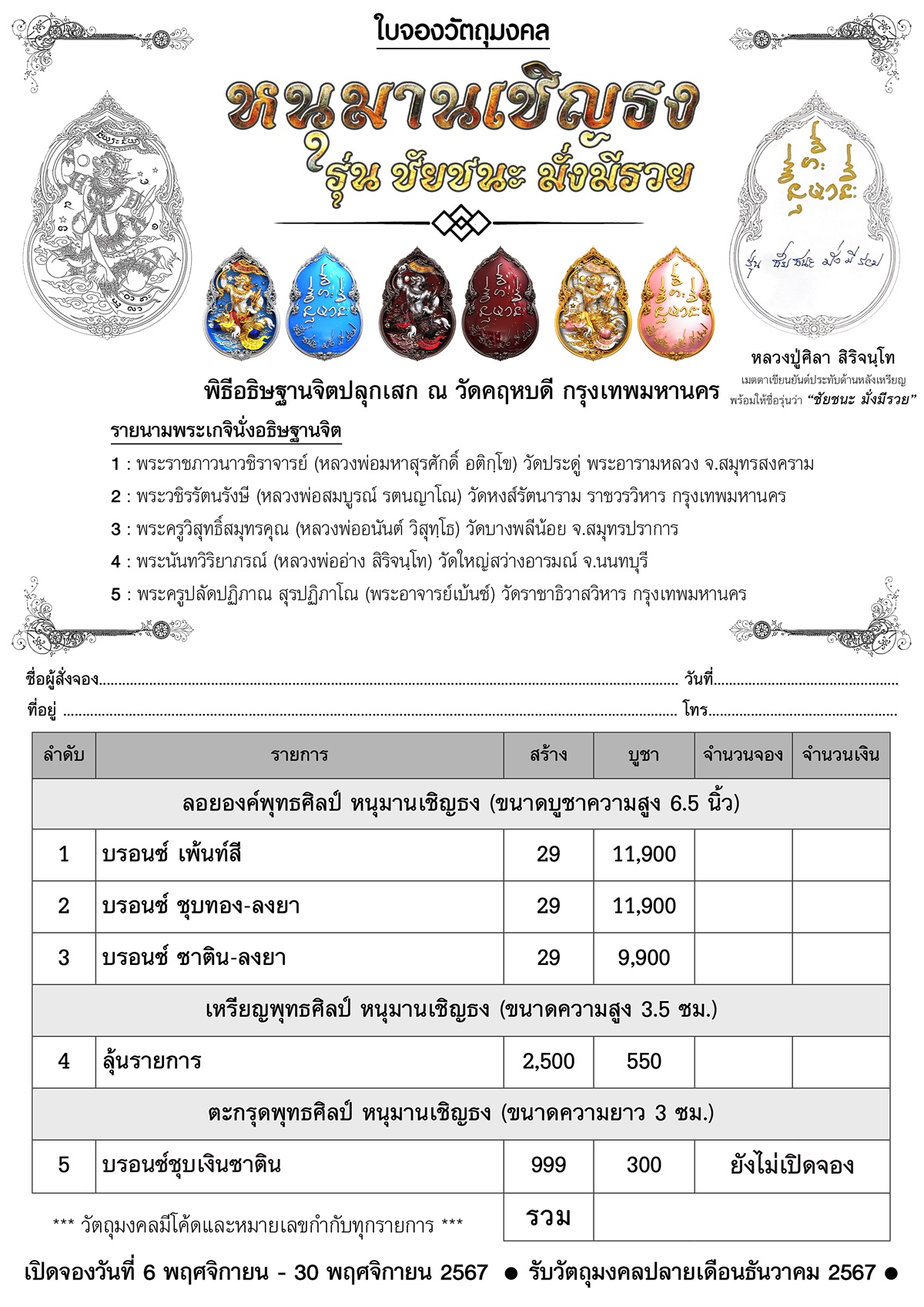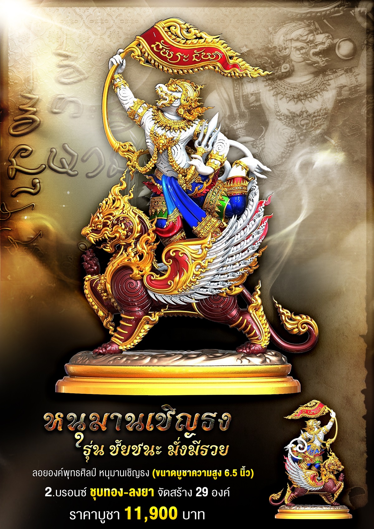 หนุมานเชิญธง รุ่น ชัยชนะมั่งมีรวย ขนาดบูชาความสูง 6.5 นิ้ว จัดสร้าง 3 รายการ รายการละ 29 องค์ ภาพรายการอย่างเป็นทางการ หลวงปู่ศิลา สิริจนฺโท เมตตาเขียนยันต์ประทับด้านหลังเหรียญ พร้อมให้ชื่อรุ่นว่า “ ชัยชนะ มั่งมีรวย ” พิธีอธิษฐานจิตปลุกเสก ณ วัดคฤหบดี กรุงเทพมหานคร รายนามพระเกจินั่งอธิษฐานจิต 1 : พระราชภาวนาวชิราจารย์ (หลวงพ่อมหาสุรศักดิ์ อติกฺโข) วัดประดู่ พระอารามหลวง จ.สมุทรสงคราม 2 : พระวชิรรัตนรังษี (หลวงพ่อสมบูรณ์ รตนญาโณ) วัดหงส์รัตนาราม ราชวรวิหาร กรุงเทพมหานคร 3 : พระครูวิสุทธิ์สมุทรคุณ (หลวงพ่ออนันต์ วิสุทฺโธ) วัดบางพลีน้อย จ.สมุทรปราการ 4 : พระนันทวิริยาภรณ์ (หลวงพ่ออ่าง สิริจนฺโท) วัดใหญ่สว่างอารมณ์ จ.นนทบุรี 5 : พระครูปลัดปฏิภาณ สุรปฏิภาโณ (พระอาจารย์เบ้นซ์) วัดราชาธิวาสวิหาร กรุงเทพมหานคร #ขวัญพระเครื่อง #ขวัญธานันท์พระเครื่อง