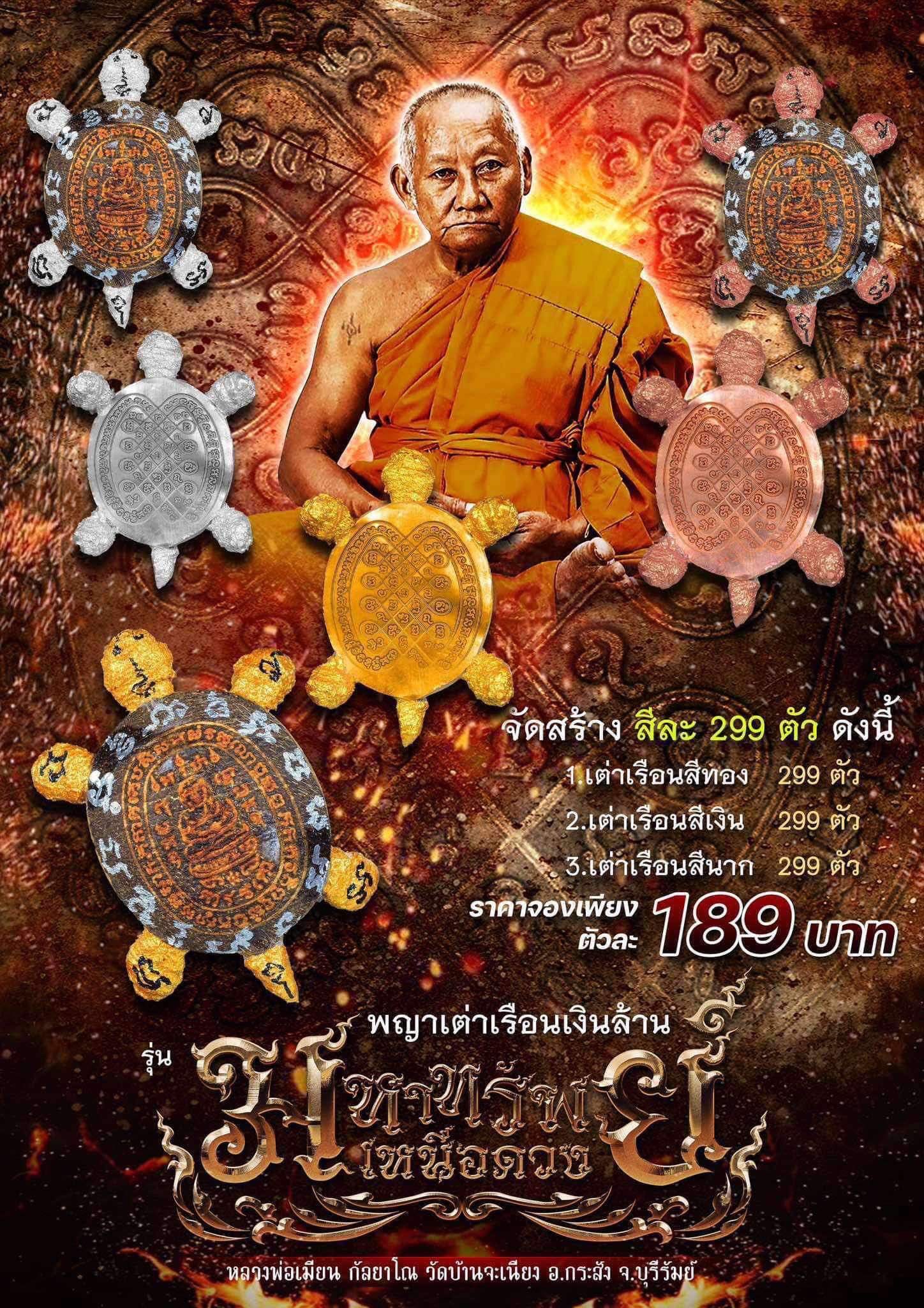 พญาเต่าเรือนเงินล้าน รุ่น มหาทรัพย์เหนือดวง หลวงพ่อเมียน กัลยาโณ วัดบ้านจะเนียง อ.กระสัง จ.บุรีรัมย์ จัดสร้าง สีละ 299 ตัว ดังนี้ 1.เต่าเรือนสีทอง 299 ตัว 2.เต่าเรือนสีเงิน 299 ตัว 3.เต่าเรือนสีนาก 299 ตัว ราคาจองเพียง ตัวละ 189 บาท จองครบ 50ตัว เเถมรายการพิเศษ 2ตัว พญาเต่าใช้บูชากันได้ร้อยแปด พุทธคุณพญาเต่าเรือนเป็นที่ร่ำลือในด้านแคล้วคลาดปลอดภัย เมตตามหานิยม ทำมาค้าขายโชคลาภ สู้คดีความ และป้องกันคุณไสยต่างๆ ครอบจักรวาล เสกพร้อมรับพญาเต่าเรือนเดือน ธันวาคม #ขวัญพระเครื่อง #ขวัญธานันท์พระเครื่อง