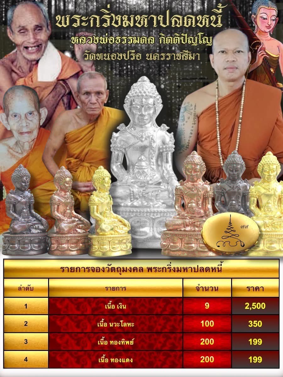 เปิดจองแล้ว พระกริ่งมหาปลดหนี้ วัตถุมงคลสายเมตตา เรียกทรัพย์ ปลดหนี้ เสริมโชค วาระสำคัญ: สมทบทุนสร้างอุโบสถ วัดหนองปรือ ปักธงชัย จ.นครราชสีมา ปลุกเสกโดย หลวงพ่อธรรมดล กิตติปัญโญ เกจิสายอาคมผู้สืบวิชาสายครูบาอาจารย์ หลวงปู่สรวง เทวดาเล่นดิน หลวงปู่เพ็ชร์ วัดตะคร้อ หลวงปู่นาม วัดน้อยชมภู่ พิธีกรรมเข้มขลัง อธิษฐานจิตเน้นเปิดทางชีวิต เสริมดวงหนุนทรัพย์ ปลดหนี้ปลดกรรม รายการเปิดจอง เนื้อเงิน (สร้าง 9 องค์) — 2,500 บาท เนื้อนวะโลหะ (สร้าง 100 องค์) — 350 บาท เนื้อทองทิพย์ (สร้าง 200 องค์) — 199 บาท เนื้อทองแดง (สร้าง 200 องค์) — 199 บาท รับวัตถุมงคลหลังพิธีเสก