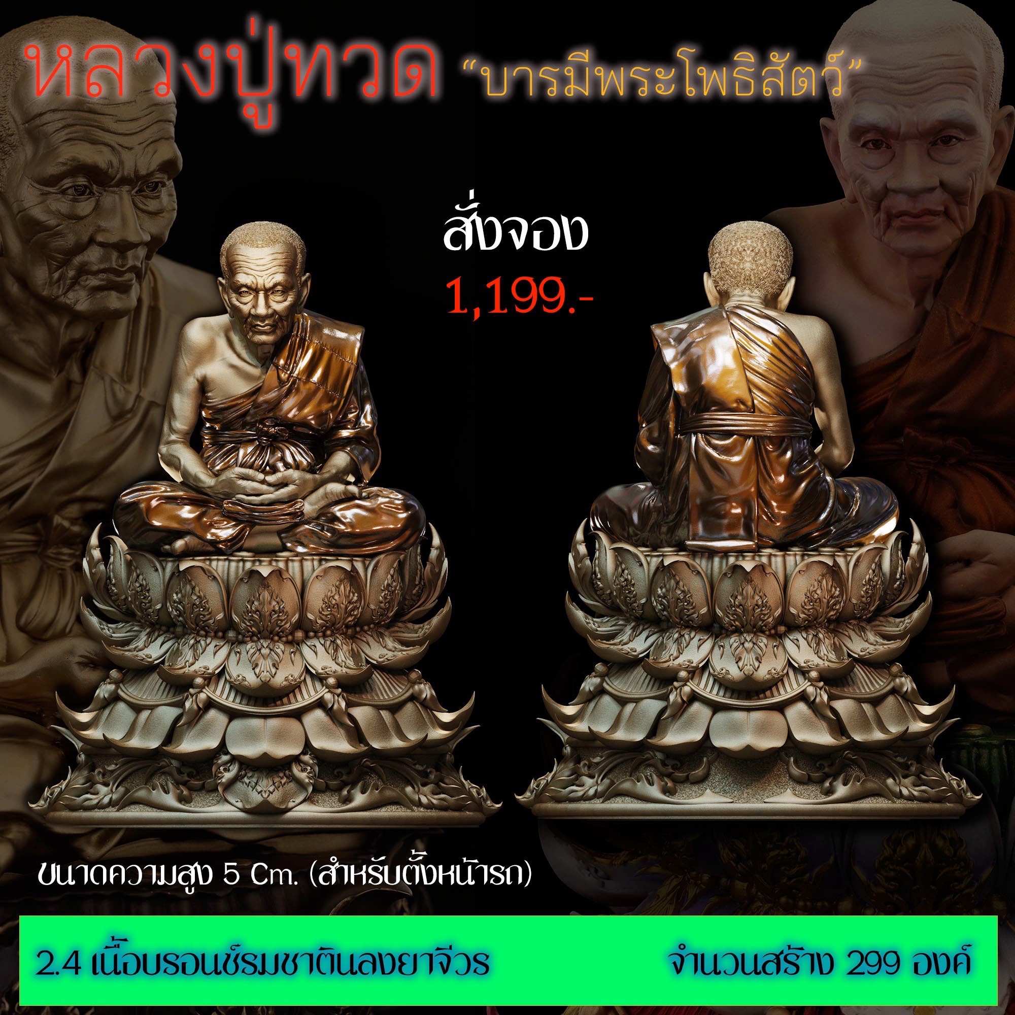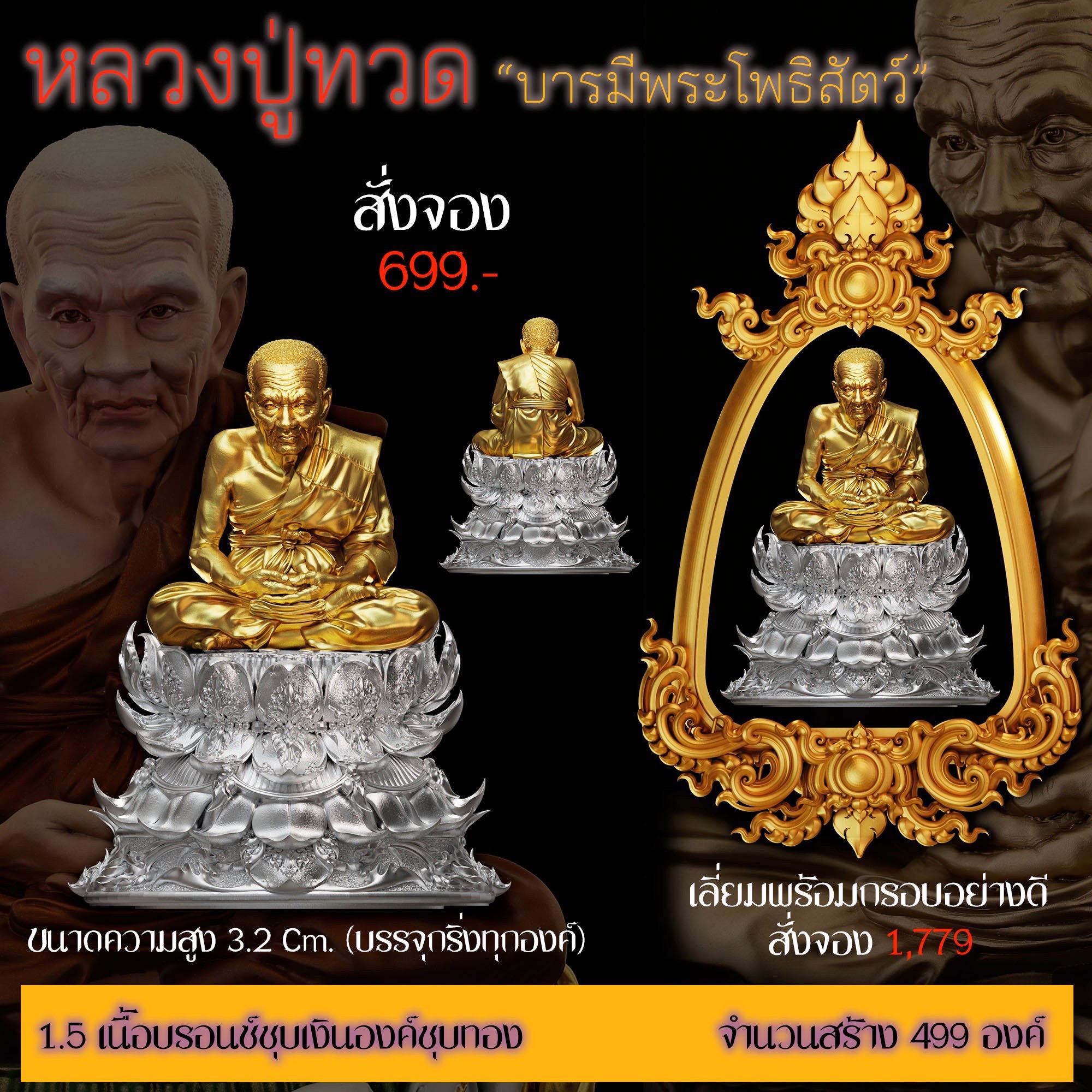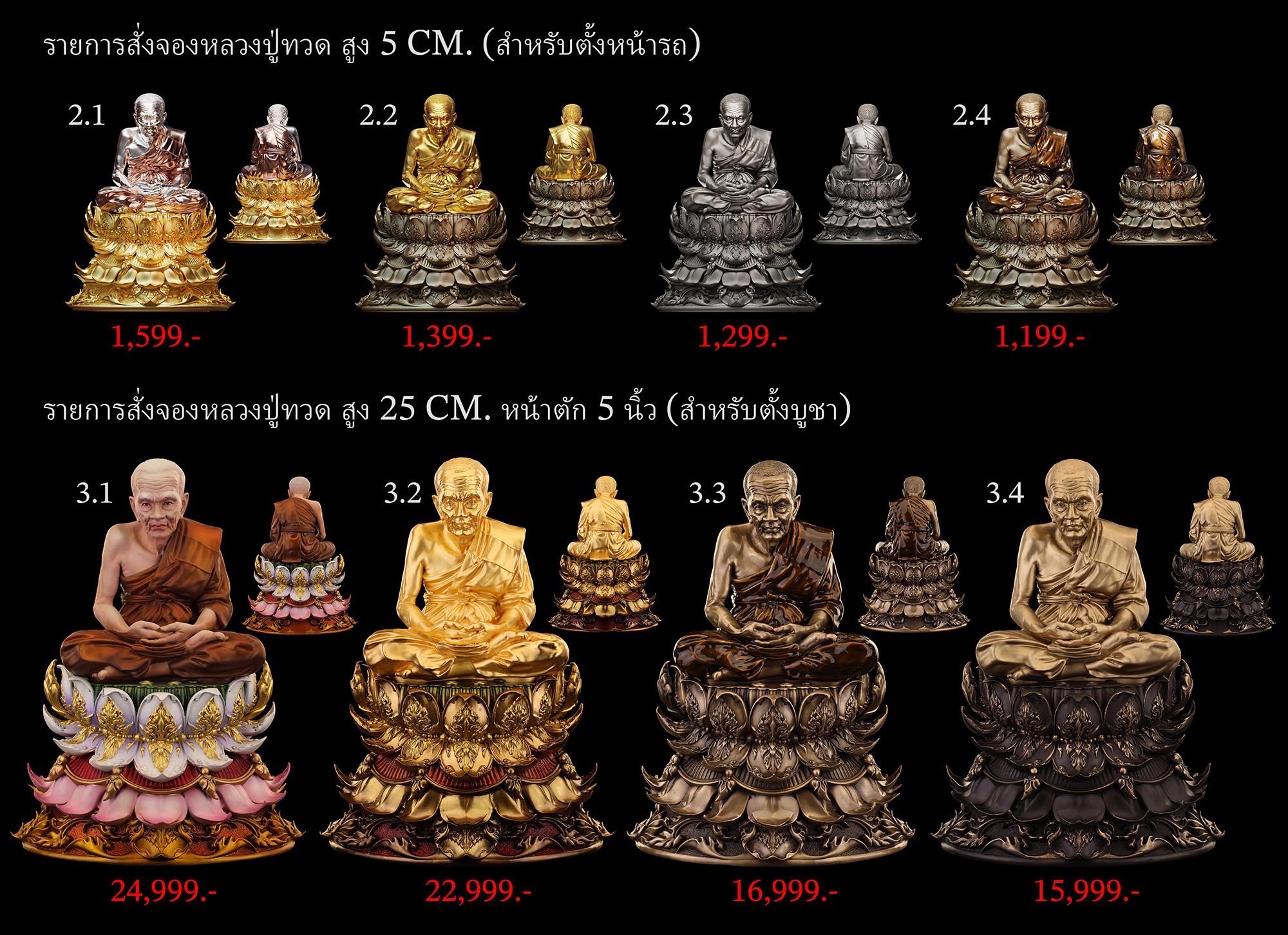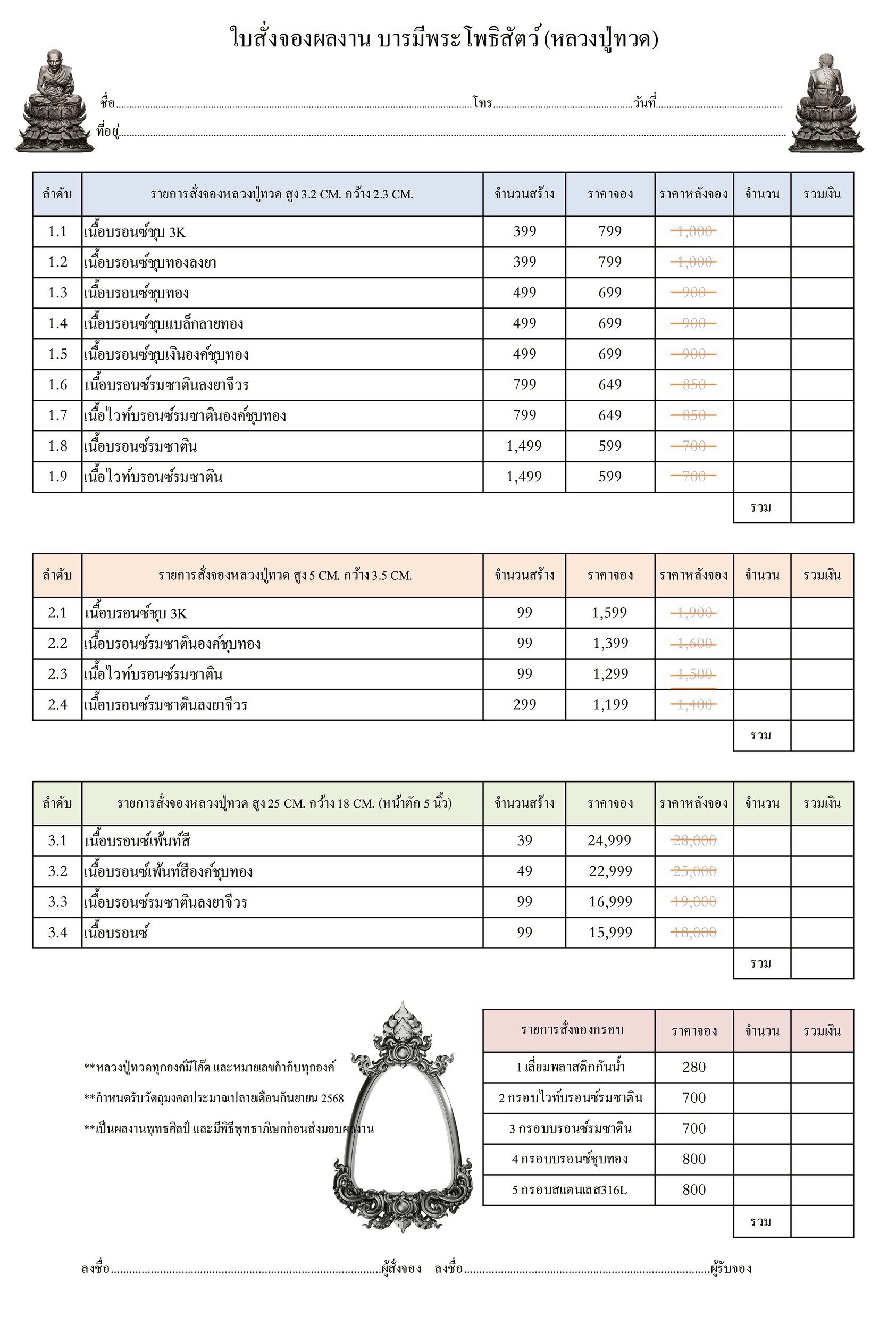 รายละเอียดการสั่งจองผลงาน หลวงปู่ทวด บารมีพระโพธิสัตว์ (รูปและราคาในคอมเมนต์) ขนาดสูง 3.2 Cm. (สำหรับพกพาเป็นจี้สวมใส่) ขนาดสูง 5 Cm. (สำหรับตั้งบูชา หรือตั้งหน้ารถ) ขนาดสูง 25 Cm. (สำหรับตั้งบูชา) ออกแบบลายเส้น : อ.ฉัตรชัย แผ่นผา ประติมากร 3D : ฮีโน่ หล่อด้วยโลหะ : Bronze หล่อโดย : Premium casting jewelry co.,ltd จัดสร้างโดย : พุทธศิลป์สร้างวัด กำหนดรับผลงานพุทธศิลป์ประมาณเดือนปลายเดือนกันยายน 2568 เป็นผลงานพุทธศิลป์ มีพิธีพุทธาภิเษกก่อนส่งมอบผลงาน รายการที่3.3 เนื้อบรอนซ์ซาตินลงยาจีวร ขนาดสูง 25 Cm. (สำหรับตั้งบูชา) ราคาสั่งจอง 16,999.- รายการที่3.4 เนื้อบรอนซ์ ขนาดสูง 25 Cm. (สำหรับตั้งบูชา) ราคาสั่งจอง 15,999.-