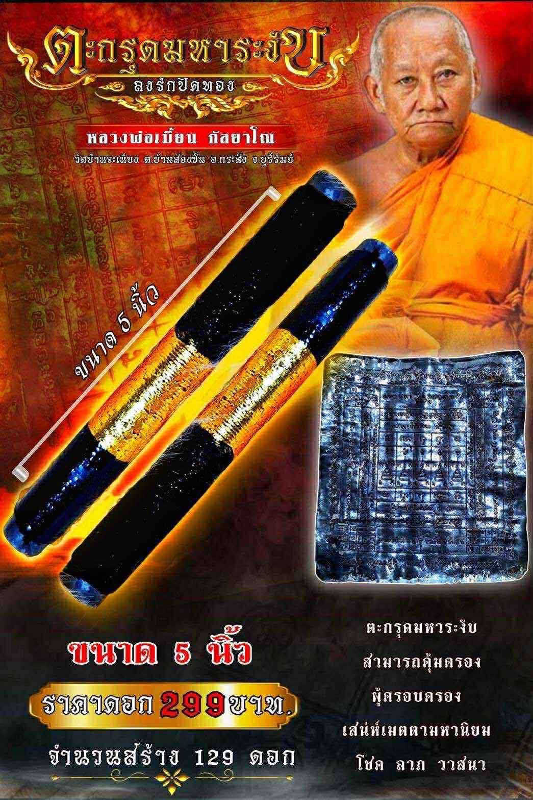 ตะกรุดมหาระงับ ตำหรับวัดประดู่ทรงธรรม สรรพวิชาที่สืบมาแต่ครั้งเมืองกรุงเก่า หลวงพ่อเมียน วัดจะเนียงวนาราม จ.บุรีรัมย์ ขนาดยาว 5 นิ้ว ลงรักปิดทอง ตะกรุดมหาระงับ ยอดตะกรุดแห่งกรุงเก่า เป็นตะกรุดชั้นสูง ชั้นบรมครู ต้นตำหรับ หลวงพ่อกลั่น วัดพระญาติอานุภาพของยันต์มหาระงับนี้วิเศษยิ่งนัก ตะกรุดมหาระงับถือเป็นเครื่องรางของขลังชนิดหนึ่ง ที่ผูกพันกับคติความเชื่อของคนไทยมาช้านาน โดยมีความเชื่อที่ว่าตะกรุดสามารถคุ้มครองผู้ครอบครอง หรือสร้างความมีเสน่ห์เมตตาให้แก่ผู้มาพบเห็นได้ ตะกรุดมหาระงับยังมีพุทธคุณด้านระงับดับภัย โชคร้ายกลายเป็นดี ดับทุกข์โศกหรือเรื่องร้าย มนต์มหาระงับ (ย่อ) ตั้งนะโม ๓ จบ แล้วว่า…”พุทธังศัตรูร้าย นะจังงัง ถอยอย่า นะละสัง พระพุทธังปิด พระธังมังปิด พระสังฆังปิด พระเจ้าแผลงฤทธิ์ ปิดสังวาลชั้น๙ มีเลขโค้ดกำกับทุกองค์ สมทบทุนร่วมพัฒนาเสนาสนะภายในวัดจะเนียงวนาราม จ.บุรีรัมย์ สร้าง 129 องค์เท่านั้น จอง 299 บาท รับวัตถุมงคล กรกฎาคม 68
