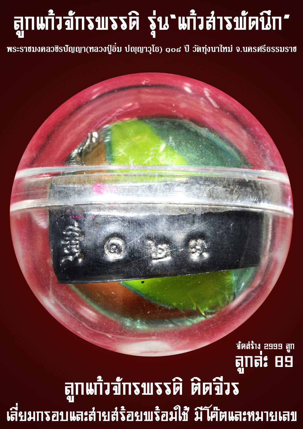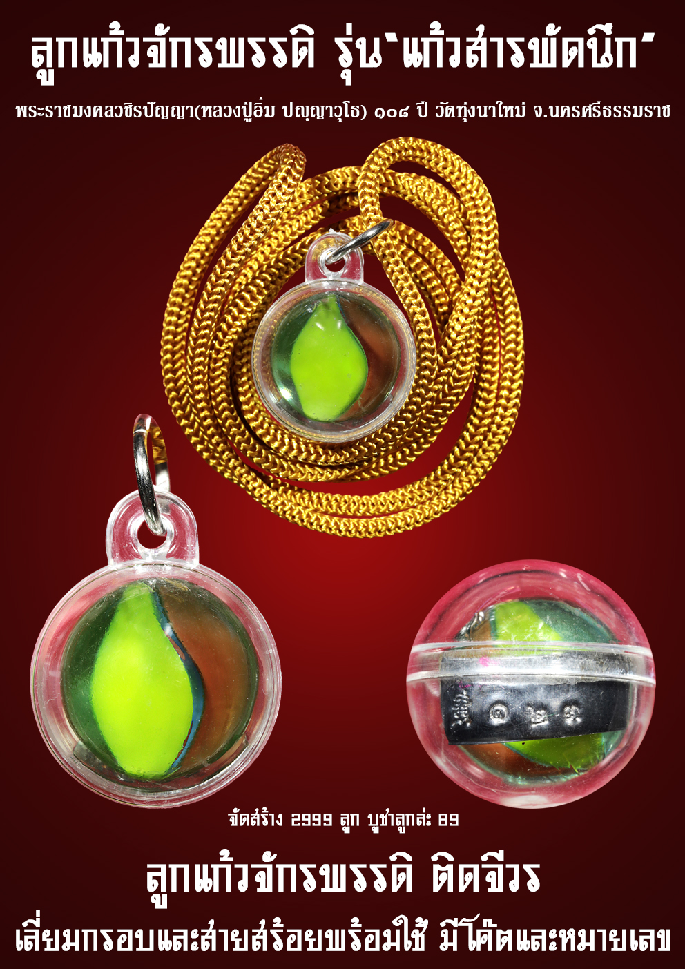 ลูกแก้วจักรพรรดิ รุ่นแรก รุ่น”แก้วสารพัดนึก”พระราชมงคลวชิรปัญญา (หลวงปู่อิ่ม ปญฺญาวุโธ) อายุ ๑๐๘ ปี วัดทุ่งนาใหม่ จ.นครศรีธรรมราช ลูกแก้วจักรพรรดิ ติดจีวร เลี่ยมกรอบและสายสร้อย(เชือกน่ม)พร้อมใช้ จัดสร้าง 2999 บูชา 89 เท่านั้น อานุภาพของลูกแก้วจักรพรรดิ หรือลูกแก้วสารพัดนึก ใครมีไว้ครอบครองประดุจดังมีแก้วสารพัดนึก นึกปรารถนาสิ่งใดสำเร็จทุกประการ มีเทวดาคุ้มครองรักษาอยู่ตลอดเวลา เป็นสื่อมงคลในการเรียนทรัพย์รับโชคดึงดูดสิ่งที่ดีที่เป็นมงคลเข้ามาในชีวิตป้องกันสิ่งไม่ดีทั้งหมด ปรับแก้ดวงชะตาที่ตกให้สูงที่สูงสูงยิ่งๆขึ้นไป อธิษฐานเป็นน้ำมนต์รักษาโรคภัยที่รักษาด้วยเครื่องมือทางวิทยาศาสตร์ไม่หายได้ เป็นสื่อในการปรับพลังงานที่ไม่ดีตามสถานที่ต่างๆที่ลูกแก้วไปสถิตประดิษฐานอยู่ เป็นสื่อในการเจริญพระกรรมฐานทำให้จิตใจสงบนิ่งเข้าสมาธิได้เร็วแล้วไว ประดุจมีครูบาอาจารย์สั่งสอบอบรมสอบอารมณ์อยู่ตลอดเวลา เปิดจอง 18-06-68 รับวัตถุมงคลเดือนสิงหาคม