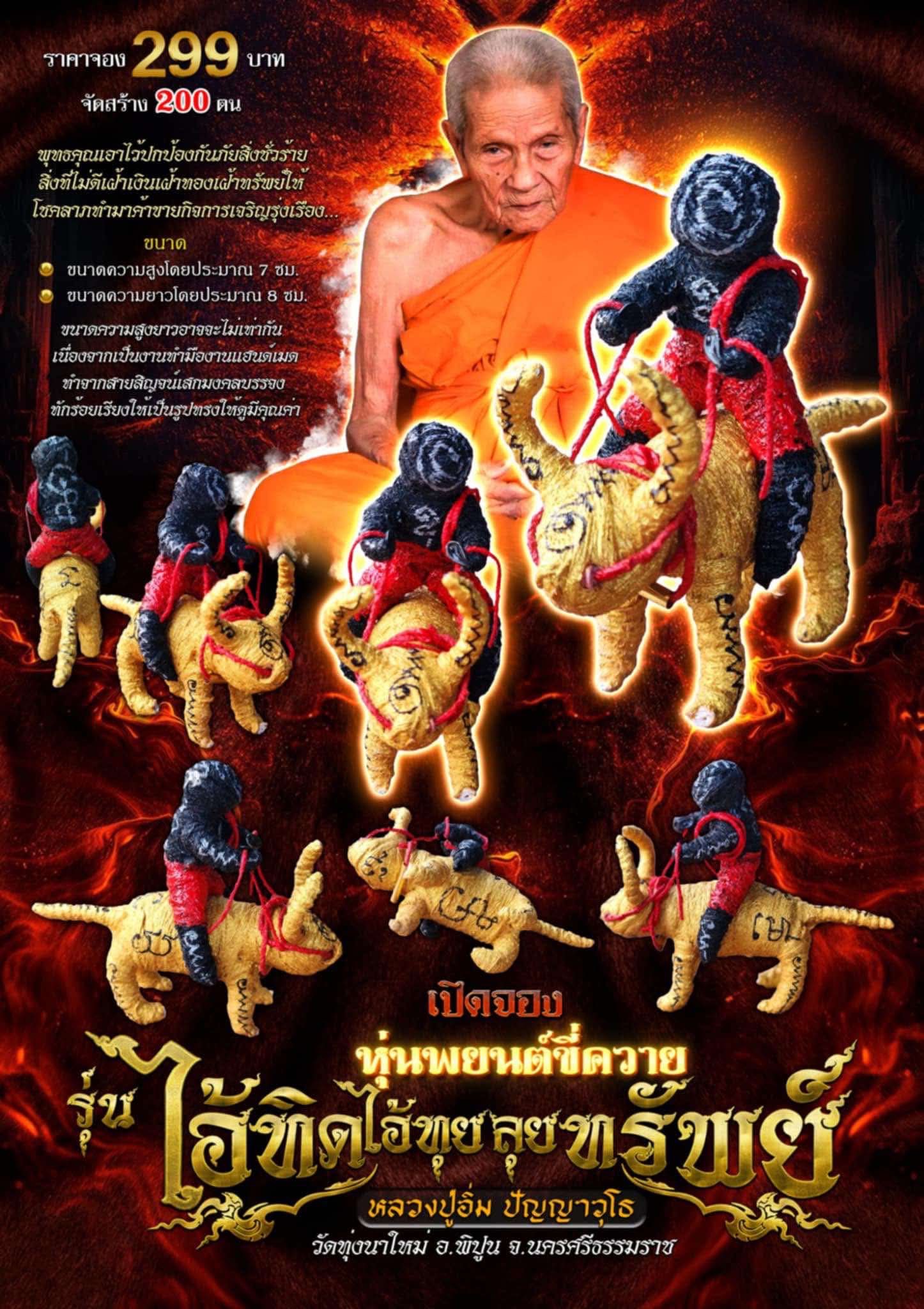 เปิดจองหุ่นพยนต์ขี่ควาย รุ่น ไอ้ทิดไอ้ทุยลุยทรัพย์ หลวงปู่อิ่ม ปัญญาวุโธ วัดทุ่งนาใหม่ อ.พิปูน จ.นครศรีธรรมราช ราคาจอง 299 บ. ขนาดความสูงโดยประมาณ 7 ซม. ขนาดความยาวโดยประมาณ 8 ซม. ขนาดความสูงยาวอาจจะไม่เท่ากันเนื่องจากเป็นงานทำมืองานแฮนด์เมด ทำจากสายสิญจน์เสกมงคลบรรจงทักร้อยเรียงให้เป็นรูปทรงให้ดูมีคุณค่า พุทธคุณเอาไว้ปกป้องกันภัยสิ่งชั่วร้ายสิ่งที่ไม่ดีเฝ้าเงินเฝ้าทองเฝ้าทรัพย์ให้โชคลาภทำมาค้าขายกิจการเจริญรุ่งเรือง