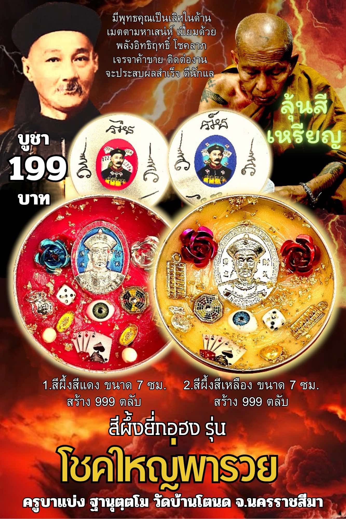 สีผึ้งยี่กอฮง รุ่น โชคใหญ่พารวย ครูบาแบ่ง ฐานุตฺตโม มีรายการดังนี้ ราคาจอง 199 บาท รายการที่1 สีแดง ขนาด7ซม.(ใหญ่) รายการที่2 สีเหลือง ขนาด7ซม.(ใหญ่) สร้างแบบละ 999 ตลับ ลุ้นสีเหรียญ รับพระเดือน สิงหาคม มีเลขโค้ดกำกับทุกองค์ วัตถุประสงค์:ร่วมพัฒนาวัดโตนด นครราชสีมา