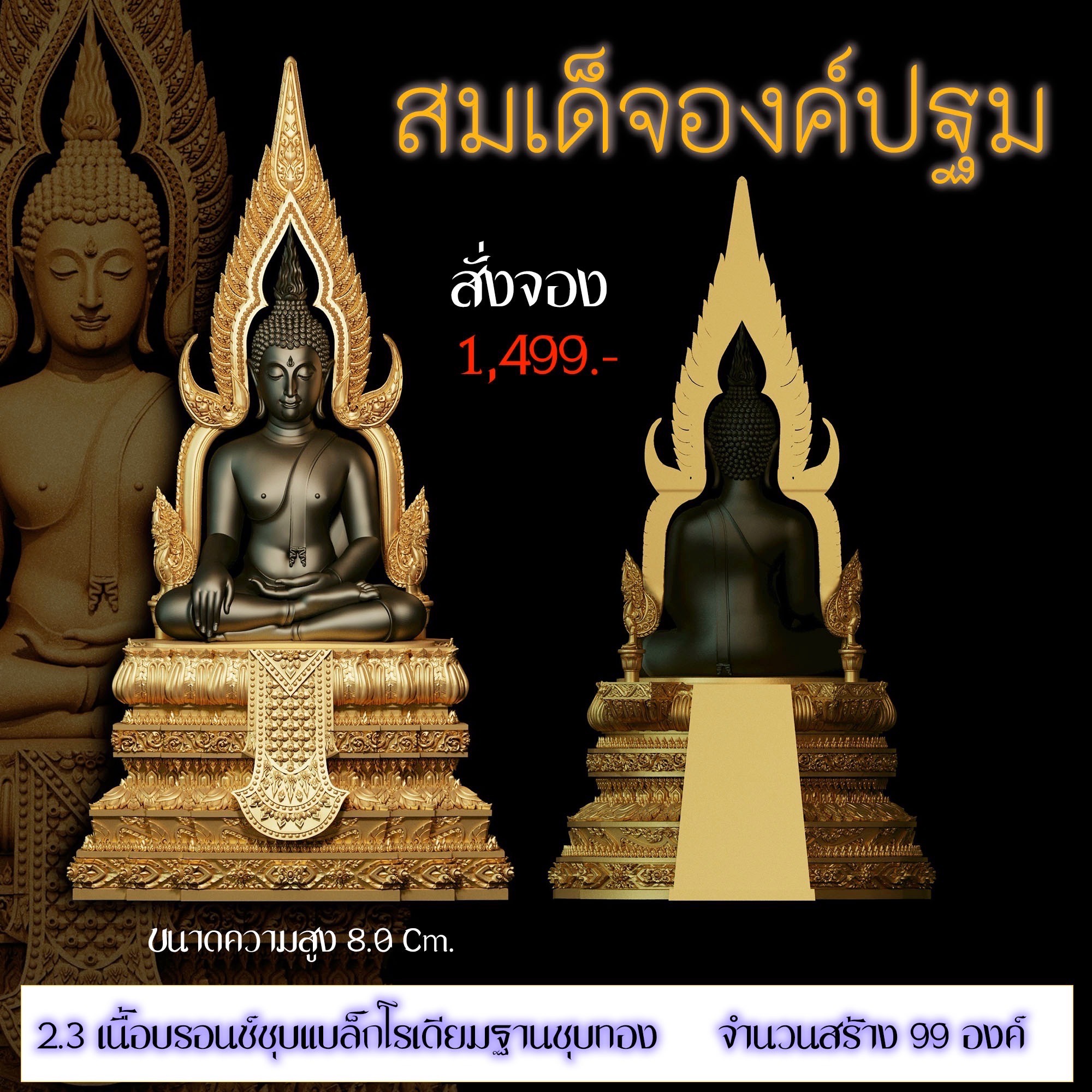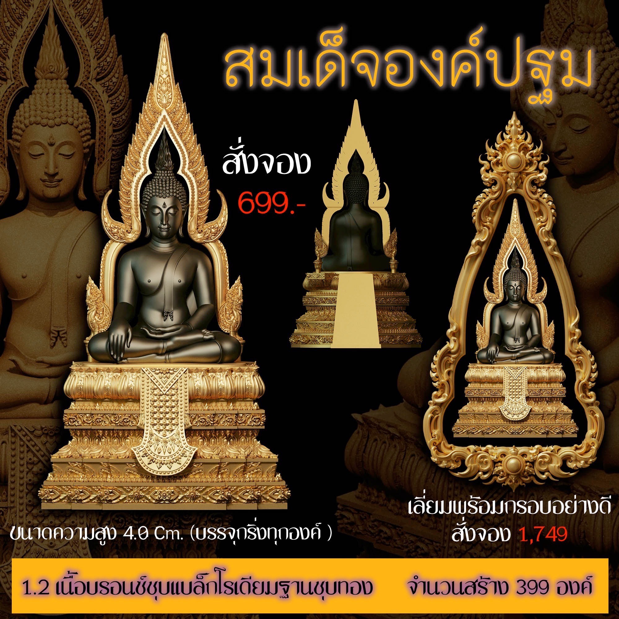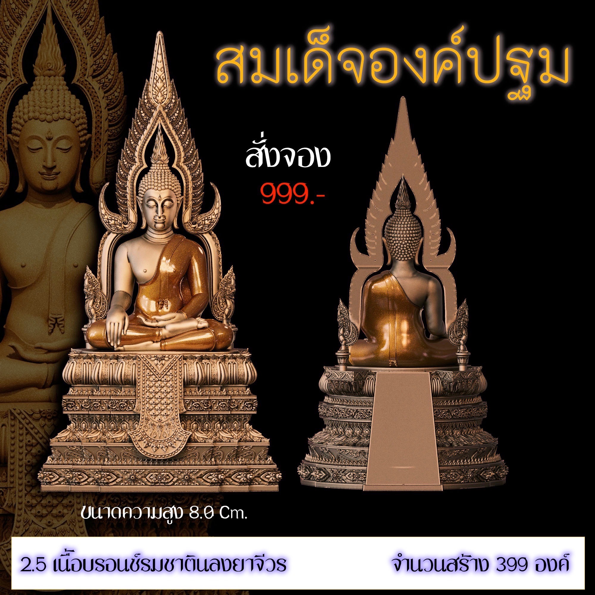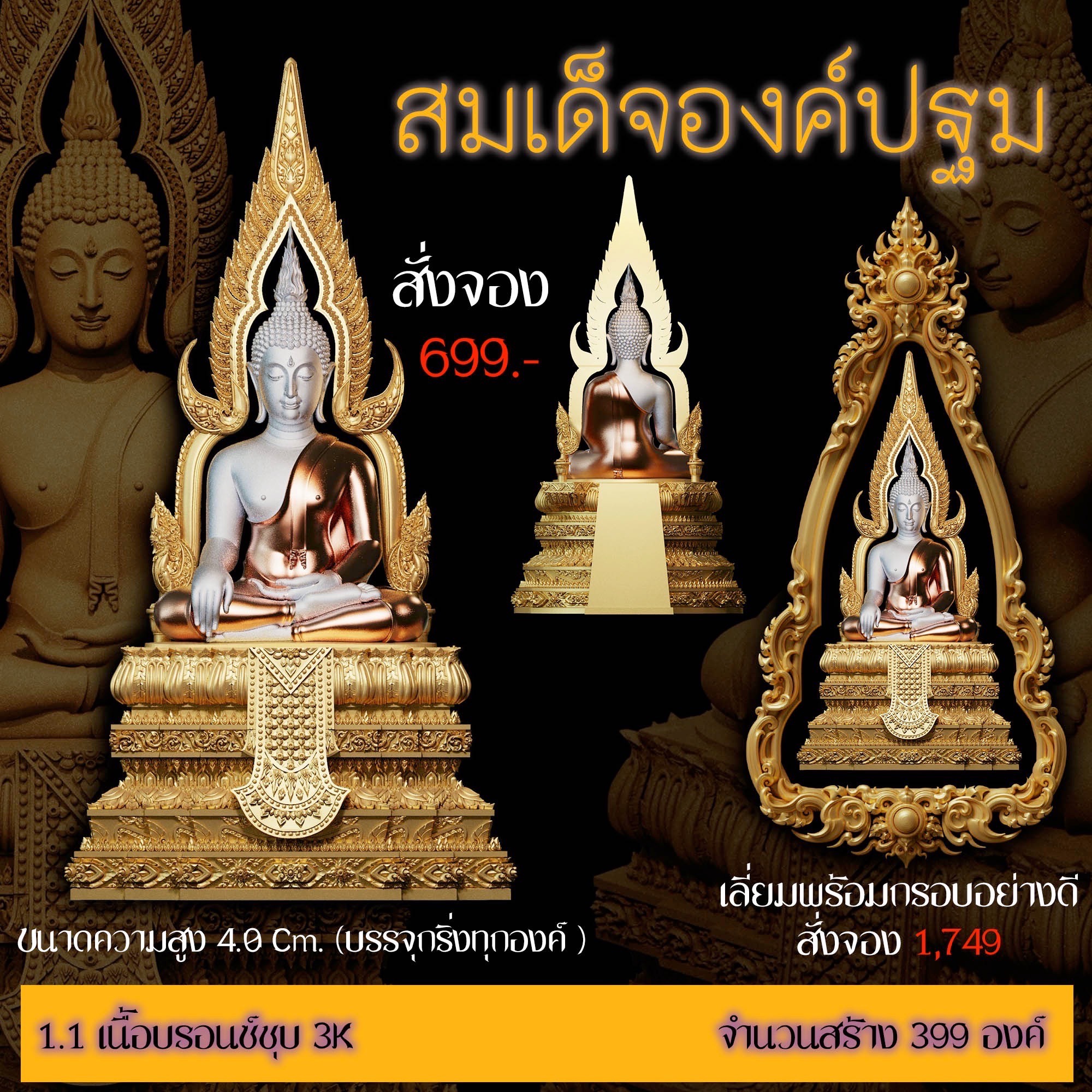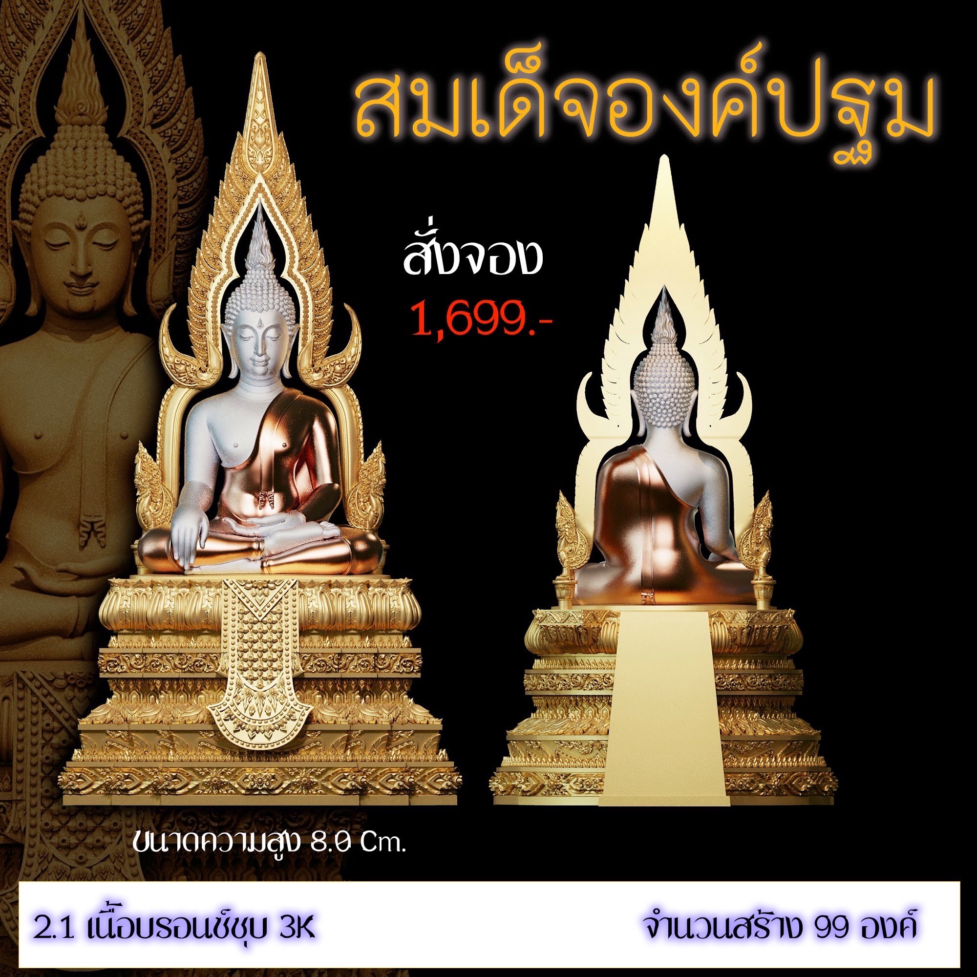 เปิดสั่งจอง สมเด็จองค์ปฐม รายละเอียด ขนาดสูง 4.0 Cm. (สำหรับสวมคอ) ขนาดสูง 8.0 Cm. (สำหรับตั้งหน้ารถ) กำหนดการจัดส่ง ปลายเดือนตุลาคม 2568 มีพิธีพุทธาภิเษกก่อนส่งมอบผลงาน มีแพ็คเกจสวยหรูงดงามทุกองค์