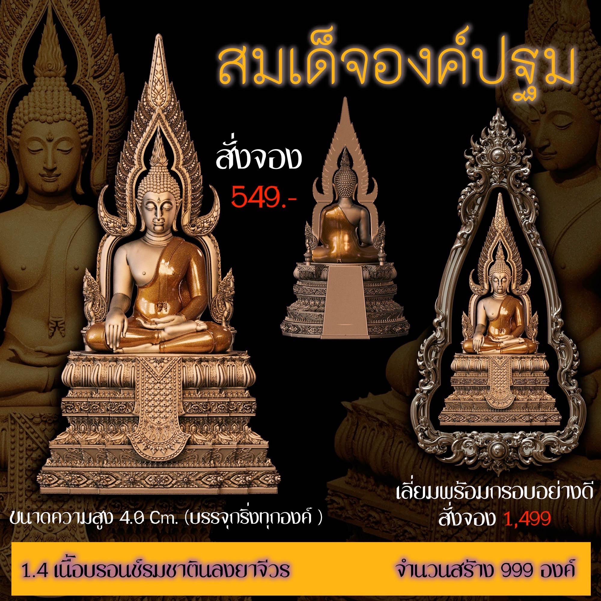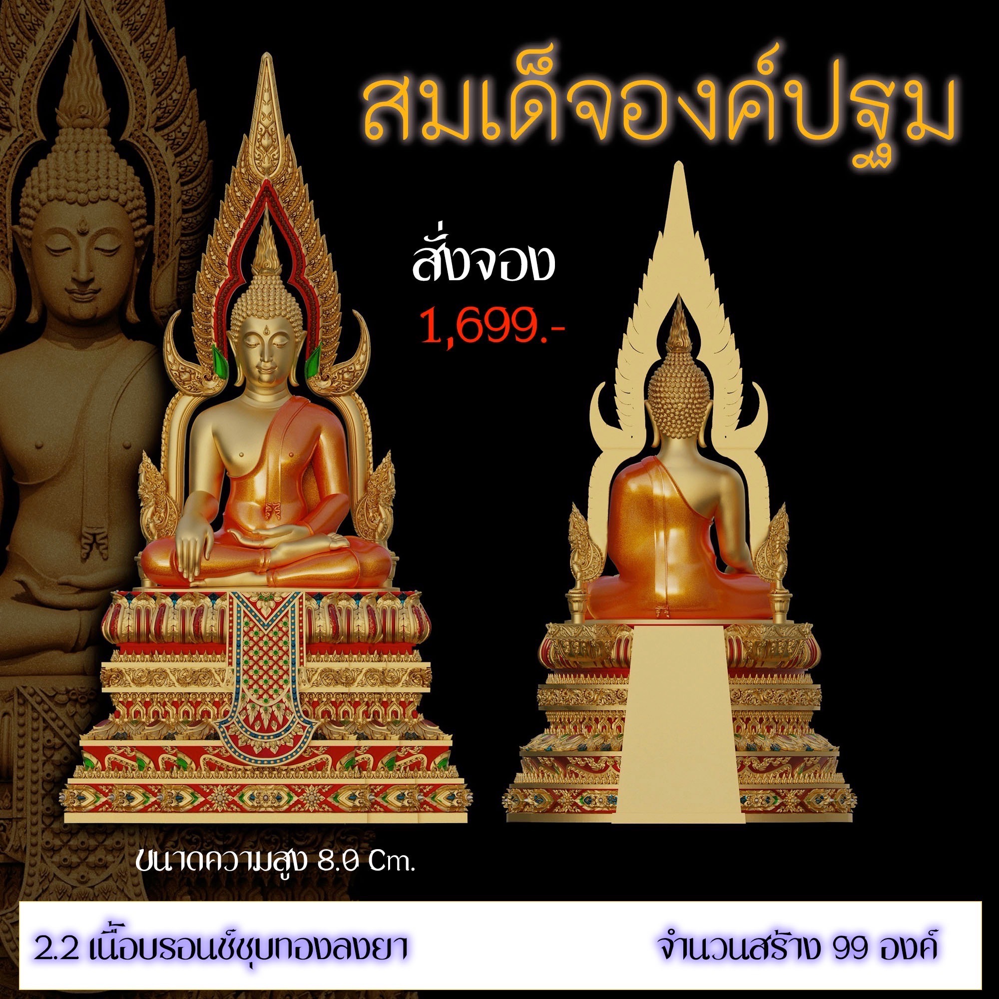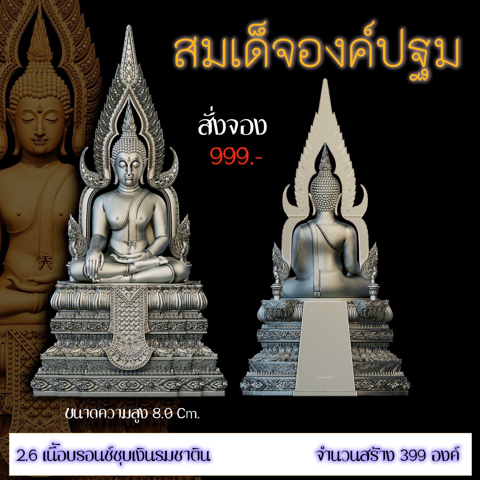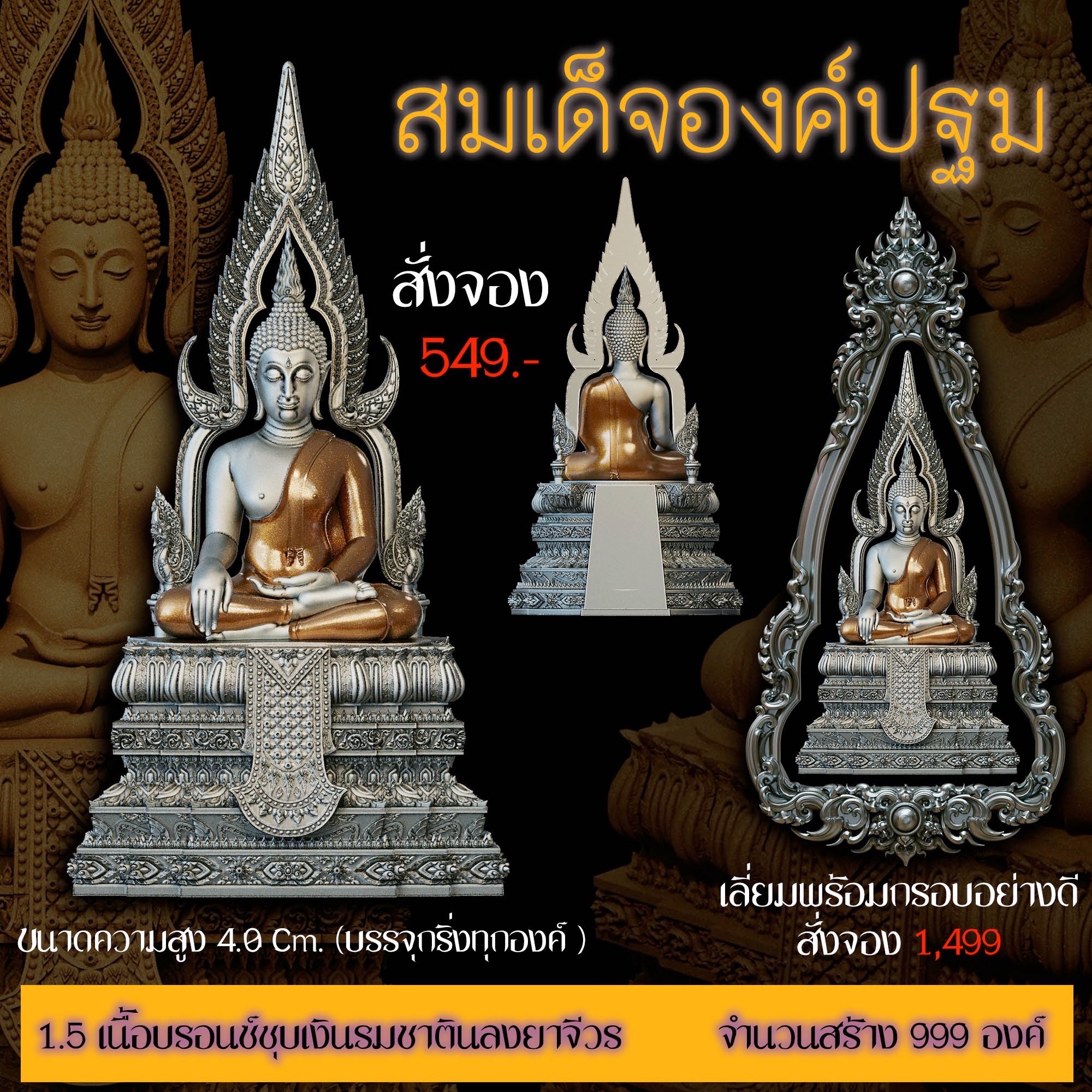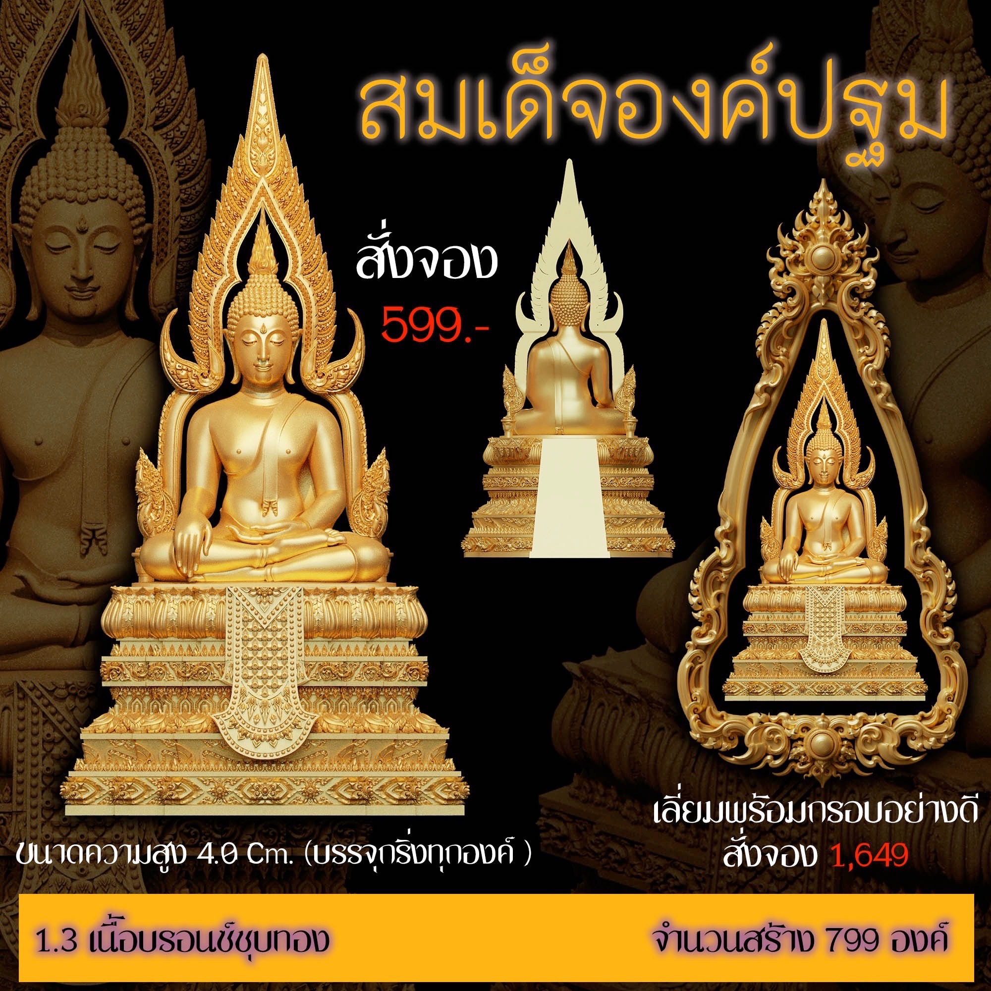 เปิดสั่งจอง สมเด็จองค์ปฐม รายละเอียด ขนาดสูง 4.0 Cm. (สำหรับสวมคอ) ขนาดสูง 8.0 Cm. (สำหรับตั้งหน้ารถ) กำหนดการจัดส่ง ปลายเดือนตุลาคม 2568 มีพิธีพุทธาภิเษกก่อนส่งมอบผลงาน มีแพ็คเกจสวยหรูงดงามทุกองค์
