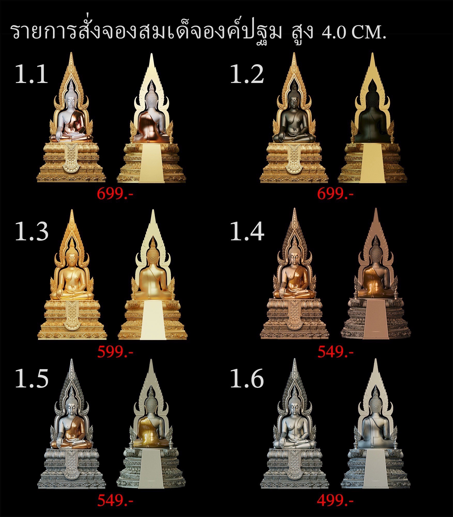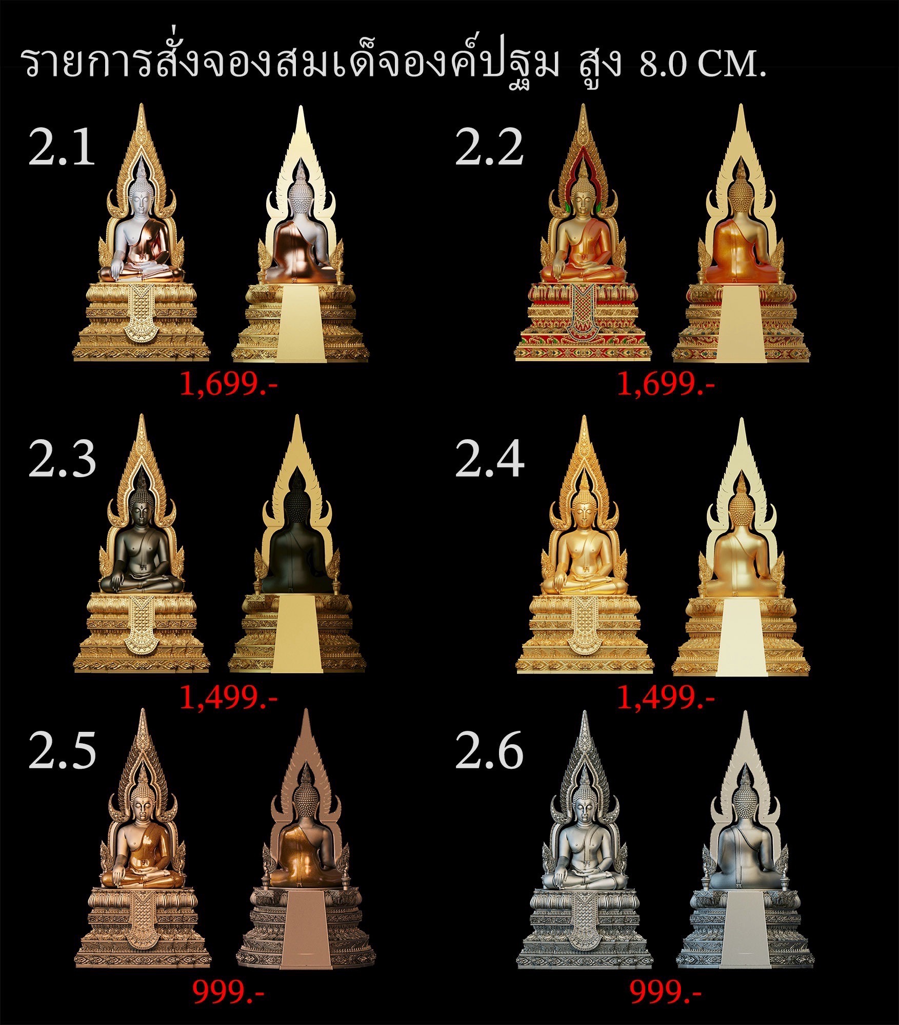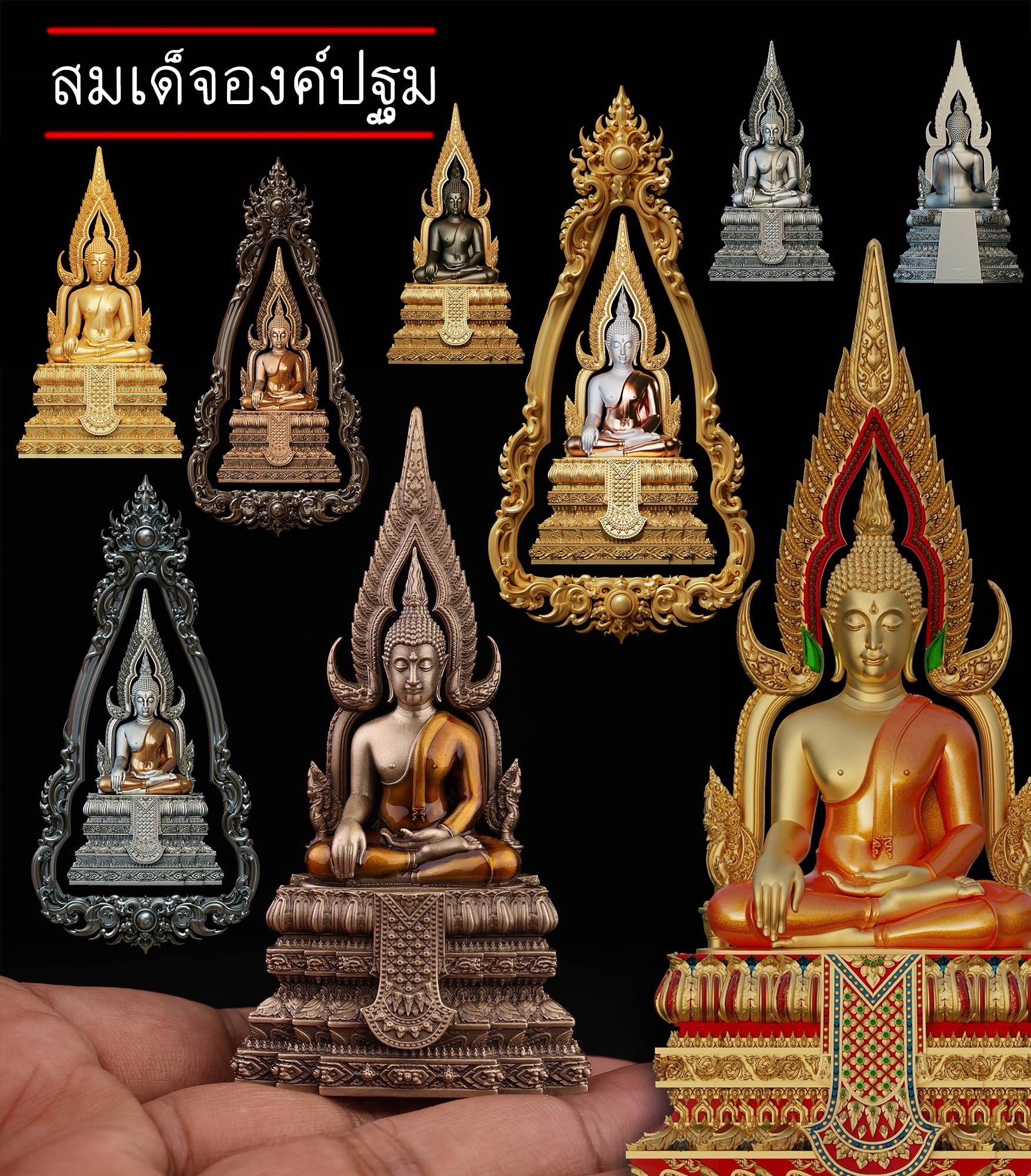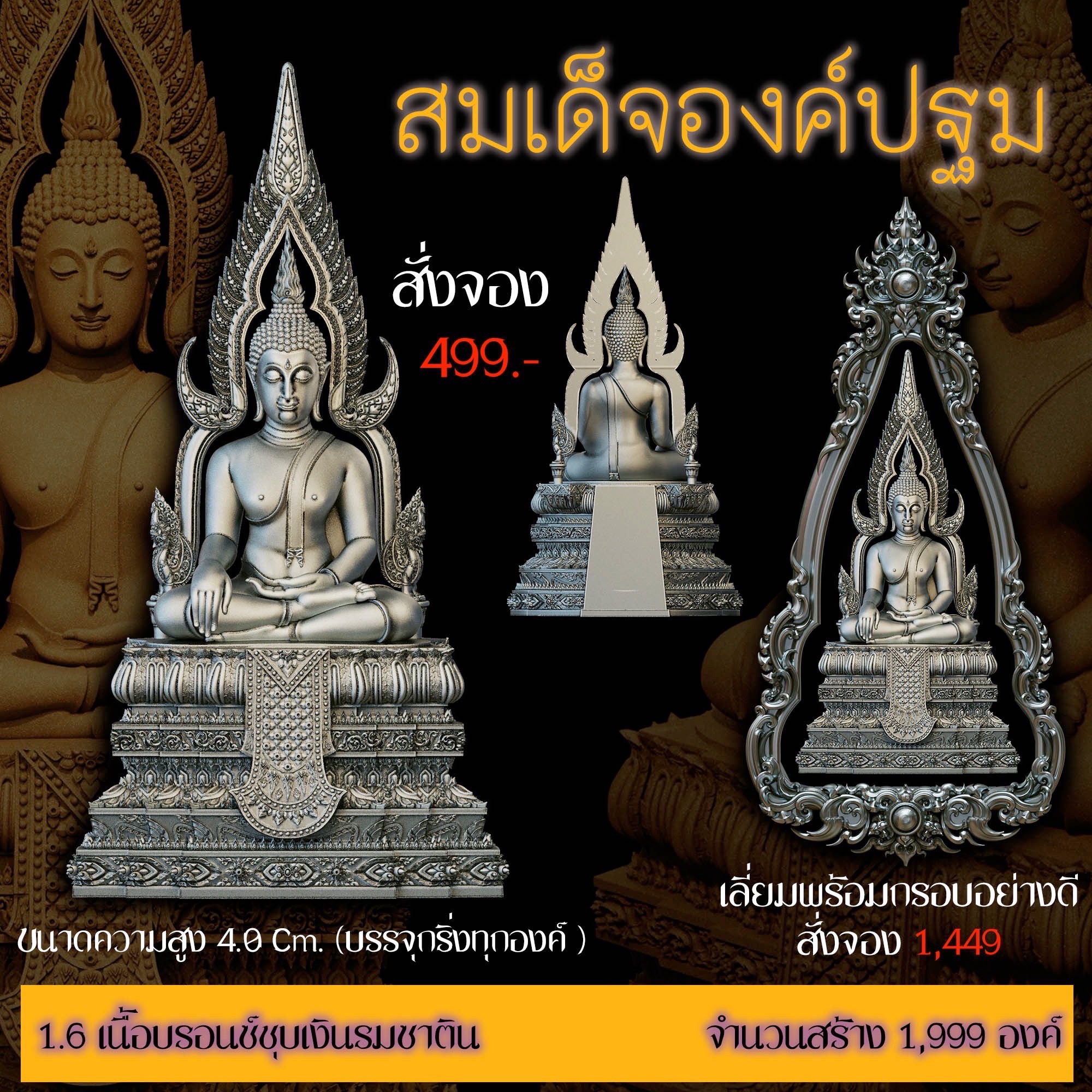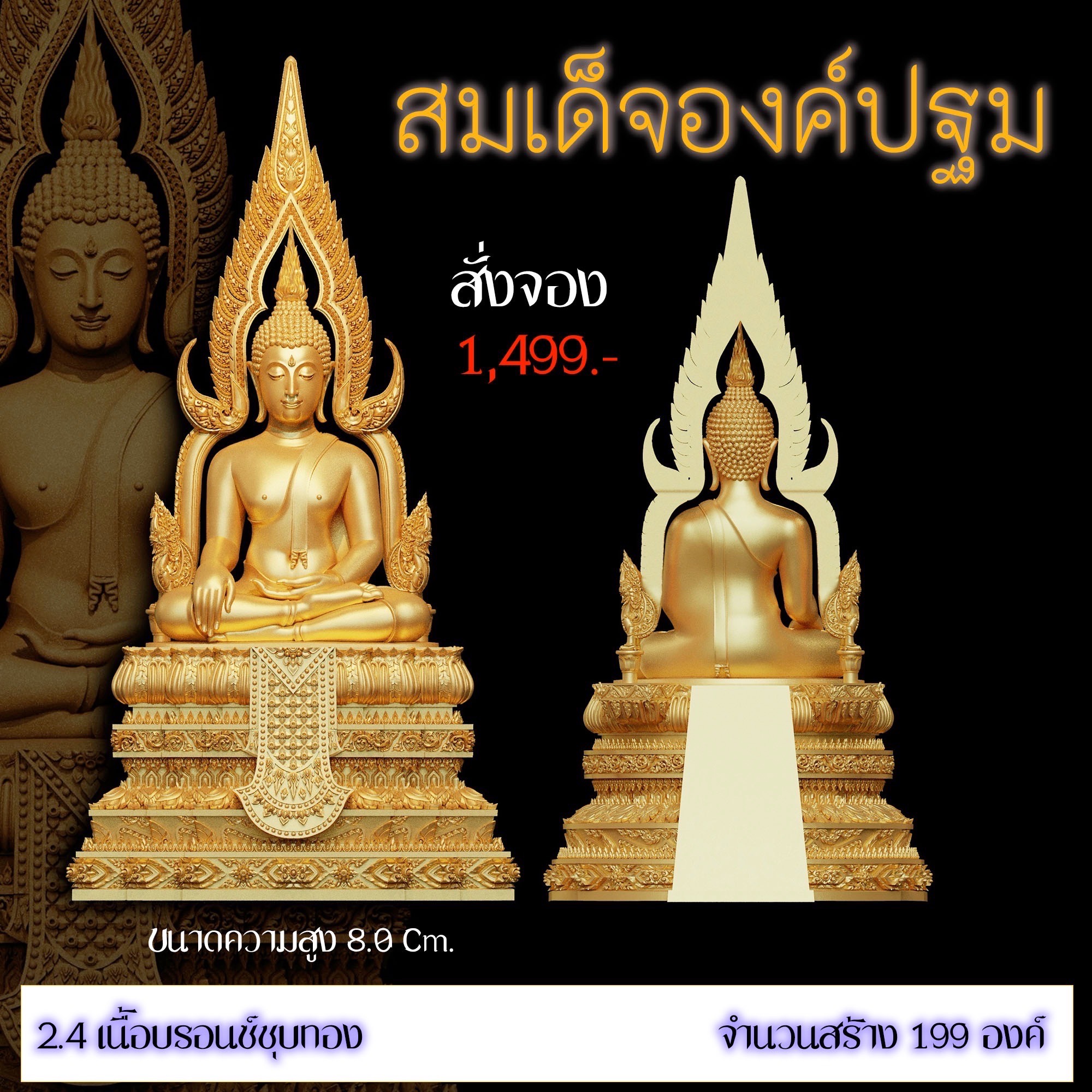 เปิดสั่งจอง สมเด็จองค์ปฐม รายละเอียด ขนาดสูง 4.0 Cm. (สำหรับสวมคอ) ขนาดสูง 8.0 Cm. (สำหรับตั้งหน้ารถ) กำหนดการจัดส่ง ปลายเดือนตุลาคม 2568 มีพิธีพุทธาภิเษกก่อนส่งมอบผลงาน มีแพ็คเกจสวยหรูงดงามทุกองค์