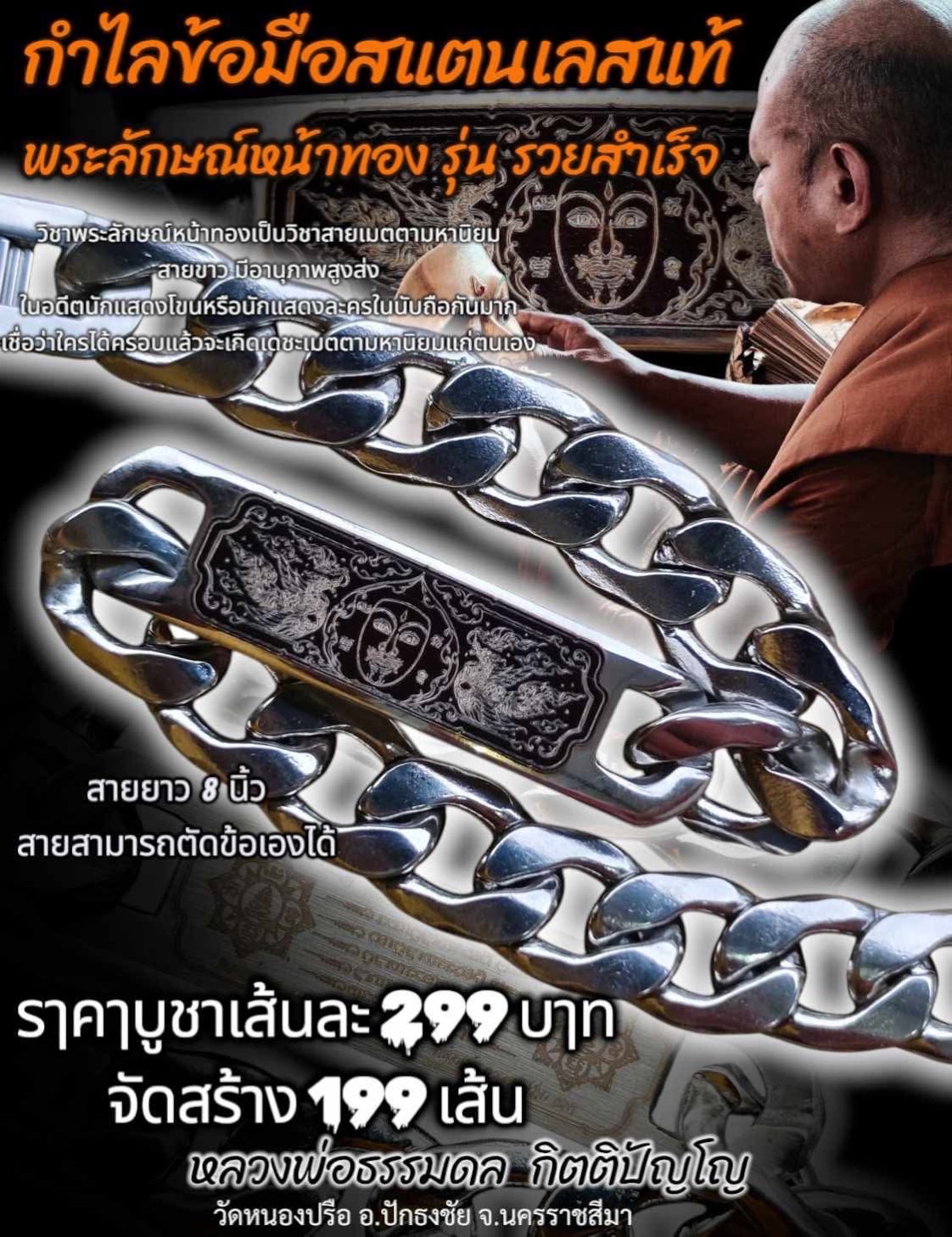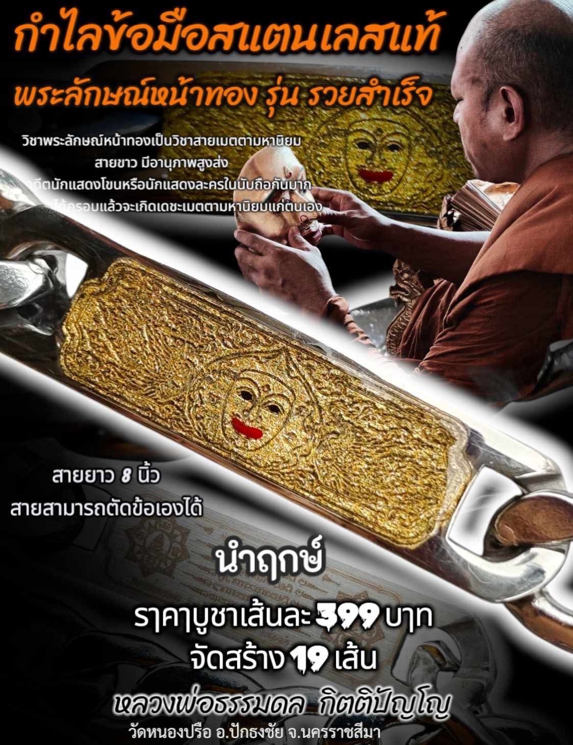 กำไลข้อมือสแตนเลสแท้ พระลักษณ์หน้าทอง รุ่น รวยสำเส็จ ผ่านการปลุกเสกโดย หลวงพ่อธรรมดล กิตติปัญโญ พระเกจิสายเข้มแห่งปักธงชัย ผู้มากด้วยญาณวิถี วิชาพระลักษณ์หน้าทองเป็นวิชาสายเมตตามหานิยม สายขาว มีอานุภาพสูงส่ง ในอดีตนักแสดงโขนหรือนักแสดงละครในนับถือกันมาก เชื่อว่าใครได้ครอบแล้วจะเกิดเดชะเมตตามหานิยม 1.รายการพิเศษ – นำฤกษ์ กำไลข้อมือ ลงสีทอง บูชาเส้นละ 399 บาท จัดสร้างเพียง 19 เส้น 2.กำไลข้อมือ ดำ บูชาเส้นละ 299 บาท จัดสร้าง 199 เส้น ขนาดสายยาว 8 นิ้ว สายสามารถตัดเองได้