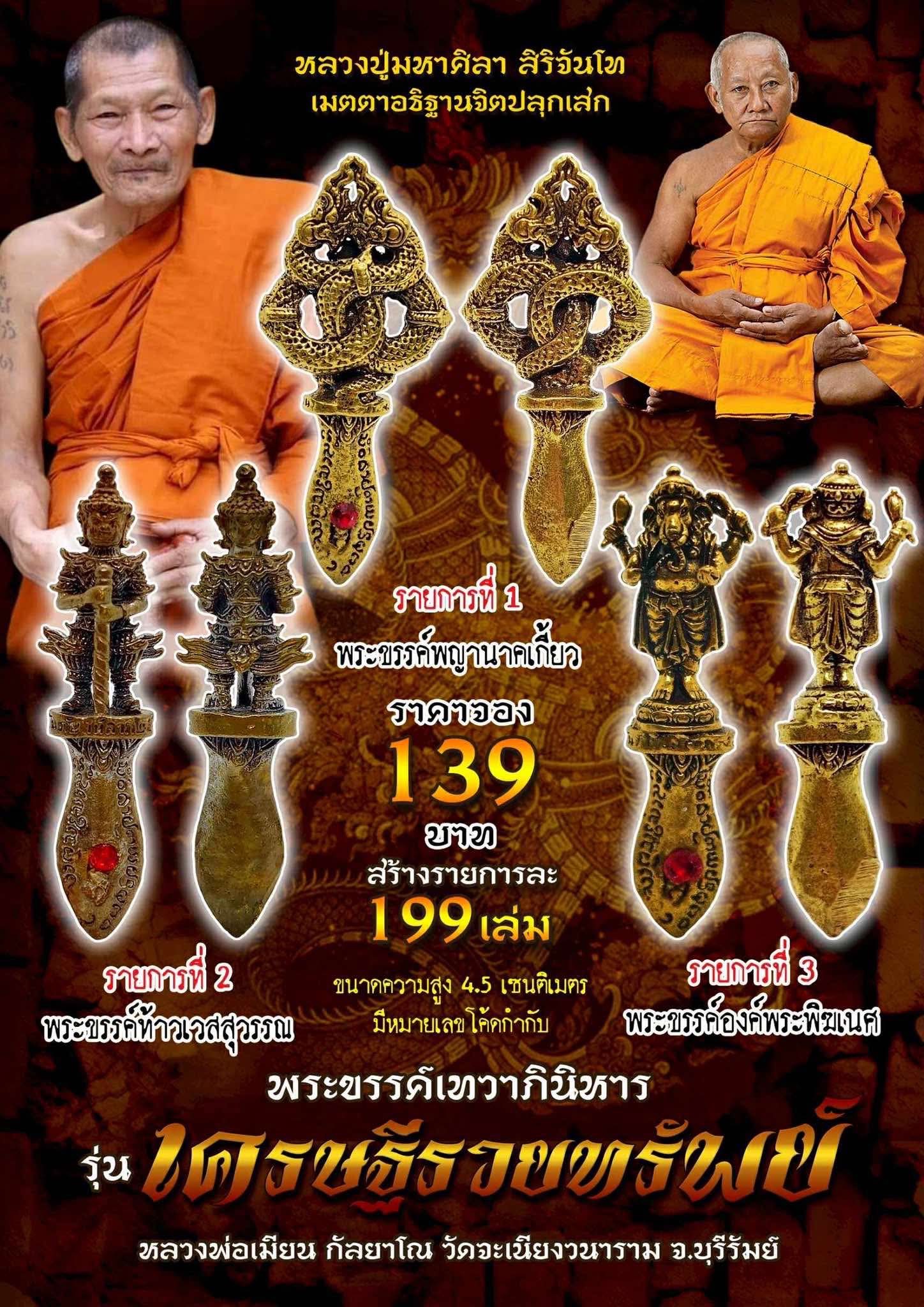 เปิดจอง พระขรรค์เทวาภินิหาร รุ่น เศรษฐีรวยทรัพย์ หลวงพ่อเมียน กัลยาโณ วัดจะเนียงวนาราม จ.บุรีรัมย์ ขนาดความสูง 4.5 เซนติเมตร เนื้อทองเหลือง มีเลขโค้ดกำกับ หลวงปู่มหาศิลา สิริจันโท เมตตาอธิษฐานจิตปลุกเสก รายการที่ 1 : พระขรรค์พญานาคเกี้ยว ราคาจอง 139 บาท สร้าง 199 เล่ม รายการที่ 2 : พระขรรค์ท้าวเวสสุวรรณ ราคาจอง 139 บาท สร้าง 199 เล่ม รายการที่ 3 : พระขรรค์องค์พระพิฆเนศ ราคาจอง 139 บาท สร้าง 199 เล่ม