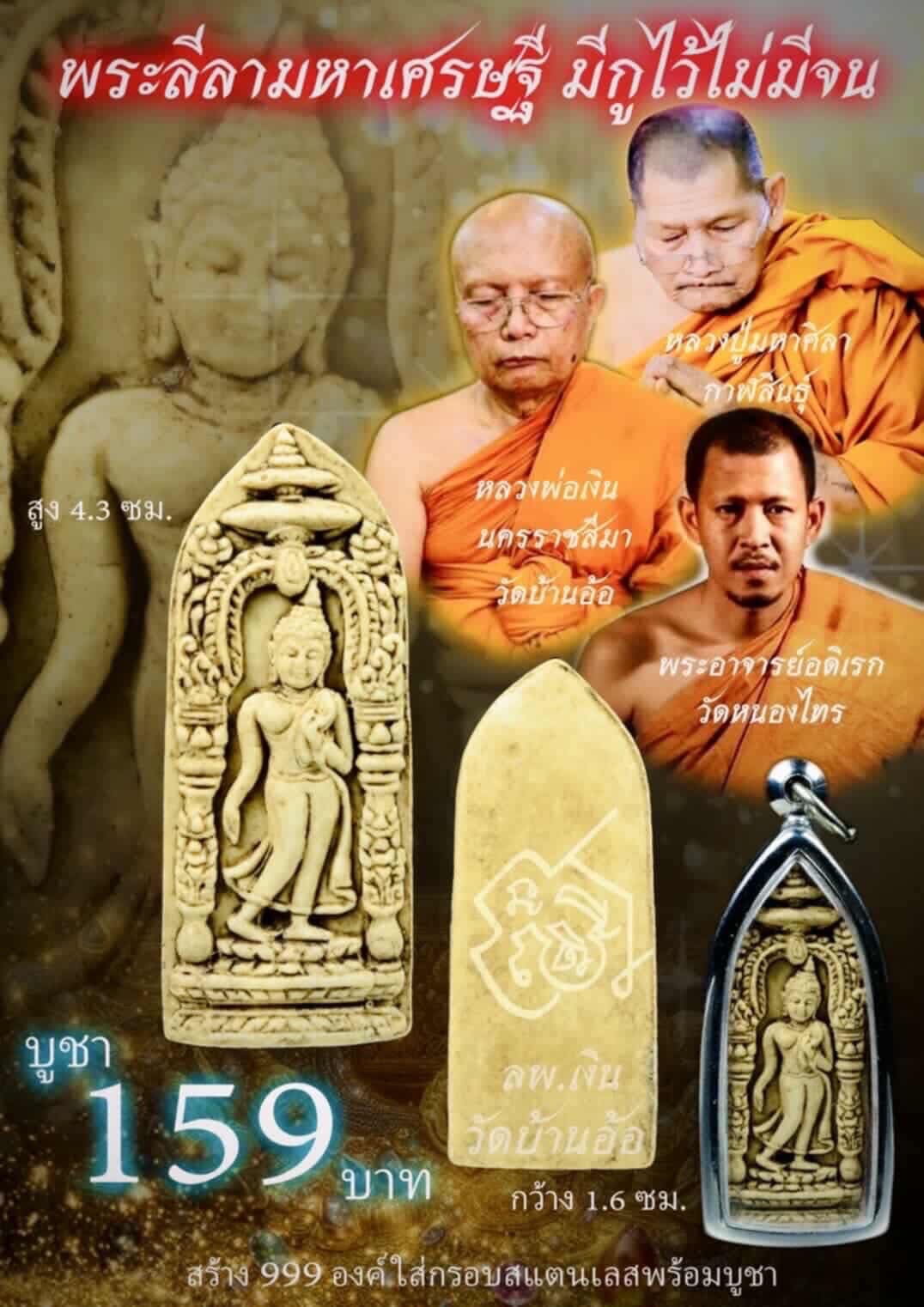 หลวงพ่อเงิน วัดบ้านอ้อ นครราชสีมา พระลีลามหาเศรษฐี มีกูไว้ไม่มีจน ราคาจอง 159 บาท เนื้อผงพุทธคุณ มวลสารเมตตามหานิยมมหาเสน่ห์ เลี่ยมกรอบสแตนเลส สร้าง 999 องค์ ขนาดกว้าง 1.6 ซม. สูง 4.3 ซม. มีเลขโค้ดกำกับทุกองค์ ความเชื่อด้านพุทธคุณของ พระลีลา มีมาแต่โบราณว่าผู้ที่บูชาพระลีลา จะเด่นในเรื่อง เมตตามหาเสน่ห์เมตตามหานิยม การทำมาค้าขาย ความเจริญก้าวหน้า ซึ่งแฝงนัยยะจากลักษณะของ พระพุทธรูปปางลีลา ที่อยู่ในลักษณะการก้าวเดิน ก้าวย่าง ซึ่งสื่อถึงความก้าวหน้าหรือก้าวอย่างมั่นคง ครั้งนี้ได้จัดสร้างเนื้อผงพุทธคุณมวลสาร เมตตามหานิยมมหาเสน่ห์ ได้รับการอธิษฐานจิตปลุกเสกวาระพิเศษโดย หลวงปู่พระมหาศิลา สิริจันโท 1 วาระ และ เข้าพิธีมหาพุทธาภิเษก ณ วัดบ้านอ้อ จังหวัดนครราชสีมา โดย หลวงพ่อเงิน เป็นประธานในพิธี และ มีพระเกจิคณาจารย์ผู้เรืองเวทย์แห่งยุคเข้าร่วมในพิธี อาทิเช่น พระอาจารย์อดิเรก วัดหนองทราย จ.สุพรรณบุรี พระมหาต่อ วัดแจ้งใน จ.นครราชสีมา พระอาจารย์วา วัดสนวน จ.นครราชสีมา จึงเป็นพระเครื่องที่น่าสนใจโดดเด่นในเรื่อง โชคลาภเมตตามหานิยมมหาเสน่ห์ ท่านที่สนใจอยากบูชาไม่ควรพลาด รุ่นนี้ใส่กรอบสแตนเลสขัดเงา พร้อมบูชาให้ด้วยเลยคะ รับวัตถุมงคล : เดือนสิงหาคม 2568