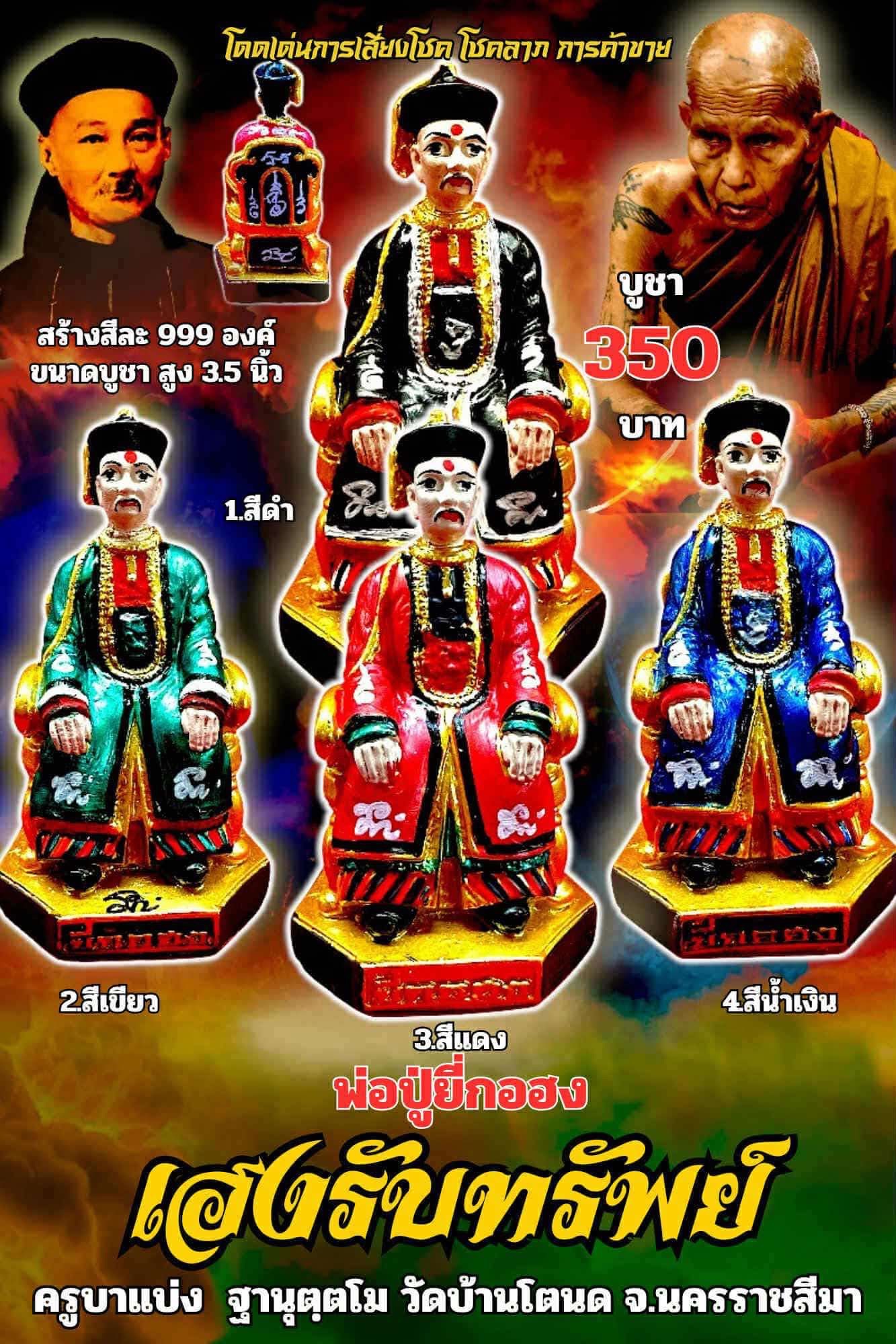 ครูบาแบ่ง วัดบ้านโตนด นครราชสีมา พ่อปู่ยี่กอฮง รุ่น เฮงรับทรัพย์ เนื้อวัสดุสังเคราะห์ ราคาจอง 350 บาท จัดสร้างสีละ 999 องค์ ขนาดองค์บูชา 3.5 นิ้ว มีรายการดังนี้ รายการที่1 สีดำ รายการที่2 สีเขียว รายการที่3 สีแดง รายการที่4 สีน้ำเงิน รับพระเดือนสิงหาคม มีเลขโค้ดกำกับทุกองค์ วัตถุประสงค์:ร่วมพัฒนาวัดบ้านโตนด นครราชสีมา