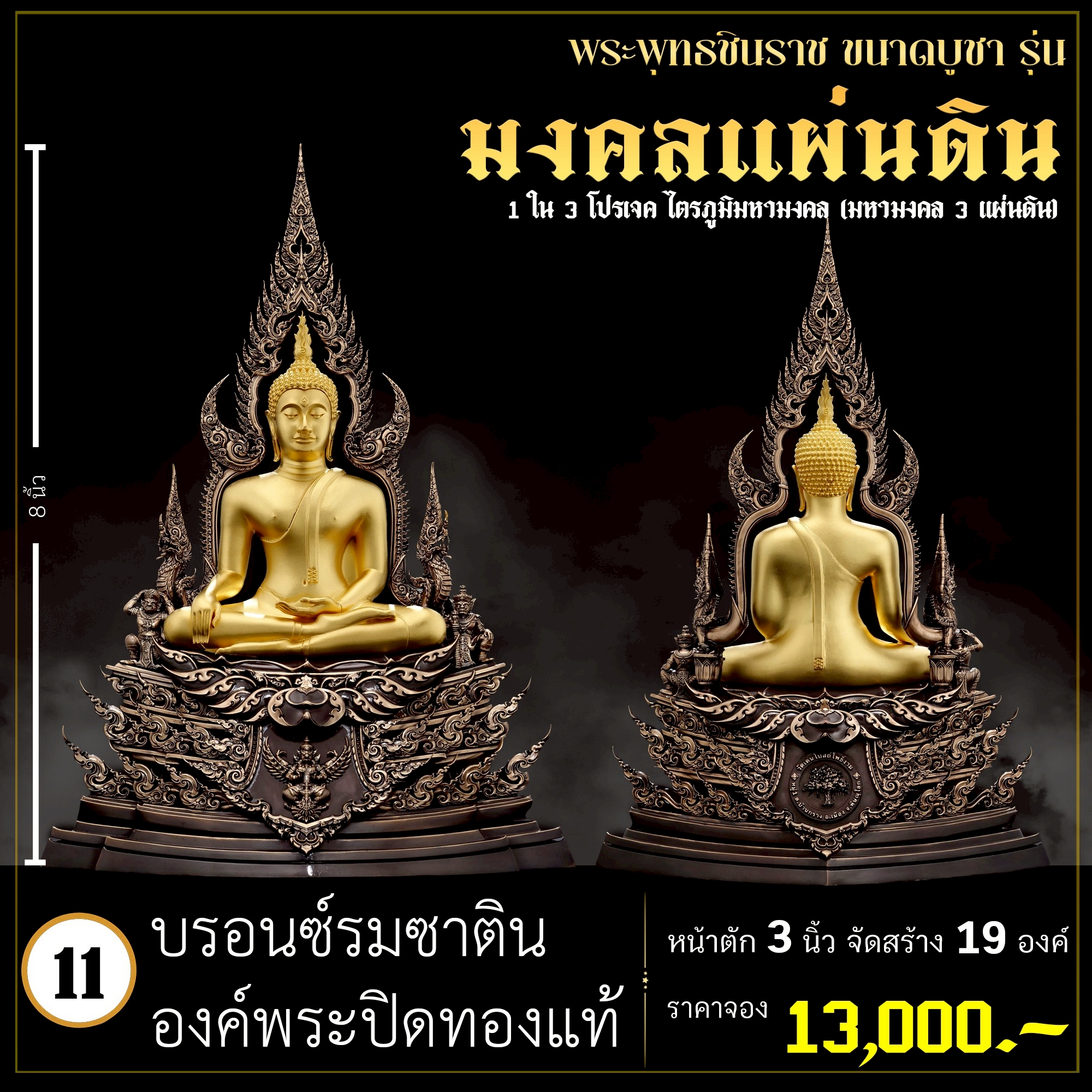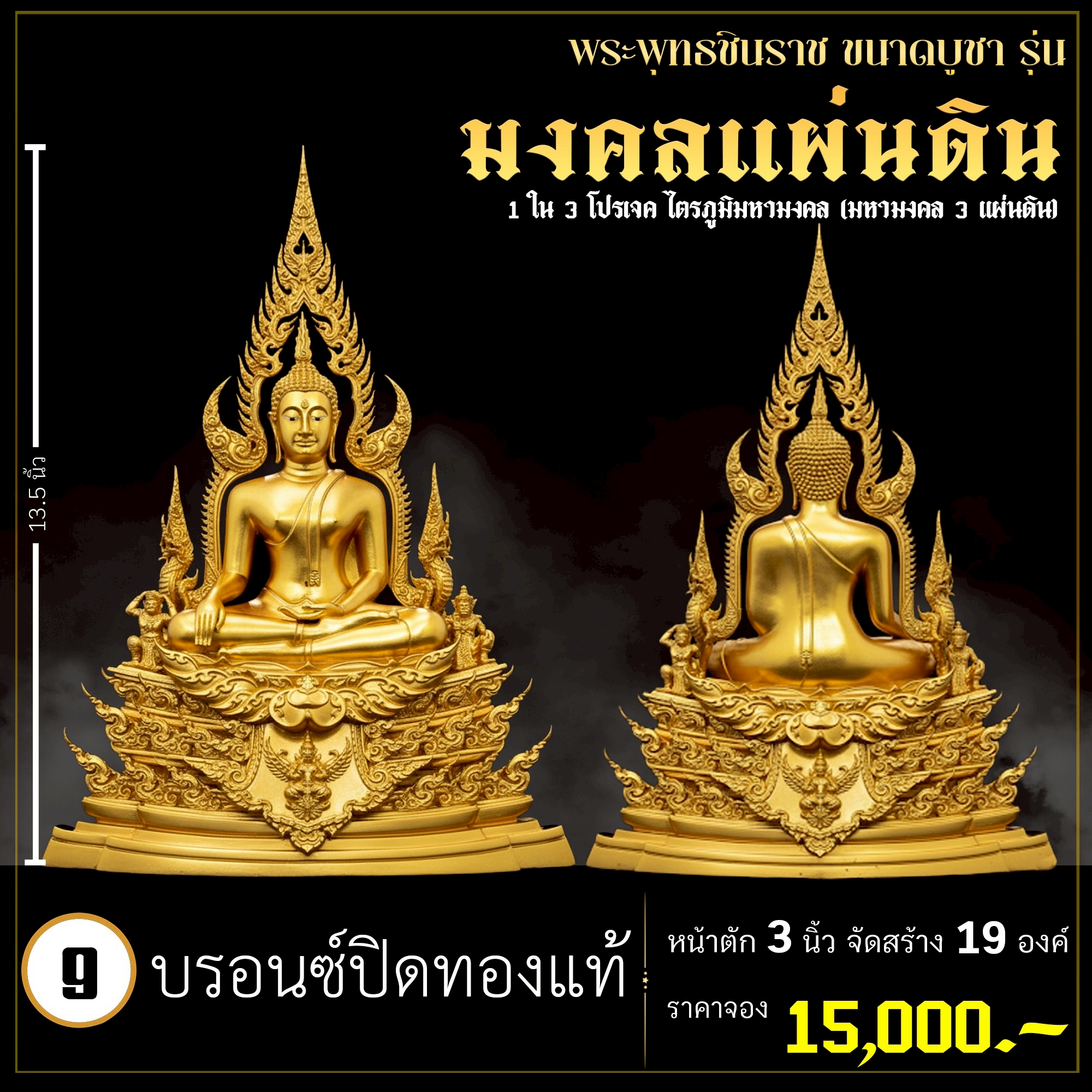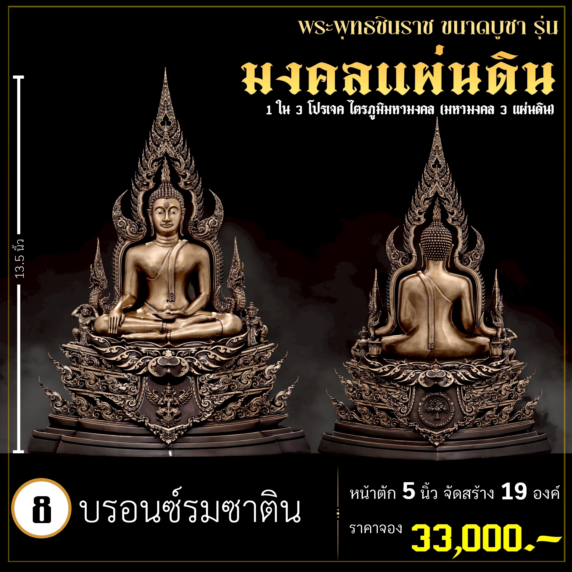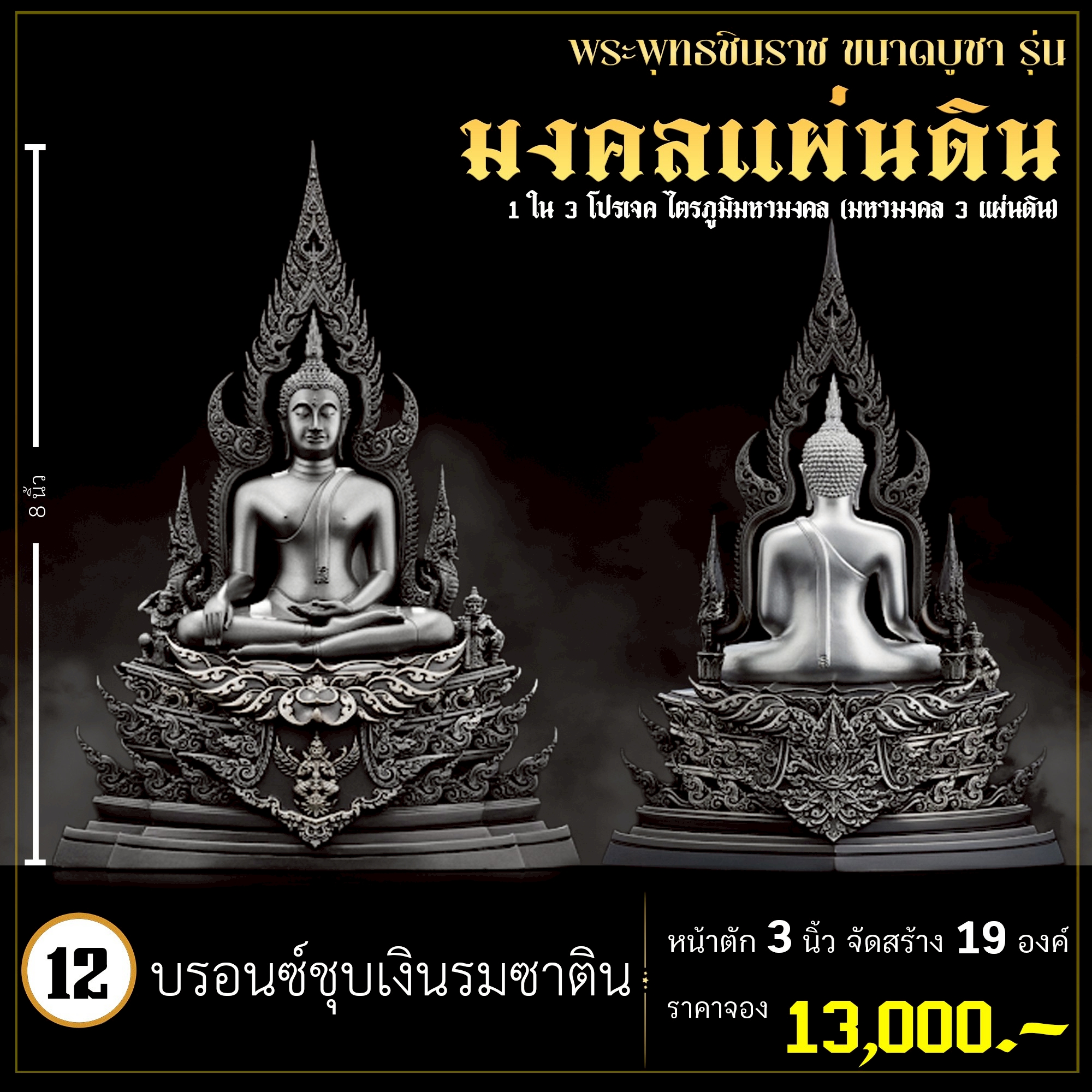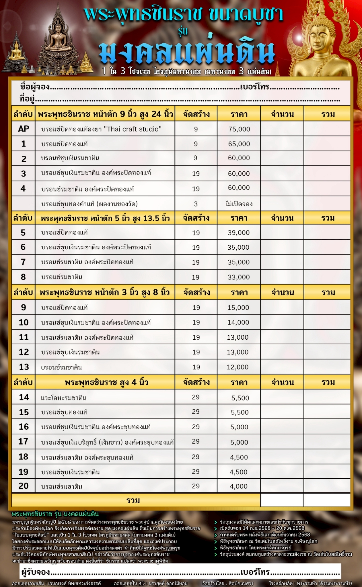 พระพุทธชินราช คือพระคู่บ้านคู่เมืองของไทย ประจำเมืองพิษณุโลก จึงเกิดการรังสรรค์ผลงาน ชุด มงคลแผ่นดิน ซึ่งเป็นการสร้างพระพุทธชินราช “ในแบบพุทธศิลป์” กล่าวกันว่าการบูชาองค์พระพุทธชินราช จะนำมาซึ่งความเจริญรุ่งเรืองรอบด้าน ดังชื่อที่ว่า ชินราช แปละว่า พระราชาผู้พิชิต การออกแบบ ศิลปินออกแบบให้เป็นศิลปะประจำยุคสมัย โดยองค์พระออกแบบให้คงอัตลักษณะความงดงามตามขนบเดิมที่สุด และองค์ประกอบมีการปรับลวดลายให้เป็นแบบพุทธศิลป์ปัจจุบันอย่างลงตัว วัตถุประสงค์ในการจัดสร้าง ร่วมบุญกฐินครั้งใหญ่ปี ๒๕๖๘ เพื่อสบทบทุนร่วมสร้างศาลาธรรมสังเวช ณ วัดเด่นโบสถ์โพธิ์งาม พิธีพุทธาภิเษก โดยพระเกจิคณาจารย์ เปิดจองวันที่ 14 ก.ย.2568 – 20 ก.ย.2568 รับผลงานหลังพิธีเสกใหญ่ ช่วงเดือน ธันวาคม 2568 ออกแบบลายเส้นโดย เจนณรงค์ ทิพยเทวะรังสรรค์ ออกแบบปั้น 3D โดย นรายุติ์ ดอกไม้หอม โรงหล่อผลิตโดย โรงหล่อพระรามห้า (ดีงามพระรามห้า)