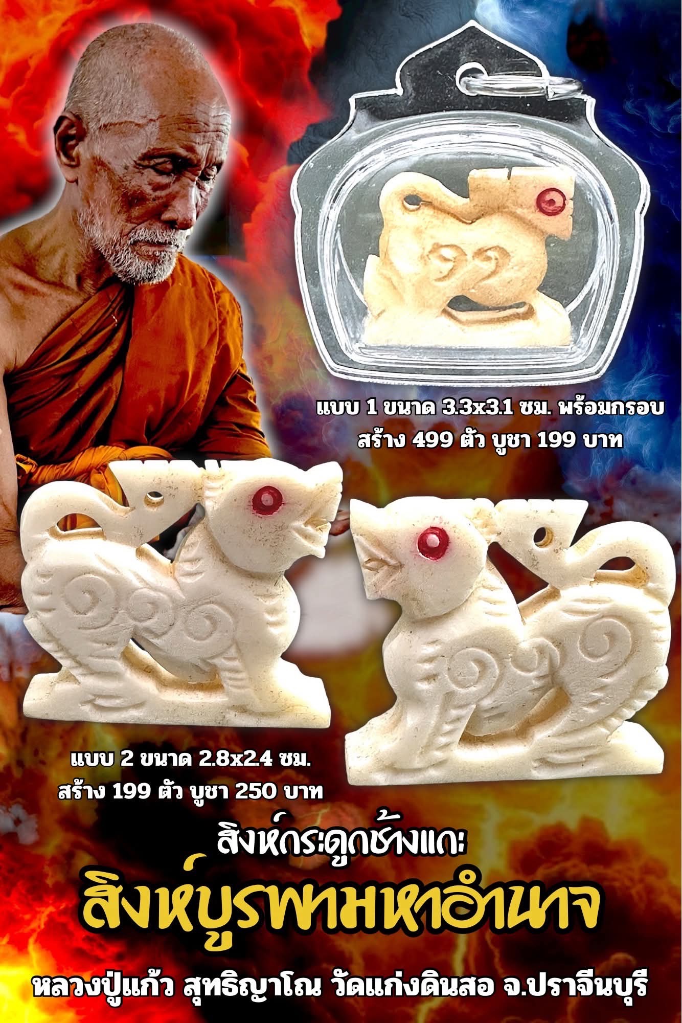 หลวงปู่แก้ว วัดแก่งดินสอ สิงห์กระดูกช้างแกะ สิงห์บูรพามหาอำนาจ มีรายการดังนี้ รายการที่1 พร้อมกรอบ ราคาจอง 199 บาท สร้าง 499 ตน ขนาด 3.3x3.1ซม.(พร้อมเลี่ยม)ตัวสิงห์ 1.7 ซม. รายการที่2 ไม่เลี่ยมกรอบ ราคาจอง 250 บาท สร้าง 199 ตน ขนาด 2.8x2.4 ซม. งานกระดูกช้างแกะ รับพระตุลาคม