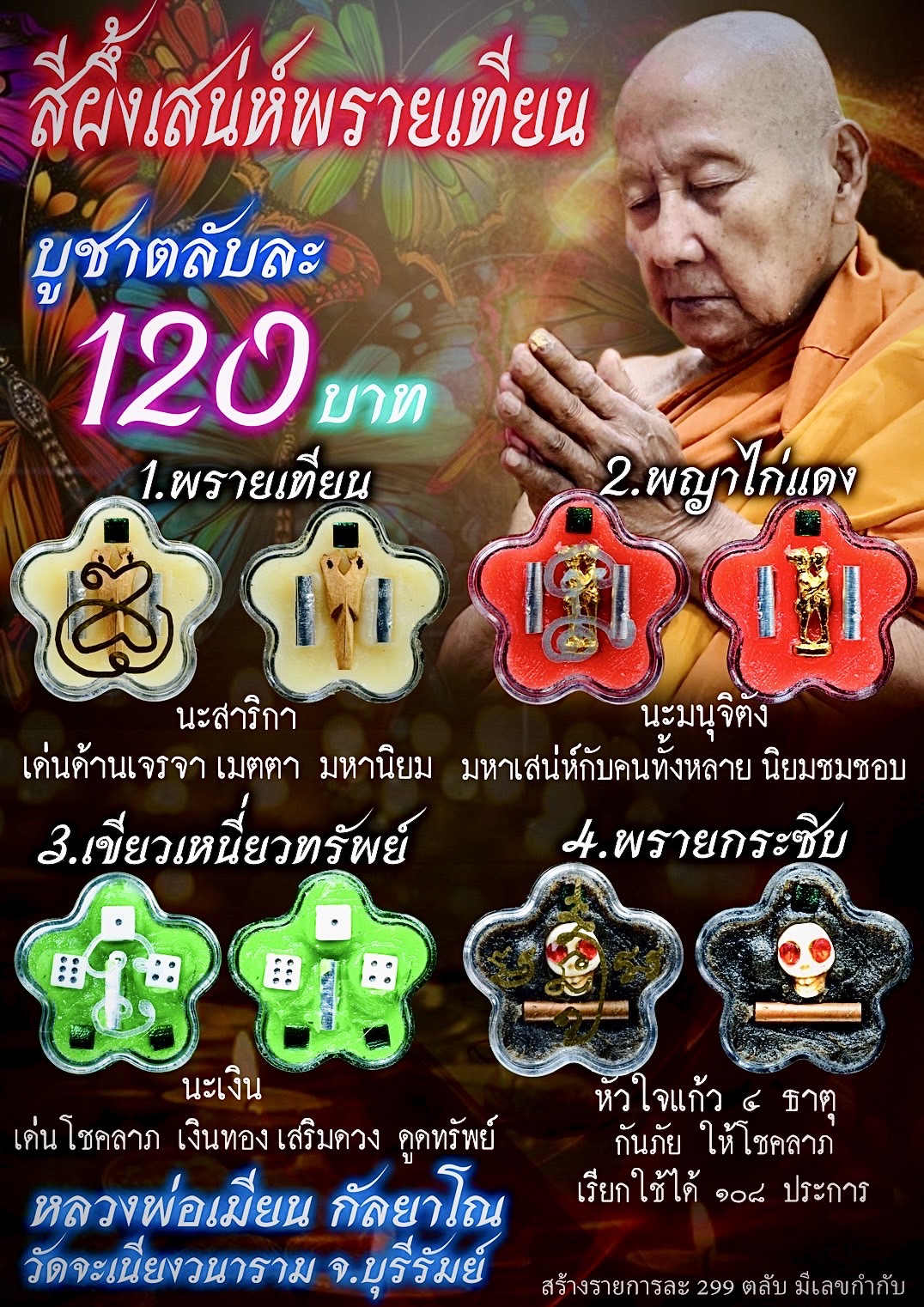 หลวงพ่อเมียน วัดบ้านจะเนียงวนาราม สีผึ้งเสน่ห์พรายเทียน ราคาตลับละ 120 บาท สร้าง 4 แบบ มีรายการดังนี้ พรายเทียน นะสาริกา : เจรจา เมตตา มหานิยม พญาไก่แดง นะมนุจิตัง : มหาเสน่ห์กับคนทั้งหลาย นิยมชมชอบ เขียวเหนี่ยวทรัพย์ นะเงิน : โชคลาภ เงินทอง เสริมดวง ดูดทรัพย์ พรายกระซิบ หัวใจแก้ว 4 ธาตุ : กันภัย ให้โชค เรียกใช้ได้ 108 ประการ สร้างแบบละ 299 ตลับ มีเลขโค้ดกำกับทุกตลับ สีผึ้งพรายเทียน เป็นสีผึ้งที่สร้างชื่อเสียงให้กับ หลวงพ่อเมียน เป็นที่รู้จักโด่งดังไปทั่วประเทศ และ ต่างประเทศ เรียกได้ว่าเป็น ต้นตำรับสีผึ้งพรายเทียน ในการจัดสร้างครั้งนี้ ได้นำ สีผึ้งพรายเทียน และได้ปลุกเสกเอาไว้ มาบรรจุใส่ในตลับ เพิ่มของมงคลต่างๆ เพื่อเสริมให้สีผึ้ง มีความเข้มขลังศักดิ์สิทธิ์ และ ถูกใจผู้ที่บูชา ได้ตามความประสงค์ ท่านที่ชื่นชอบสีผึ้งรุ่นนี้นับว่าไม่ควรพลาดเป็นอย่างยิ่ง รูปแบบสวยงาม ตลับขนาดเล็กกระทัดรัด และยังได้ความเข้มขลังศักดิ์สิทธิ์ของสีผึ้งพรายเทียนที่โด่งดังอีกด้วยนะคะ