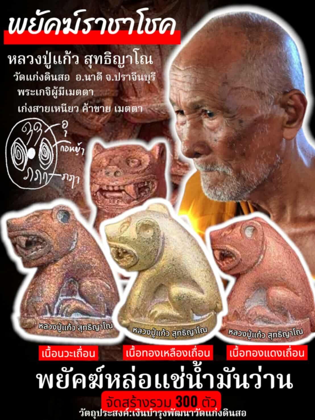 พยัคฆ์ราชาโชค หลวงปู่แก้ว สุทธิญาโณ วัดแก่งดินสอ อ.นาดี จ.ปราจีนบุรี ขนาด สูง 1.6 เซน เนื้อนวะเถื่อน จองตัวละ 200 บาท (.สร้าง 100 ตัว.) เนื้อทองเหลืองเถื่อน จองตัวละ 159 บาท (.สร้าง 100 ตัว.) เนื้อทองแดงเถื่อน จองตัวละ 129 บาท (.สร้าง 100 ตัว.) ความหมายถึงความเป็นผู้นำ อำนาจ ความมั่งคั่ง และความปลอดภัย สิงห์ถูกนำมาใช้เป็นเครื่องรางและประดับตกแต่งเพื่อเสริมสร้างความเป็นสิริมงคลและคุ้มครองผู้ครอบครอง