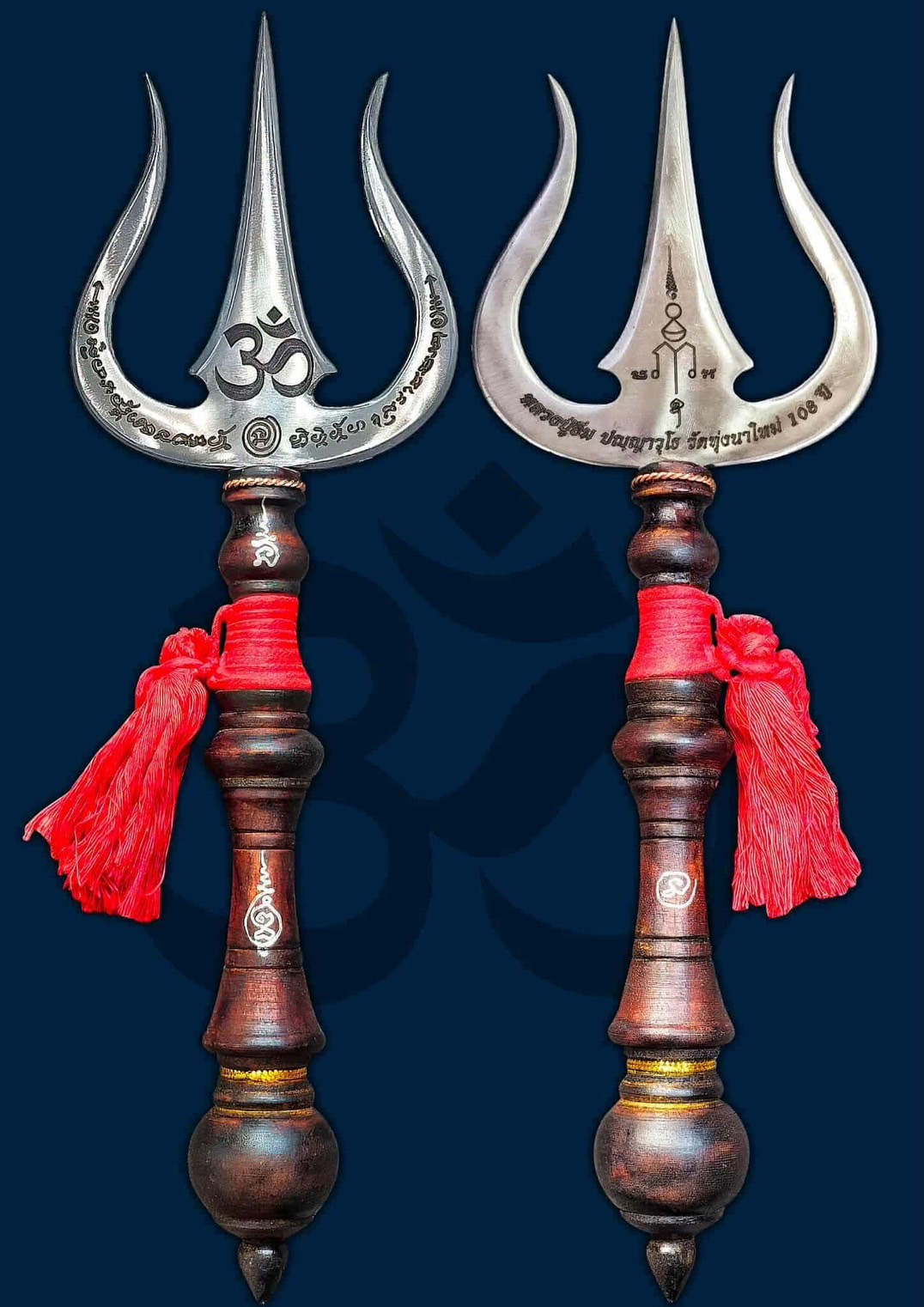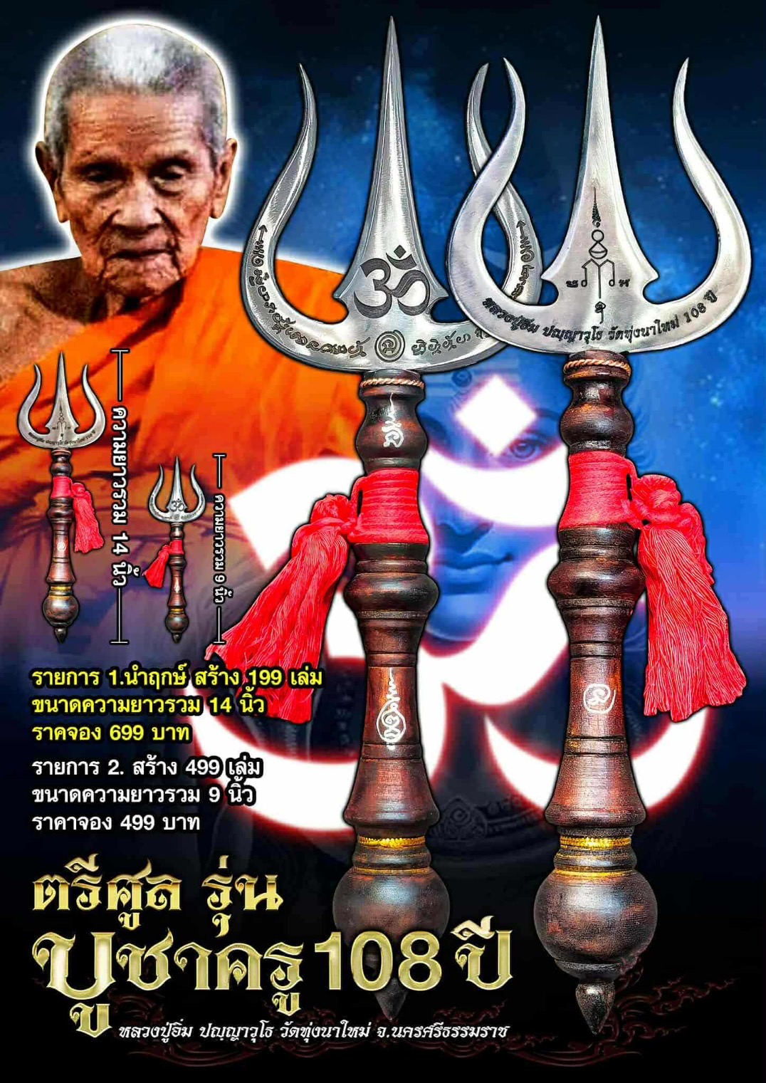 หลวงปู่อิ่ม วัดทุ่งนาใหม่ นครศรีธรรมราช ตรีศูล รุ่น บูชาครู 108 ปี นำฤกษ์ (พิเศษ) สร้าง 199 เล่ม รวมความยาว 14 นิ้ว สร้าง 499 เล่ม รวมความยาว 9 นิ้ว ราคาจอง 499 บาท ความหมายและพุทธคุณของ ตรีศูล สัญลักษณ์แห่งอำนาจและโชคลาภ:ตรีศูลเป็นอาวุธคู่กายของพระศิวะ สื่อถึงอำนาจในการปกครองและความอุดมสมบูรณ์ สื่อถึงภพทั้งสาม:ความหมายของตรีศูลยังรวมถึงภพทั้งสาม ได้แก่ สวรรค์ ภพมนุษย์ และภพบาดาล บันดาลความมั่นคงและอุดมสมบูรณ์:การบูชาตรีศูลเชื่อว่าสามารถนำมาซึ่งความมั่นคง การเงิน และความสำเร็จในชีวิตได้ ปกป้องคุ้มครอง:เชื่อว่าตรีศูลมีพลังในการปัดเป่าสิ่งชั่วร้าย คุณไสย และความชั่วร้ายต่างๆ พุทธคุณของตรีศูลครอบคลุมทั้งอำนาจ, ความอุดมสมบูรณ์, การปกป้อง, และการปัดเป่าสิ่งชั่วร้าย ทำให้เป็นวัตถุมงคล
