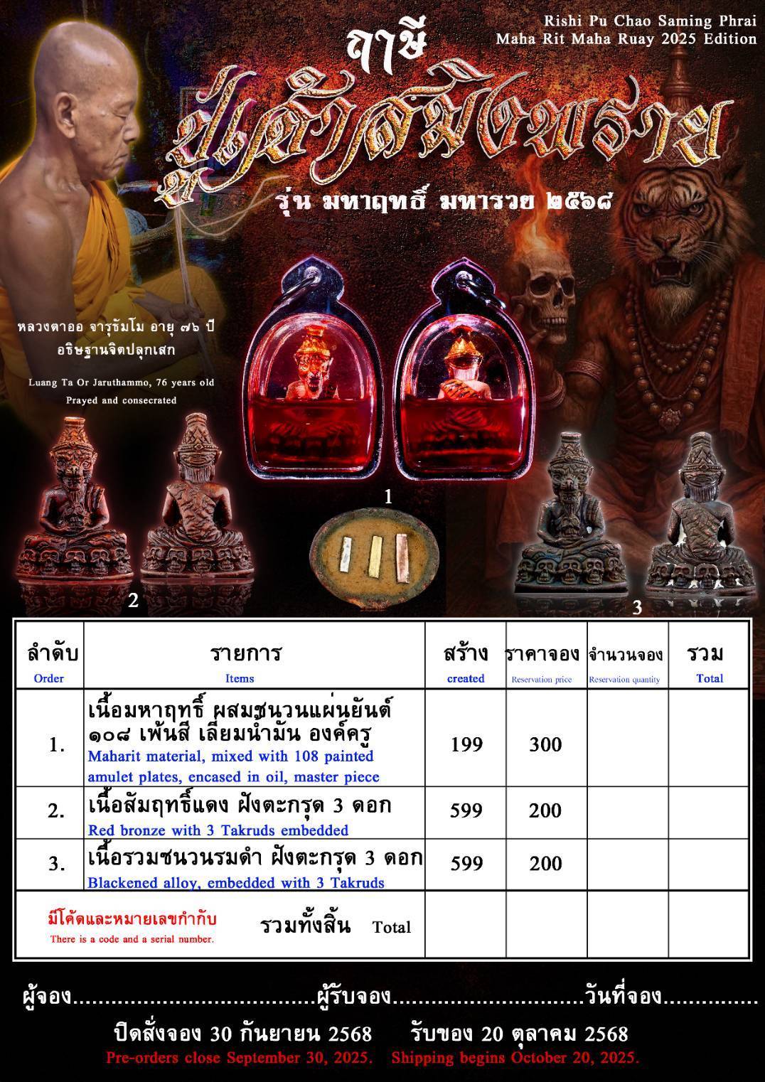 ฤๅษีปู่เจ้าสมิงพราย รุ่น มหาฤทธิ์ มหารวย ๖๘ ปู่เจ้าสมิงพรายท่านเป็นบรมครูฤาษีชั้นพรหมแต่เมตตาท่านสูงไม่ว่าผู้บูชาจะเป็นใครจะยากดีมีจนทำผิดหรือถูกท่านช่วยหมดทุกคน บารมีท่านขลังนัก ญาณบารมีแก่กล้า ทรงอิทธิฤทธิ์เข้มขลัง เนื้อมหาฤทธิ์ผสมชนวนแผ่นยันต์ ๑๐๘ เพ้นท์สี ตนครู เลี่ยมน้ำมัน สร้าง 199 ตน ราคาบูชา 300 บาท หลวงตาออ จารุธัมโม อายุ ๗๖ ปี อธิษฐานจิตปลุกเสกเชิญญาณบารมี ปิดสั่งจอง 10 ตุลาคม 2568