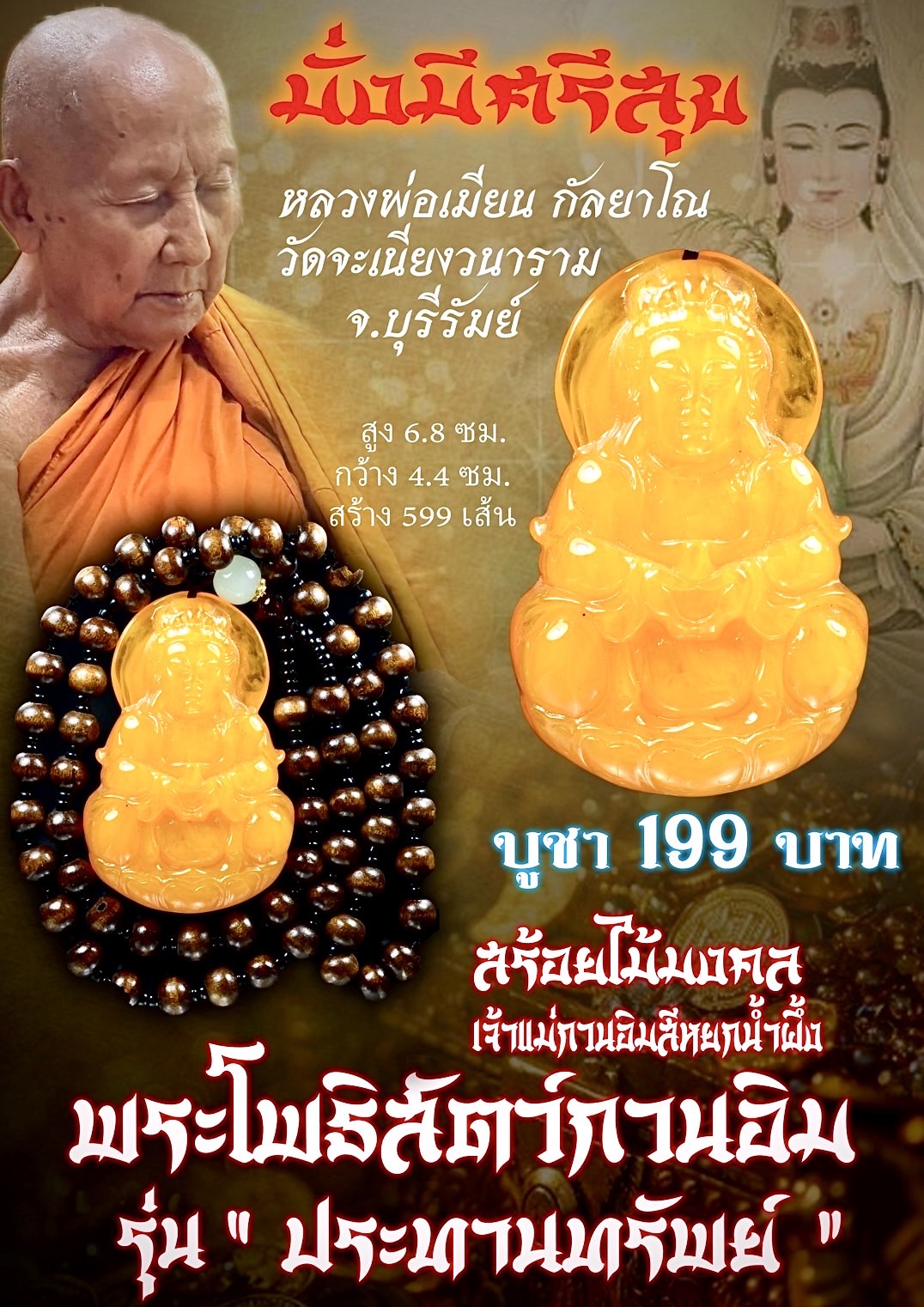 สร้อยไม้มงคล เจ้าแม่กวนอิม สีหยกน้ำผึ้ง ประทานทรัพย์ หลวงพ่อเมียน วัดจะเนียงวนาราม บุรีรัมย์ ราคาจอง 199 บาท ขนาด กว้าง 4.4 ซม. สูง 6.8 ซม. สร้าง 599 เส้น มีเลขโค้ดกำกับทุกเส้น พระะแม่กวนอิม เป็นพระโพธิสัตว์แห่งความเมตตากรุณา ที่ผู้คนนับถือกันมาก เนื่องจากเป็นเทพที่มีความอ่อนโยน ชอบช่วยเหลือมนุษย์อยู่เสมอ เปรียบได้กับความรักของแม่ที่มีต่อลูก ดังนั้นใครที่มีปัญหาติดขัด ทุกข์ใจ ไม่สบายใจ ไม่ว่าจะเป็นเรื่องการงาน การเงิน ความรัก โชคลาภ หรือ แม้แต่ความทุกข์ทางกายหรือ ปัญหาสุขภาพก็ตาม สามารถไปอธิษฐานขอพรให้หายเจ็บป่วย จึงเป็นองค์เทพที่ได้รับการบูชามาแต่อดีตจนถึงปัจจุบัน มีผู้คนศรัทธาไม่เสื่อมคลาย ครั้งนี้ได้จัดสร้างในรูปแบบจี้ห้อยคอ พร้อมสร้อยไม้มงคล สีหยกน้ำผึ้งสวยงาม ได้รับการอธิษฐานจิตเสริมโชคลาภ เมตตา มหานิยม รับวัตถุมงคล : ตุลาคม 2568