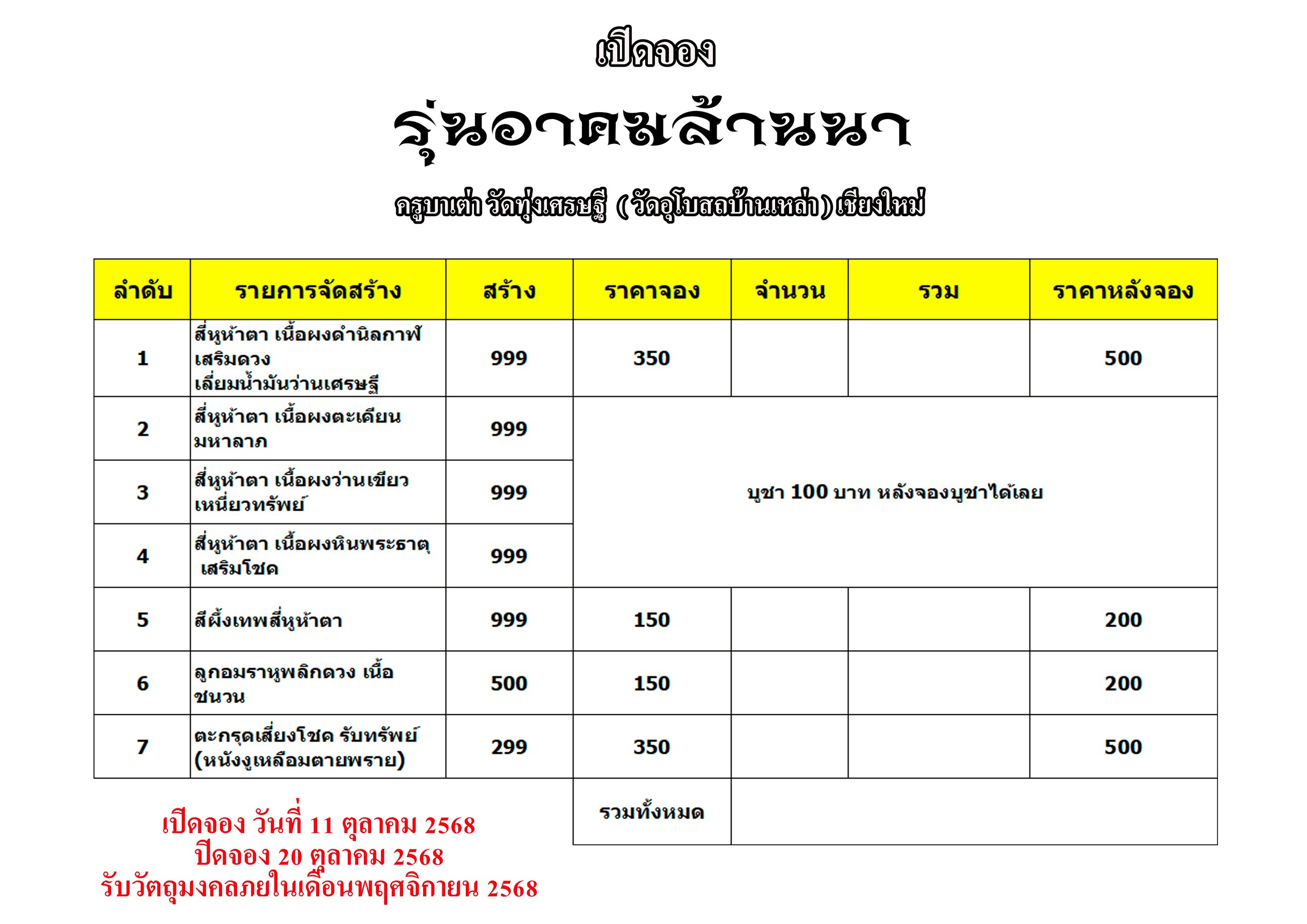 เปิดรับจองวัตถุมงคลครูบาเต่า วัดทุ่งเศรษฐี (วัดอุโบสถบ้านเหล่า) จ.เชียงใหม่ สี่หูห้าตา สีผึ้งสี่หูห้าตา ลูกอมพระราหู ตะกรุดเสี่ยงโชค รับวัตถุมงคลภายในเดือน พฤศจิกายน
