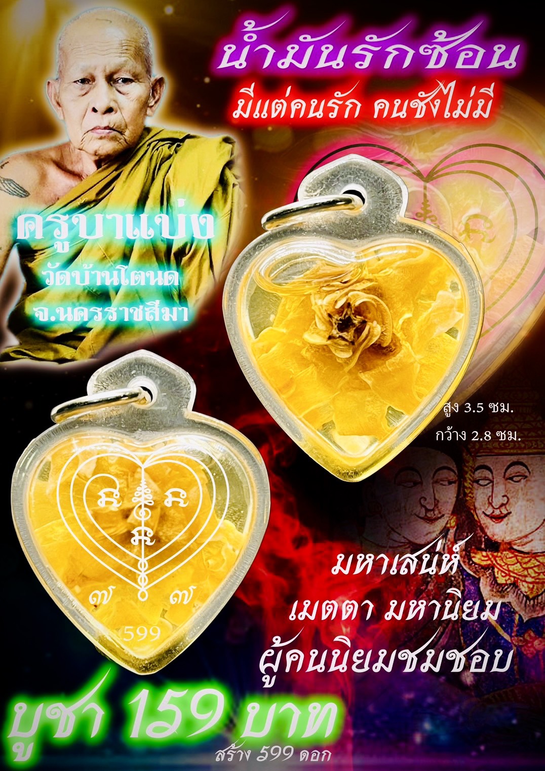 ดอกรักซ้อน พร้อมเลี่ยมน้ำมันมหาเสน่ห์ ครูบาแบ่ง วัดบ้านโตนด น้ำมันรักซ้อน มีแต่คนรัก คนชังไม่มี ราคาจอง 159 บาท ขนาด สูง 3.5 ซม. กว้าง 2.8 ซม. สร้าง 599 ชิ้น มีเลขโค้ดกำกับทุกชิ้น น้ำมันรักซ้อน มีแต่คนรัก คนชังไม่มี เป็นวิชาการสร้างน้ำมันมหาเสน่ห์ บูชาติดตัวเป็นเสน่ห์เมตตามหานิยม ผู้คนนิยมชมชอบ ด้วยถือเคล็ดนำ ดอกรักซ้อน มาเคี่ยวแช่ในน้ำมัน ให้ไปที่ไหนมีแต่คนรัก คนเมตตา รักแล้วรักอีก เรียกไปว่าเป็นวิชาสายเสน่ห์ ที่มีมาแต่โบราณ ถือเป็นหนึ่งมวลสาร สำคัญในการจัดสร้างวัตถุมงคลเด่นเรื่องเสน่ห์ ได้รับการอธิษฐานจิตปลุกเสกโดย ครูบาแบ่ง ฐานุตฺตโม วัดบ้านโตนด นครราชสีมา รับวัตถุมงคล : เดือนตุลาคม 2568