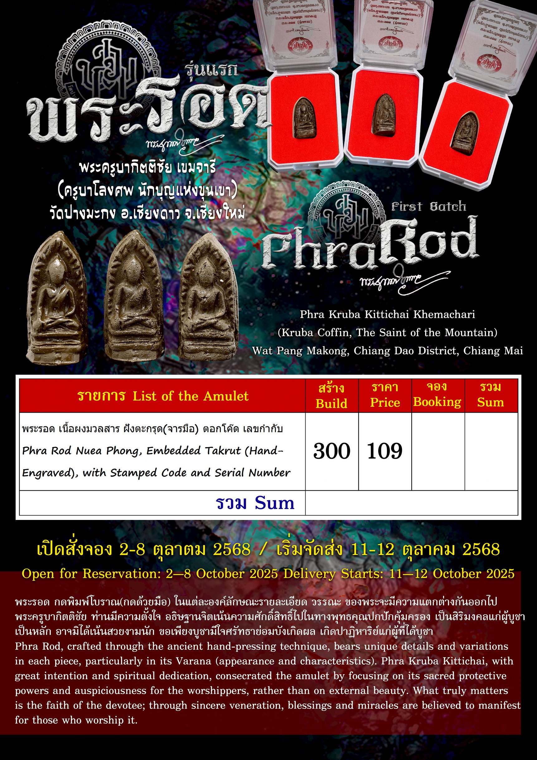 พระรอด (รุ่นแรก) พระครูบากิตติชัย เขมจารี (ครูบาโลงศพ นักบุญแห่งขุนเขา) วัดปางมะกง อ.เชียงดาว จ.เชียงใหม่ ขนาด 1.3 cm x 2.7-2.8 cm เริ่มจัดส่ง 11-12 ตุลาคม 2568 พระรอด เชื่อกันว่า มีพุทธคุณทางด้านคงกระพันชาตรี แคล้วคลาดปลอดภัย ปัดป้องภัยอันตราย ให้ผู้บูชารอดพ้นจากภัยอันตราย และเหตุการณ์วิบัติต่างๆ ได้ (จากชื่อที่สื่อถึงการ “รอดพ้นจากภัยพิบัติทั้งปวง”) ทั้งยังช่วยเสริมด้านความอุดมสมบูรณ์ เสริมเมตตา เป็นที่เมตตาเอ็นดูของผู้คน Phra Rod (First Batch) Phra Kruba Kittichai Khemachari (Kruba Coffin, The Saint of the Mountain) Wat Pang Makong, Chiang Dao District, Chiang Mai Size 1.3 cm x 2.7-2.8 cm Delivery Starts: 11–12 October 2025 Phra Rod is believed to possess sacred powers in providing invulnerability, protection from dangers, and safeguarding the worshipper from harm and calamities (as implied by its name, which signifies “survival from all disasters”). It is also believed to bring prosperity, enhance loving-kindness, and attract compassion and benevolence from others.