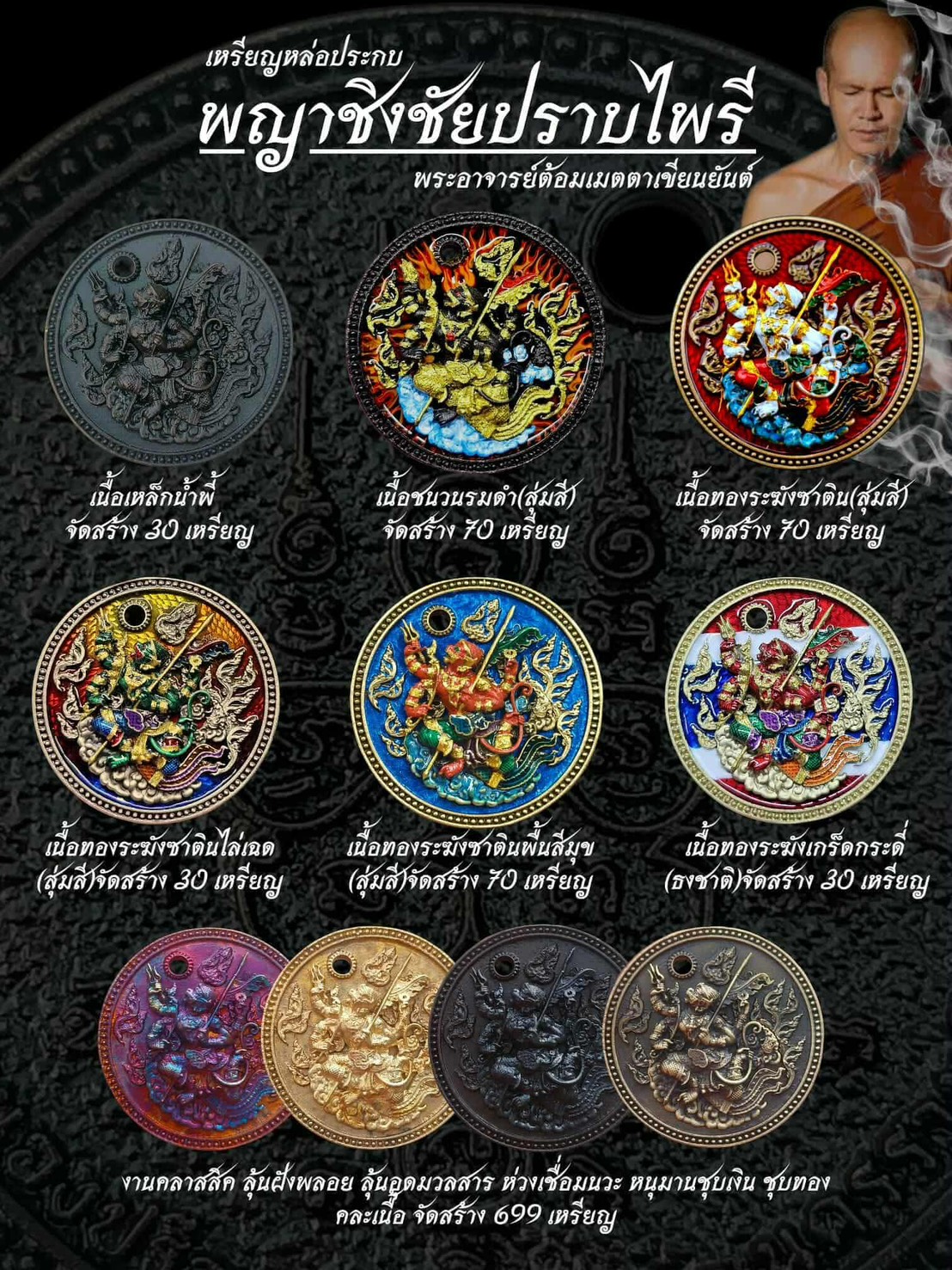 เหรียญหล่อประกบ 2 ชิ้น รุ่น พญาชิงชัยปราบไพรี 6 วาระมงคล 6 เกจิคณาจารย์ วัตถุประสงค์เผื่อร่วมบุญสร้างโบถส์มหาอุตม์ วัดหนองปรือ ให้มีโบสถ์หลังแรกของวัดหนองปรือ และ นำเงินเข้าร่วมกองทุนหทัยทิพย์ ที่จัดตั้งขึ้นภายใต้มูลนิธิจุฬาภรณ์ เพื่อระดมทุนสำหรับสร้างกำแพงและบังเกอร์ตามแนวชายแดนไทย-กัมพูชา นำฤกษ์ จัดสร้างเพียง 999 เหรียญ ลุ้นละ 289 บาท ปิดจอง 28 ตค. 68 พระออกต้นเดือน พย. 68