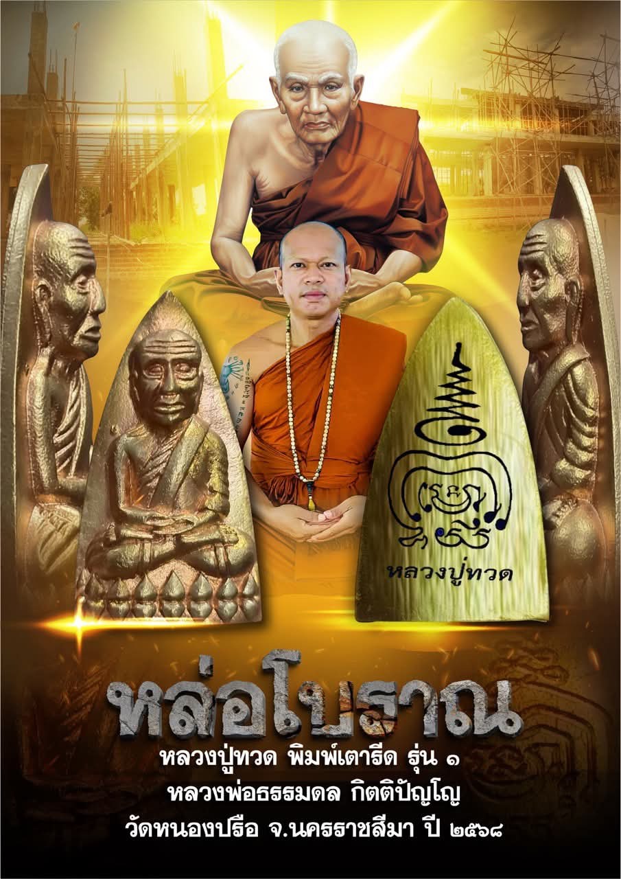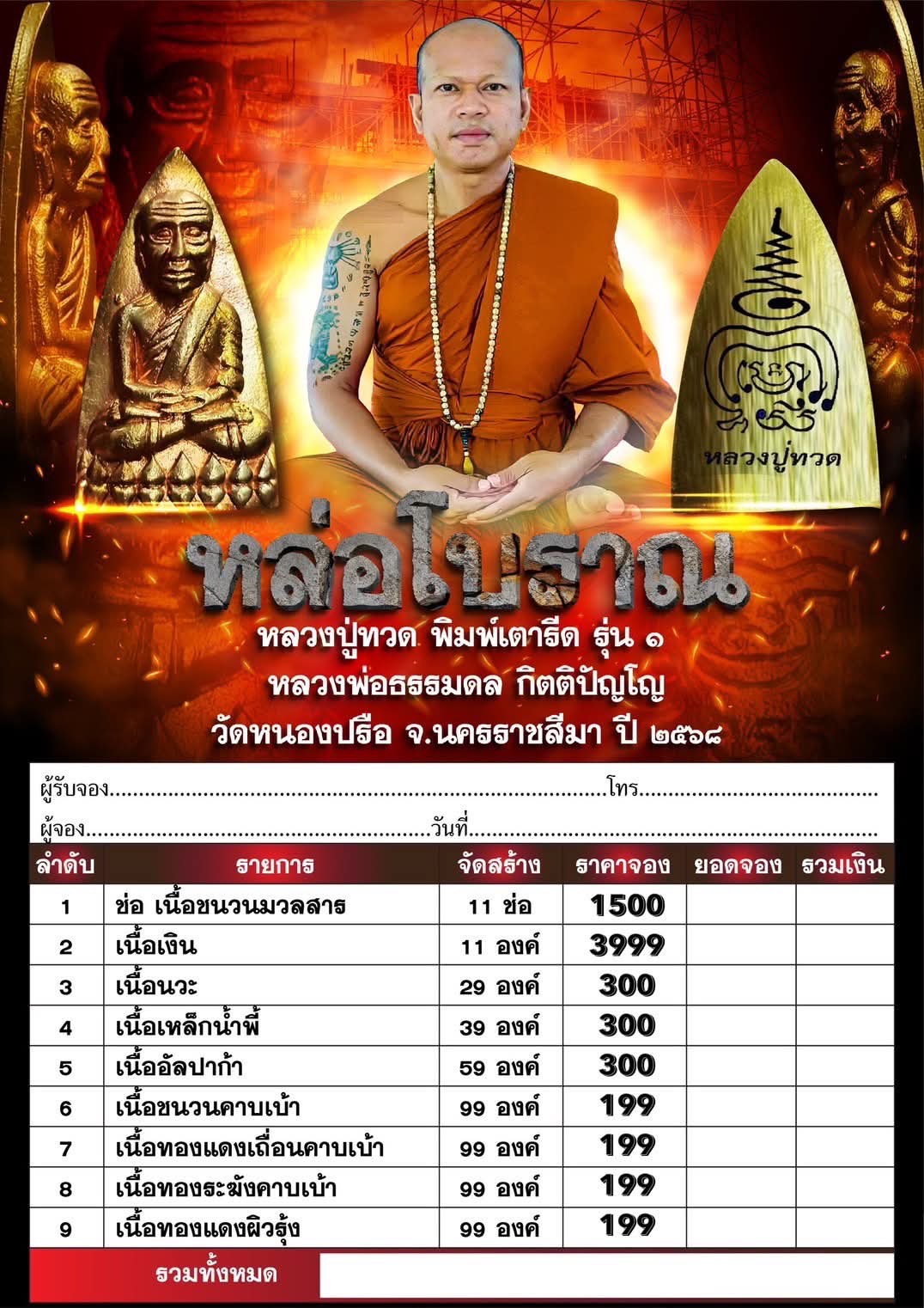 เปิดจอง หล่อโบราณ หลวงปู่พ่อทวด พิมพ์เตารีด รุ่น ๑ หลวงพ่อธรรมดล กิตติปัญโญ วัดหนองปรือ จ. นครราชสีมา ขนาดเตารีดหลวงปู่ทวด หล่อโบราณ สูง 3.7 cm กว้าง 2.1 cm ช่อ เนื้อชนวนมวลสาร จอง 1,500 บาท เนื้อเงิน จอง 3,999 บาท เนื้อนวะ จอง 300 บาท เนื้อเหล็กน้ำพี้ จอง 300 บาท เนื้ออันปาก้า จอง 300 บาท เนื้อชนวนคาบเบ้า จอง 199 บาท เนื้อทองแดงเถื่อนคาบเบ้า จอง 199 บาท เนื้อทองระฆังคาบเบ้า จอง 199 บาท เนื้อทองแดงผิวรุ้ง จอง 199 บาท รับพระ พฤศจิกายน 2568