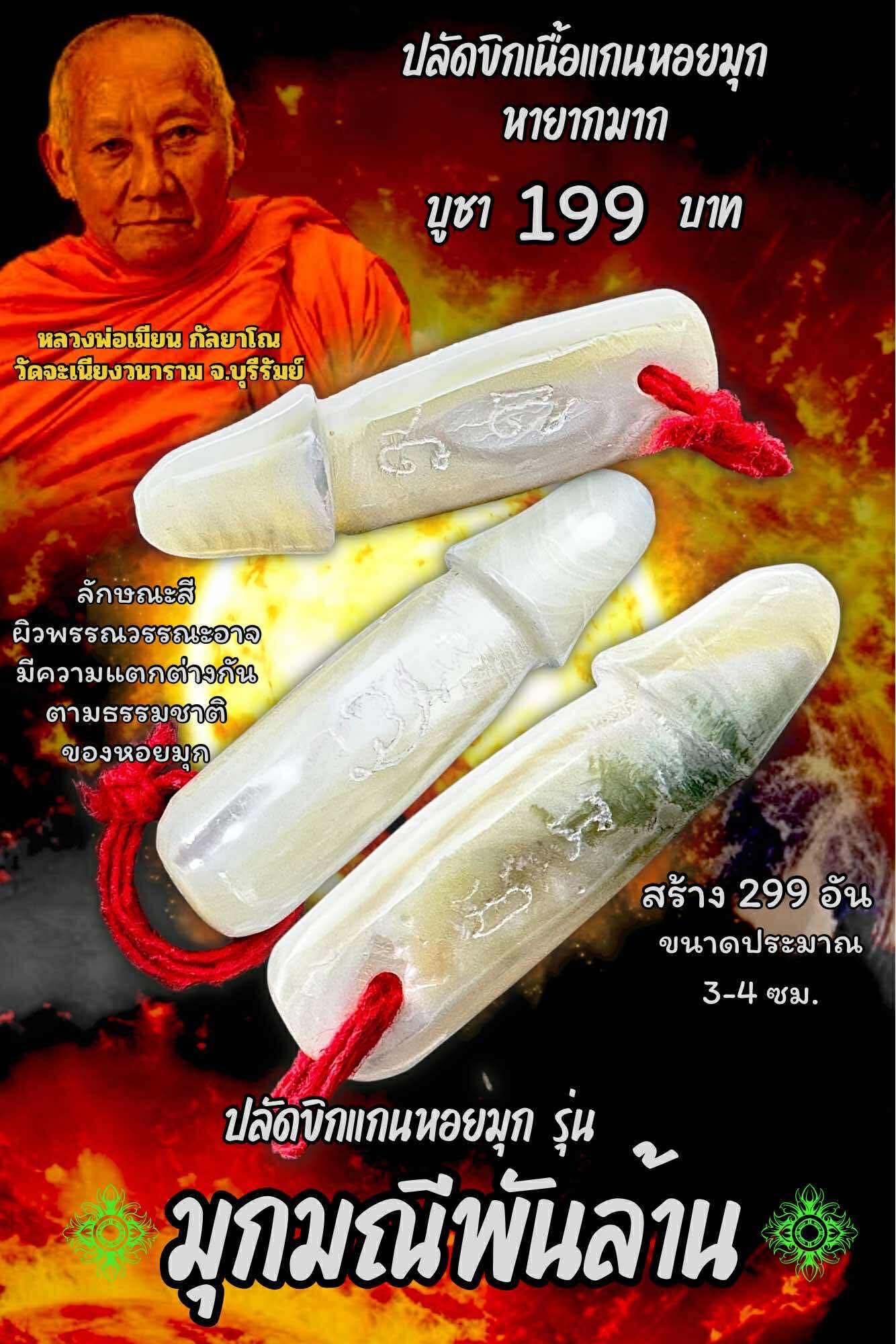 หลวงพ่อเมียน วัดบ้านจะเนียงวนาราม ปลัดขิกแกนหอยมุก มุกมณีพันล้าน ราคาจอง 199 บาท จัดสร้าง 299 อัน ขนาดประมาณ 3-4ซม. รับพระเดือนธค. ปลัดขิกเนื้อแกนหอยมุก หายากมาก ลักษณะสีผิวพรรณวรรณะ,อาจมีความแตกต่างกันไปบ้าง,ตามธะมของหอยมุก มีเลขโค้ดกำกับทุกองค์ วัตถุประสงค์:ร่วมพัฒนาวัดบ้านจะเนียงวนาราม จ.บุรีรัมย์