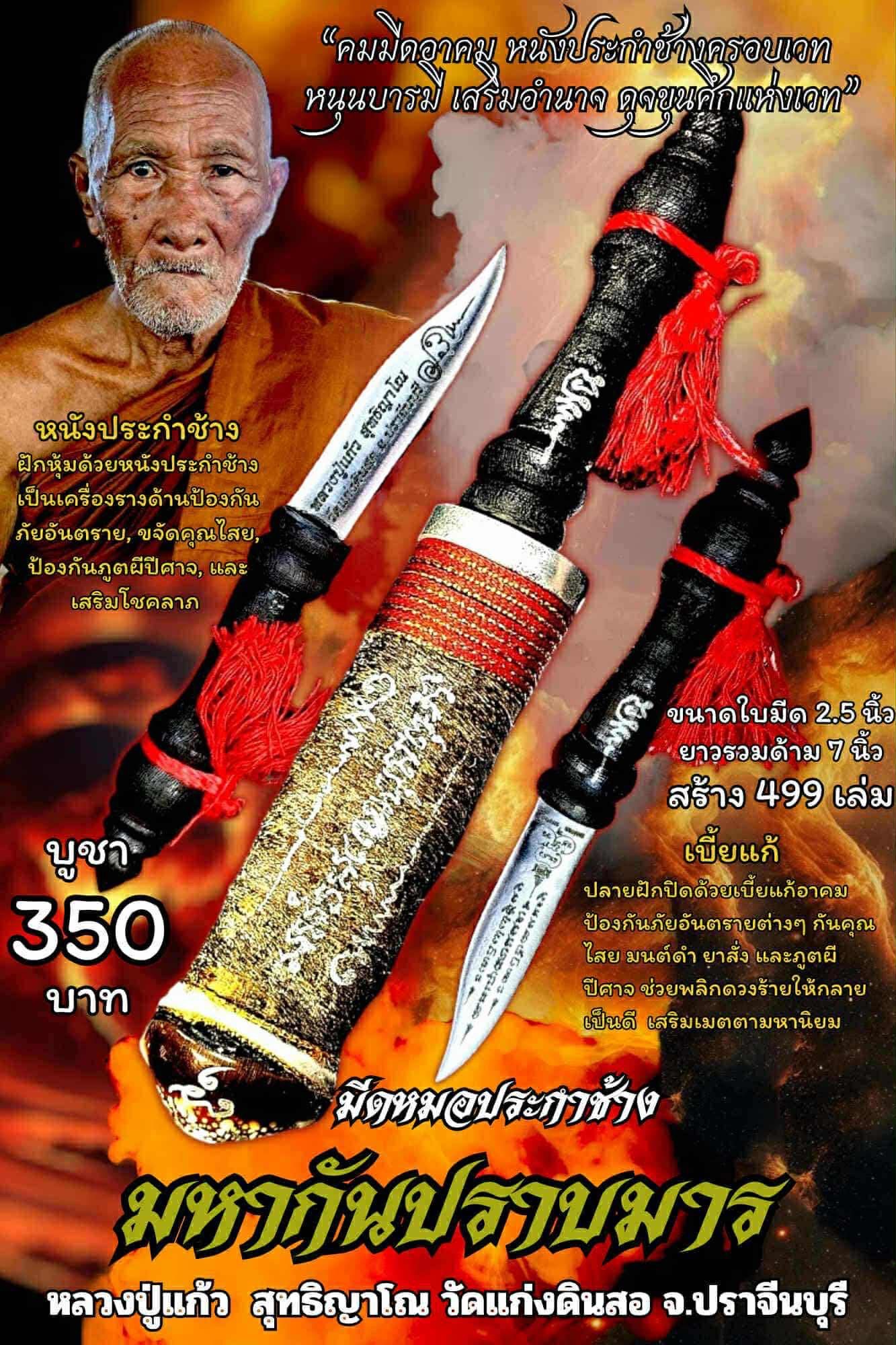 หลวงปู่แก้ว วัดแก่งดินสอ มีดหมอประกาช้าง มหากันปราบมาร จองเล่มละ 350 บาท ขนาดใบมีด 2.5 นิ้ว รวมด้าม 7 นิ้ว สร้าง 499 เล่ม มีเลขโค้ดกำกับทุกเล่ม รับพระเดือนธค. วัตถุประสงค์:พัฒนาวัดแก่งดินสอ จ.ปราจีนบุรี