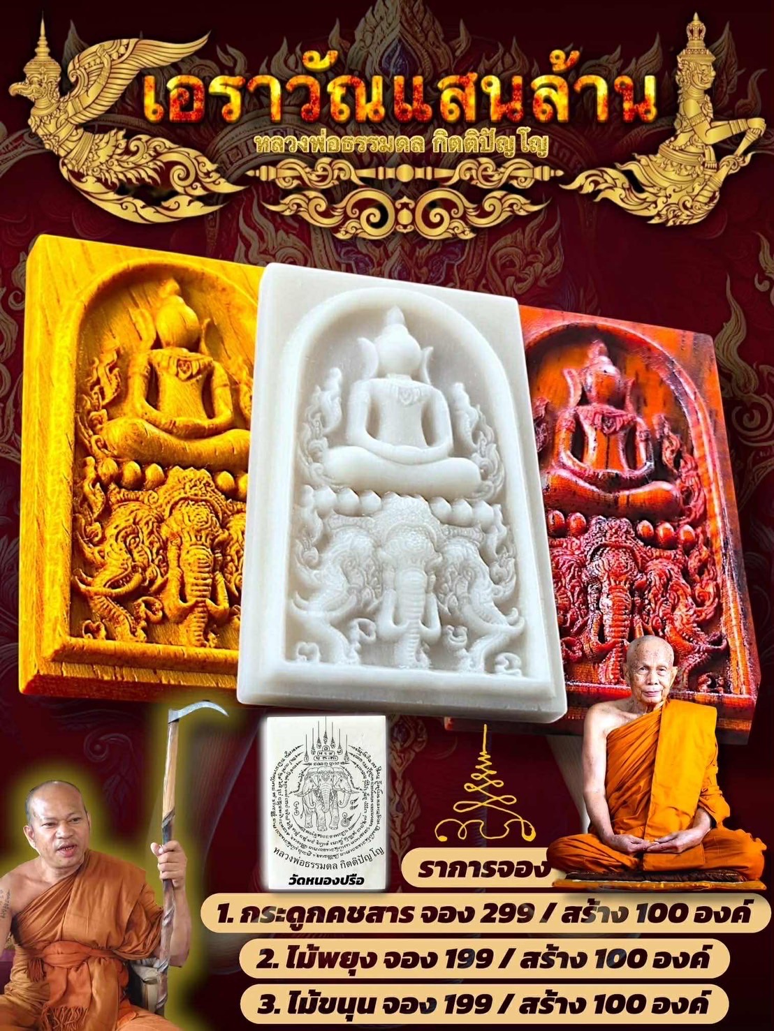เปิดรับจองบูชา รุ่น เอราวัณพันล้าน อธิษฐานจิตโดย หลวงพ่อธรรมดล กิตติปัญโญ วัดหนองปรือ จ.นครราชสีมา หลวงปู่เวิน คุเณสโก วัดบูรพาโคกเคลือ สมเด็จทรงช้างเอราวัณ กระดูกคชสารแกะ 299 บาท (สร้าง 100 องค์) ไม้ขนุนแกะ 199 บาท (สร้าง 100 องค์) ไม้พยุงแกะ 199 บาท(สร้าง 100 องค์) ปิดรอบสิ้นเดือนตุลาคม