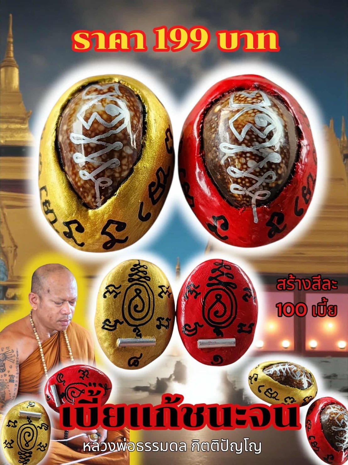 เบี้ยแก้ชนะจน หลวงพ่อธรรมดล กิตติปัญโญ วัดหนองปรือ อ.ปักธงชัย จ.นครราชสีมา ราคาลูกละ 199 บาท มี 2 สีให้เลือก สีทอง สีแดง สร้างสีละ 100 ลูก บรรจุปรอทน้ำสูตรโบราณ และลูกตะกั่วโบราณเขย่ามีเสียง ยันต์นะหัวใจเศรษฐี อักขระยันต์มีพุทธคุณที่เสริมการเงิน การงาน โชคลาภ ความรัก เมตตามหาเสน่ห์มีกินมีใช้ตลอด แก้กันภัยจากสิ่งที่ไม่ดีทุกด้านพกติดตัวไว้ปลอดภัยตลอดทาง