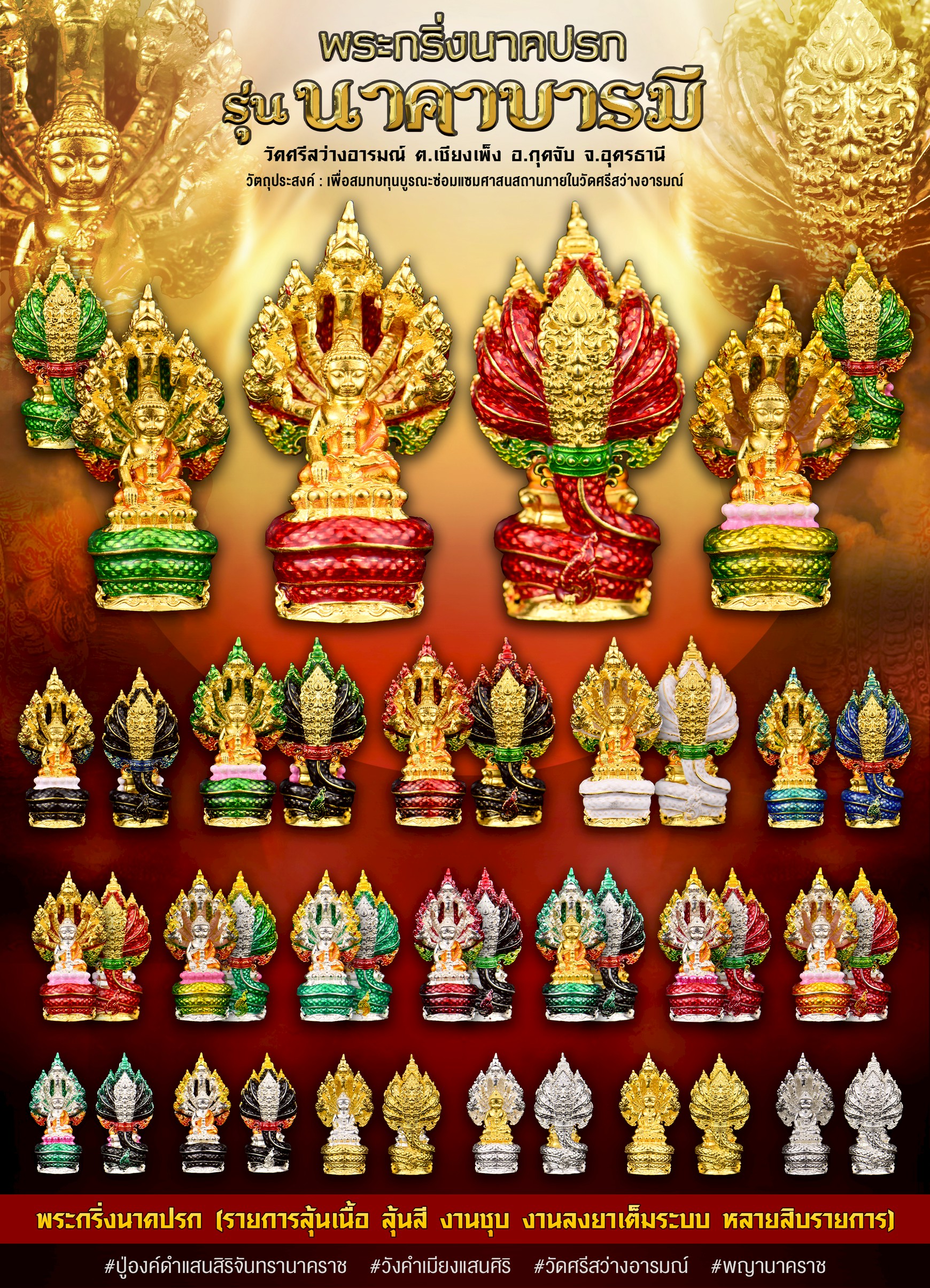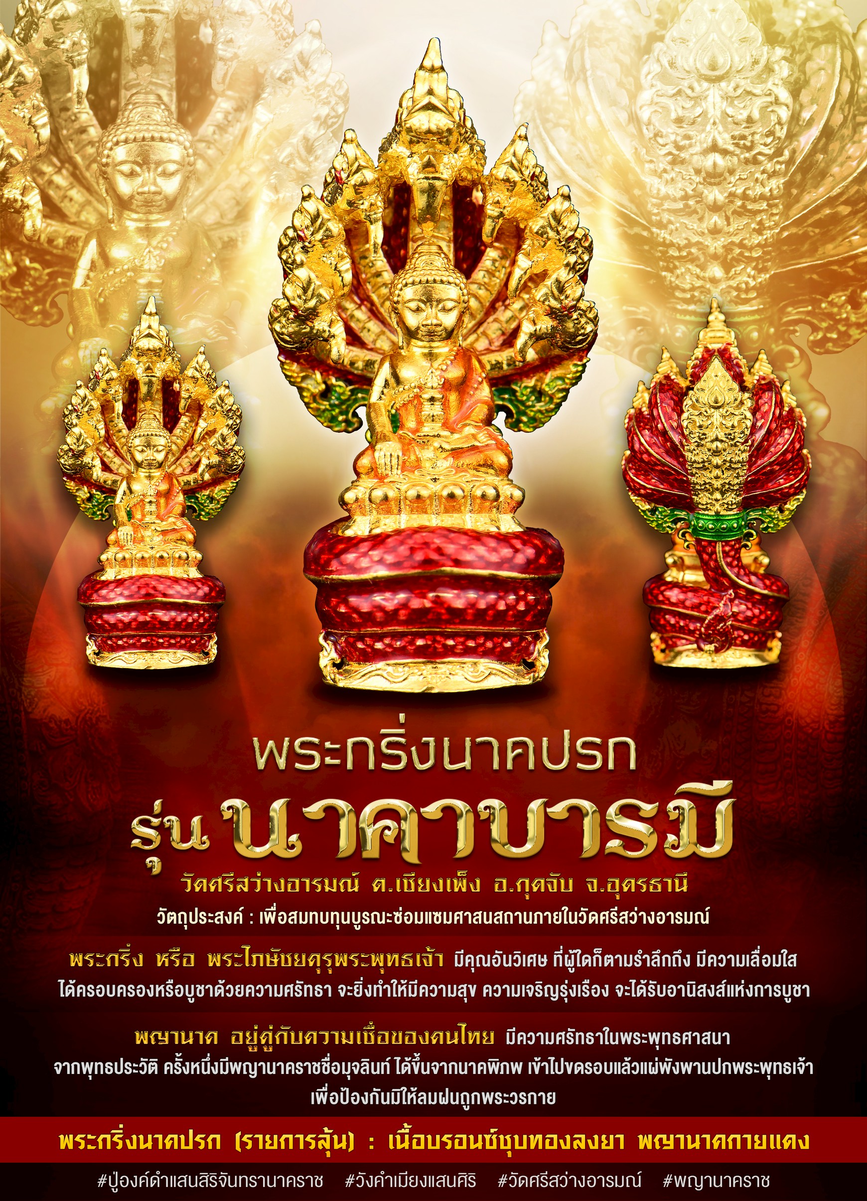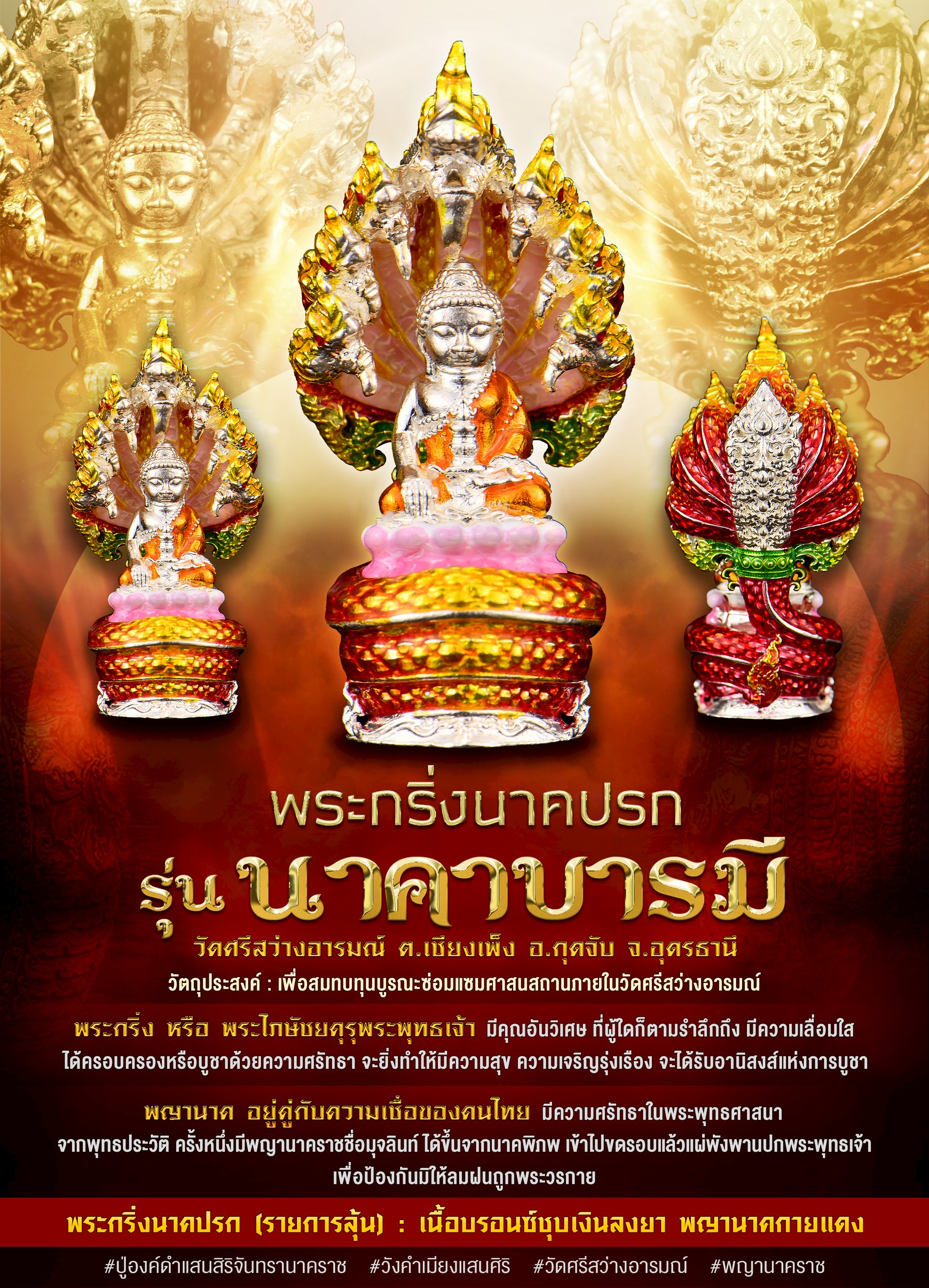 พระกริ่งนาคปรก รุ่น นาคาบารมี วัดศรีสว่างอารมณ์ จ.อุดรธานี พระกริ่ง หรือ พระไภษัชยคุรุพระพุทธเจ้า มีคุณอันวิเศษ ที่ผู้ใดก็ตามรำลึกถึง มีความเลื่อมใส ได้ครอบครองหรือบูชาด้วยความศรัทธา จะยิ่งทำให้มีความสุข ความเจริญรุ่งเรือง จะได้รับอานิสงส์แห่งการบูชา พญานาค อยู่คู่กับความเชื่อของคนไทย มีความศรัทธาในพระพุทธศาสนา จากพุทธประวัติ ครั้งหนึ่งมีพญานาคราชชื่อมุจลินท์ ได้ขึ้นจากนาคพิภพ เข้าไปขดรอบแล้วแผ่พังพานปกพระพุทธเจ้า เพื่อป้องกันมิให้ลมฝนถูกพระวรกาย งานนี้ เปิดจองแบบลุ้นรายการ สำหรับผู้ที่ศรัทธา ให้ได้รับผลงานที่ทรงคุณค่า งดงาม ในราคาที่จับต้องได้ ทั้งหมดเป็นรายการลุ้น(คละเนื้อ) จัดสร้าง 1,500 องค์ องค์ละ 400 บาท หรือแบบ ยกกล่อง (รับพระ 30 องค์ ไม่ซ้ำ) กล่องละ 12,000 บาท แถมยกลังรายการพิเศษ 1 องค์ การันตีเงิน นวะ มาสเตอร์พีช ลงยา งานชุบ เต็มระบบ