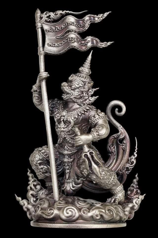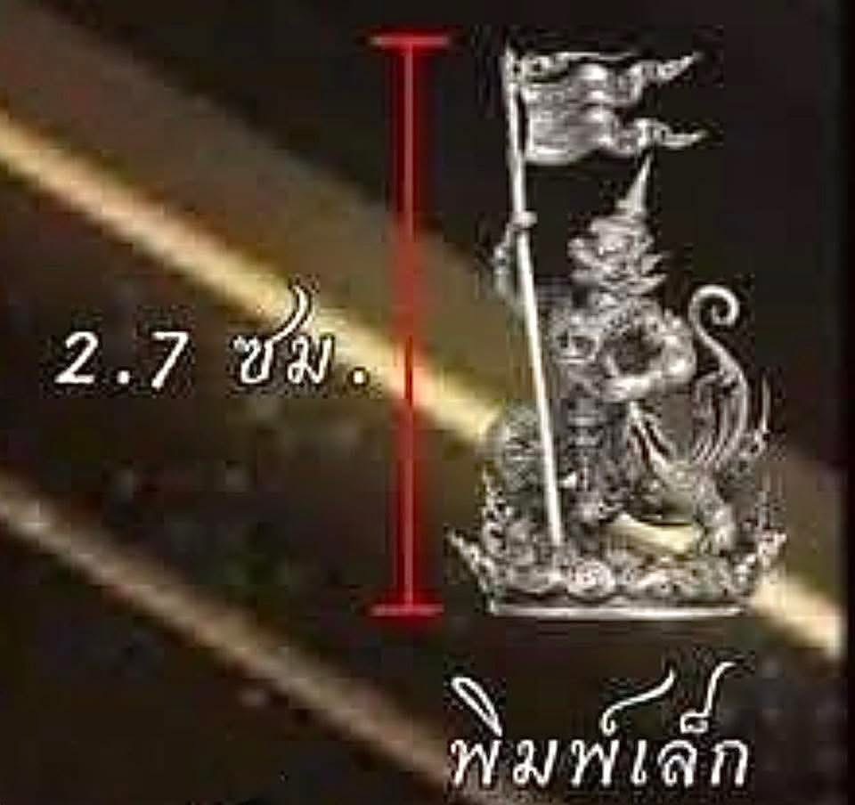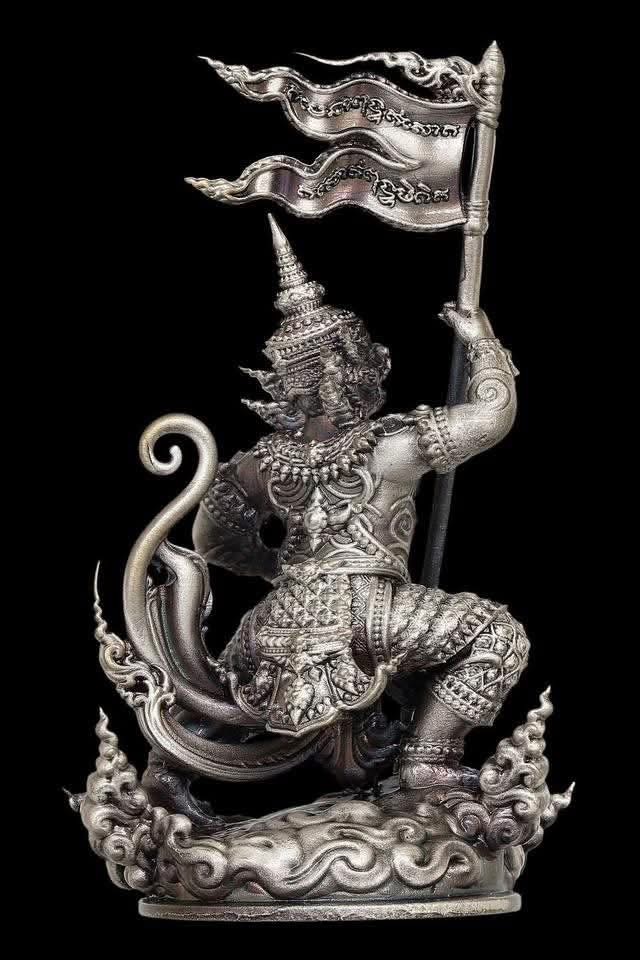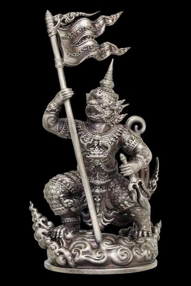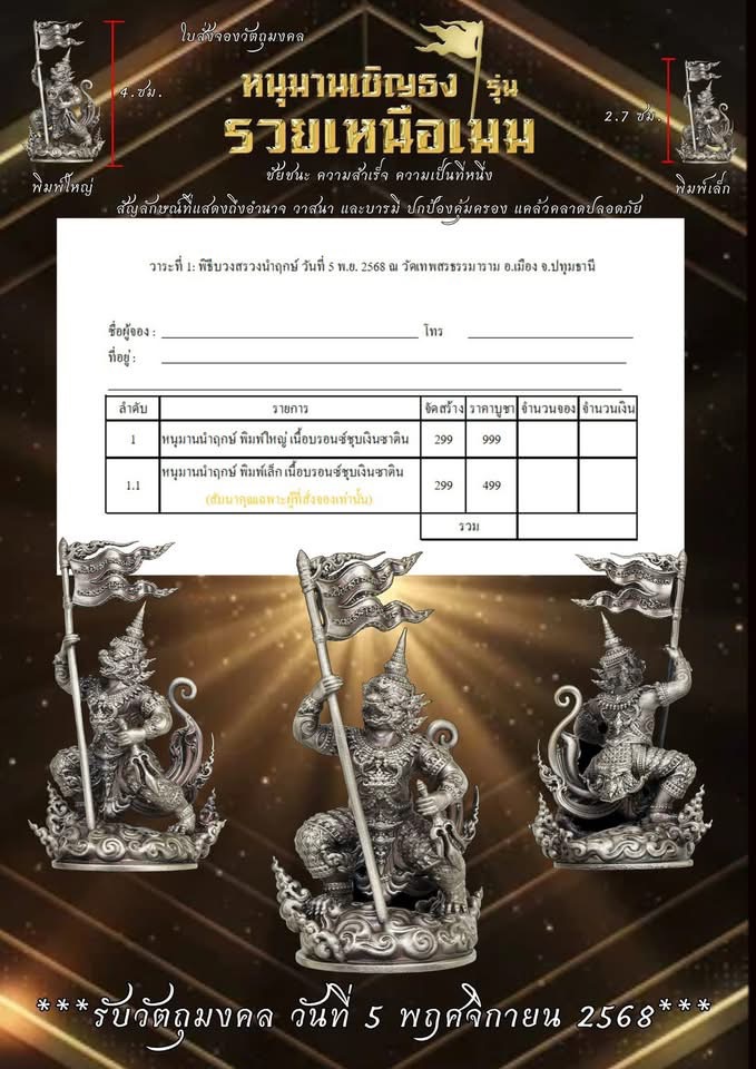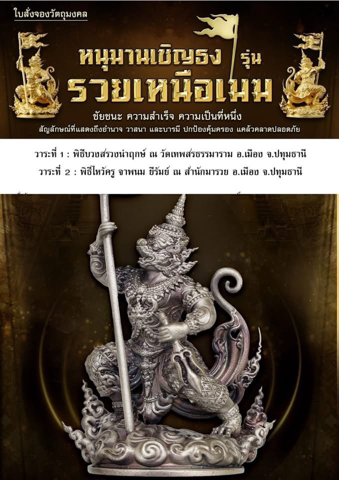 หนุมานเชิญธง รุ่น รวยเหนือเมฆ พิมพ์ใหญ่ สูง 4 cm นำฤกษ์ บรอนซ์ชุบเงินซาติน พิมพ์ใหญ่ แถม พิมพ์เล็ก สั่งจอง ชุดละ 999 บาท (สร้าง 299 ชุดเท่านั้น) พิมพ์เล็ก สูง 2.7 cm สั่งจอง 499 ออกแบบและควบคุมการผลิตโดย โทนี่ จา (จาพนม ยีรัมย์) ชัยชนะ ความสำเร็จ ความเป็นที่หนึ่ง สัญลักษณ์ที่แสดงถึงอำนาจ วาสนา และบารมี ปกป้องคุ้มครอง แคล้วคลาดปลอดภัย วาระที่ 1 : พิธีบวงสรวงนำฤกษ์ 5 พฤศจิกายน 2568 เวลา 09.00 u. ณ วัดเทพสรธรรมาราม จ.ปทุมธานี วาระที่ 2 : พิธีไหว้ครู จาพนม ยีรัมย์ ณ สำนักมารวย อ.เมือง จ.ปทุมธานี ปี 2569